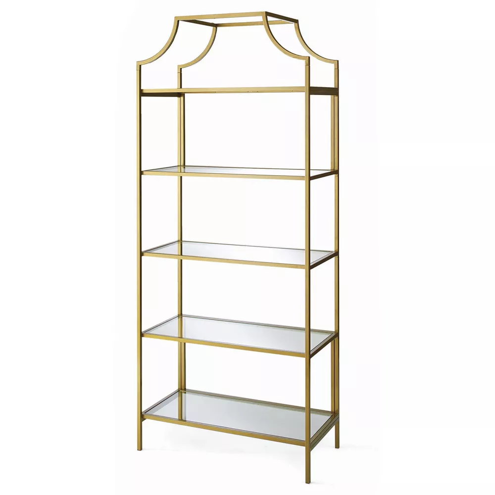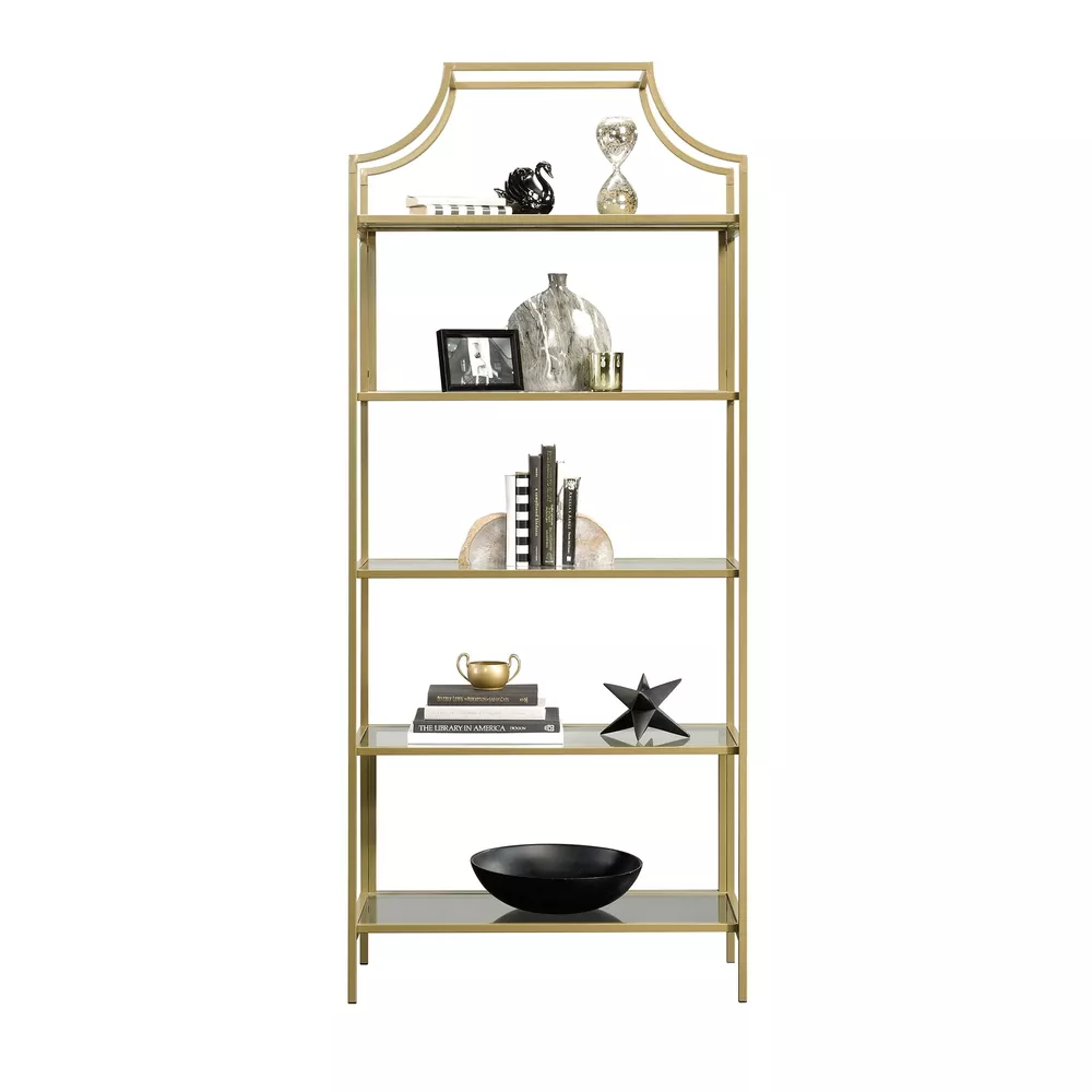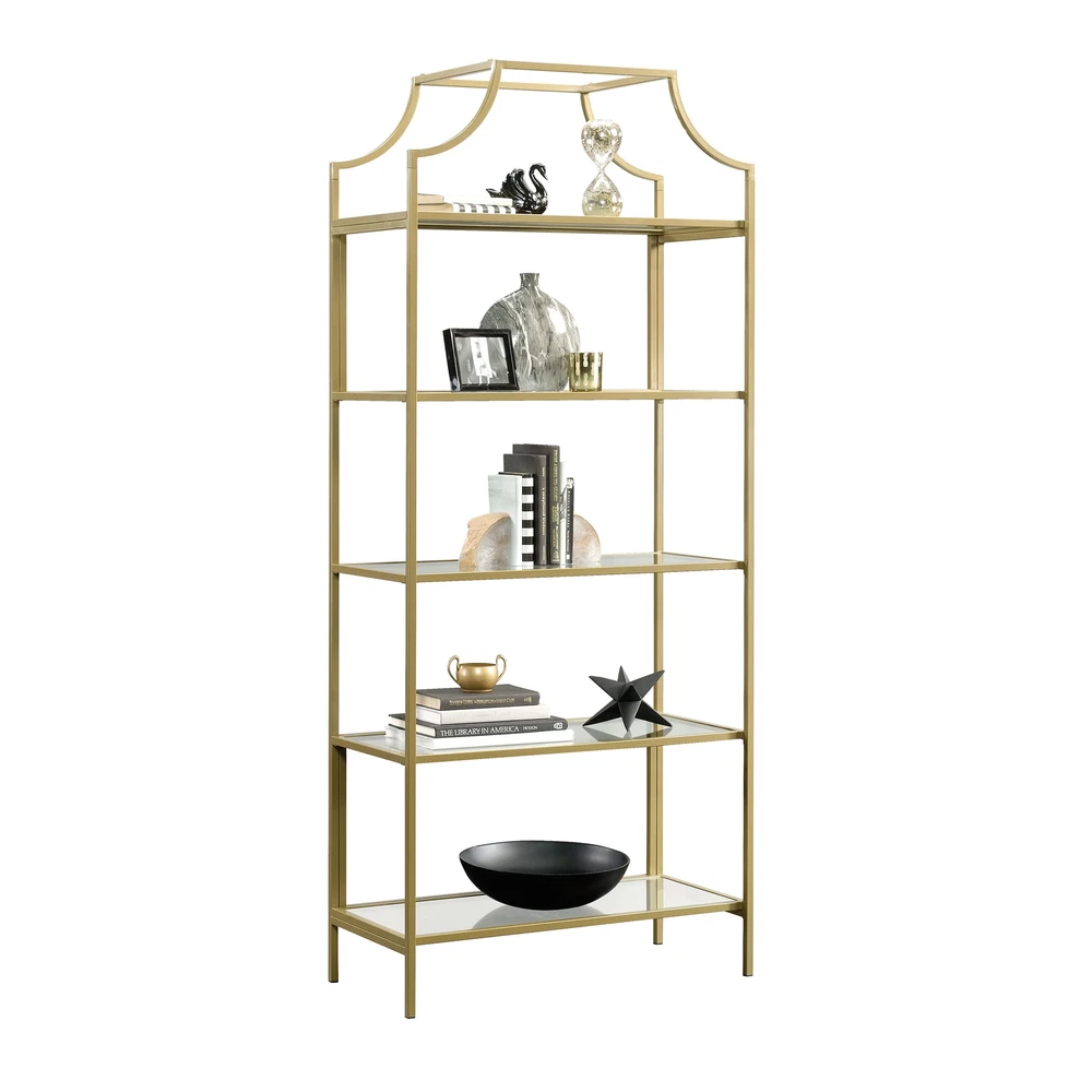 All that glitters is gold. Become a shooting star and break the mold by adding a touch of luxurious style to your living space with this exquisite multi-tiered bookcase from the Nola collection. This multi-tiered bookcase features five open shelves, each with a safety tempered glass surface, adding a touch of style to your home decor. These glass shelves are the perfect place to store books, folders, and other household essentials. Switch it up and use it as a display area to showcase photos of your family, a vase filled with flowers, or any other items that are most precious to you in life. Its rounded edges and curved indented design give it a stunning and unique look that is sure to catch the attention of your friends and family. Made of solid metal with a gold-plated , this sleek and elegant bookcase adds a classic beauty to any room and lets you live in luxury. Be sure to check out the Better Homes & Gardens Nola collection for more great items! Assembled dimensions: 30.00"L x 14.49"W x 70.87"H Open shelving for storing and displaying books, binders, photo frames, collectibles, and more Safety tempered glass shelves for added detail Metal construction for durability Model: 422296 Box dimensions: 65.75"L x 17.13"W x 6.89"H