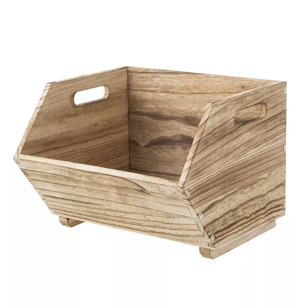 The Better Homes & Gardens Natural Wood Stacking Bin Set, 2-Piece allows you to tidy up your space in an attractive manner. These bins measure 11.02" L x 10" W x 8.27" H, and are sized to ideally be placed on a shelf, tabletop, or even the floor. You can stack them on top of one another to help conserve space or display them individually. Crafted of sturdy wood materials, these baskets are a great option for storing toiletries, cleaning supplies, remotes, small electronics, books, and much more. These lovely baskets are designed with two reliable cut-out handles to easily carry and move your stored items. The Better Homes & Gardens Natural Wood Stacking Bin Set, 2-Piece is perfect for bringing more organization and order to any space. The versatile natural tone beautifully complements a wide variety of home décor styles. This item can also be stained for a DIY project. Includes two stackable baskets Cut-out handles for easy transport Durable wood construction Versatile natural tone Can be stained for DIY projects