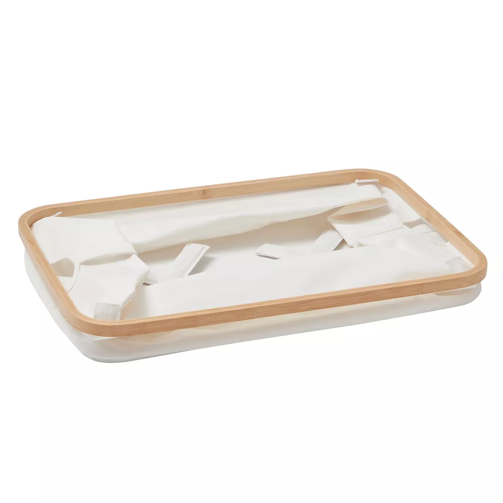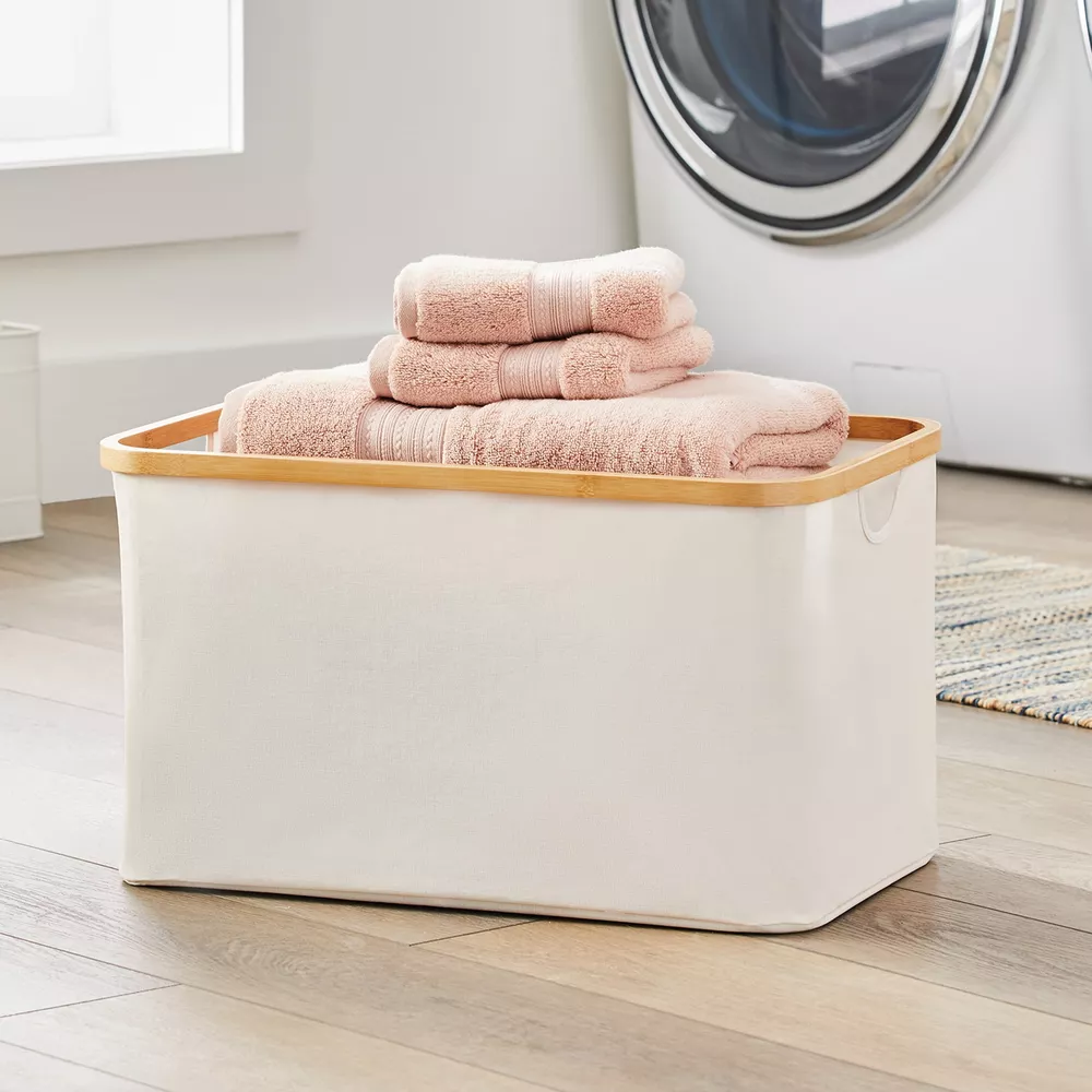 Freshen up your laundry routine with the Better Homes & Gardens Ivory Collapsible Canvas Laundry Basket. This fabric basket features an ivory canvas design with a bamboo rim, and convenient cut-out handles for carrying. The inner portion of the basket has a water-resistant coating that makes it easy to wipe clean. Perfect for space spaces, this rectangular hamper is 21 inches long, 14 inches wide, and 12 inches tall and collapses flat for easy, space-saving storage when it is not in use. This versatile storage basket can be used in the laundry room to hold clothes, in the bathroom to store towels and bath items, or throughout your home to organize small items. Better Homes & Gardens Collapsible Ivory Laundry Basket Collapsible laundry basket for easy storage Ivory canvas design complemented by a bamboo rim Convenient cutout handles for effortless carrying Constructed from durable polyester/cotton fabric with bamboo rim and Velcro side inserts Waterresistant inner coating for easy cleaning