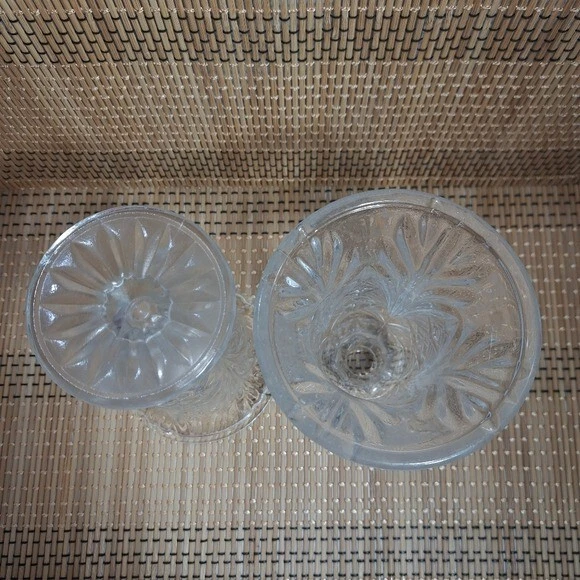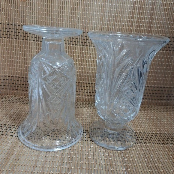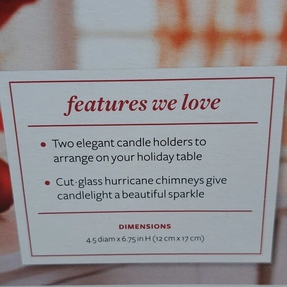 Better Homes and Gardens Crystalline Set of 2 Hurricane Cadle Holders *Brand - Better Homes and Gardens *Set of 2 Hurricane Cadle Holders *Color - Clear (Crystalline) *Condition - Excellent (New) *Please see all the photos in Zoom to appreciate the details. (Please check for all the sizes on some of the pictures from above) *I described this product the best way possible. *If you have any questions, please let me know.