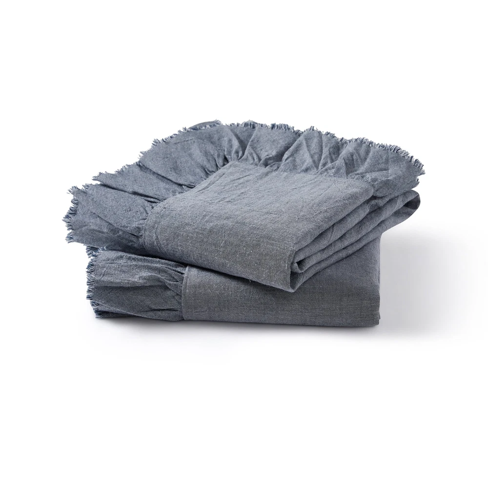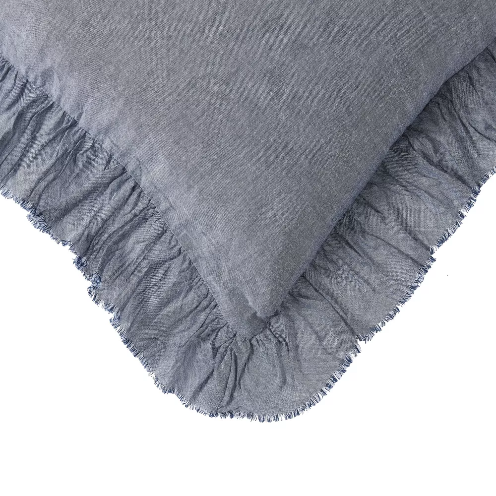 A playful decorative accent for your master bedroom, guest room, or dorm décor, this pillow sham set features blue chambray material with a 2.5-inch ruffled flange around the perimeter for a fun flair. The set includes two standard size pillow shams, measuring 20 inches x 28 inches each. Each sham is made of 100% cotton material that has been prewashed for extra softness and comfort. This pillow sham set is machine washable — you can keep it looking and feeling fresh by machine washing in cold water and drying on low setting. 2-piece standard pillow sham set Features blue chambray fabric and ruffled trim Designed to fit standard pillows – 20 inches x 28 inches with a 2.5-inch flange Made of 100% cotton – prewashed for extra softness Machine washable for quick and easy care