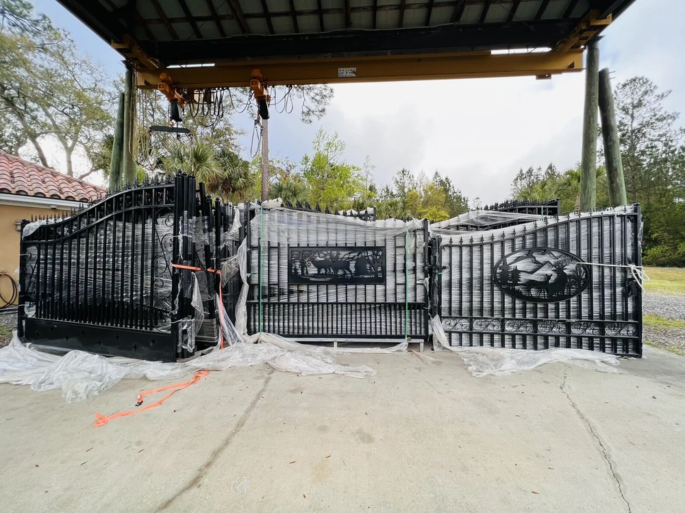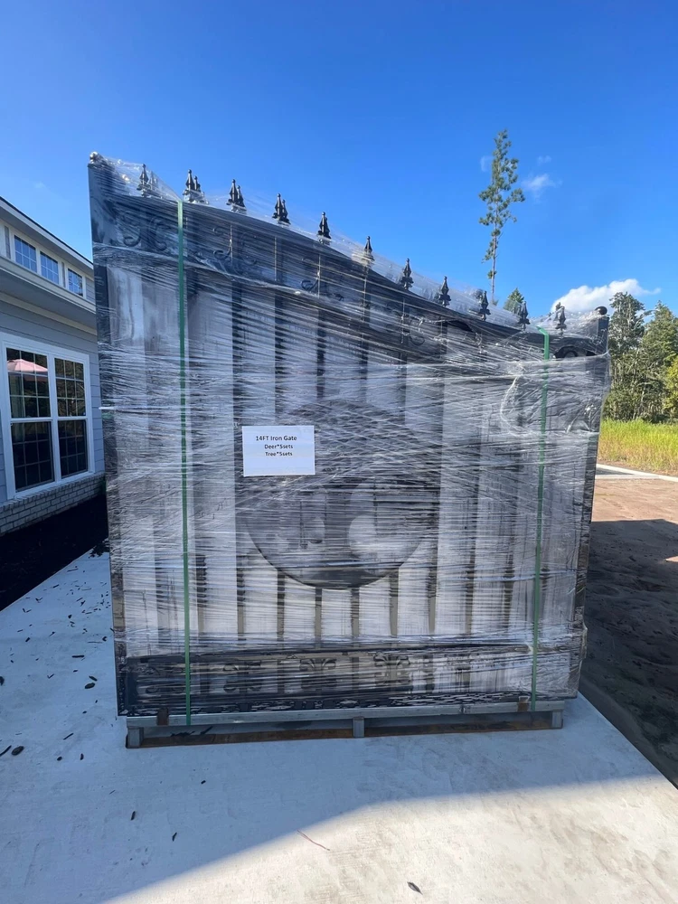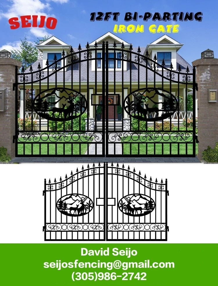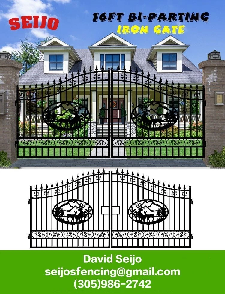⚒️⚒️⚒️⚒️ PRICE IS FIRM ⚒️⚒️⚒️⚒️ My price is way better! 💵💵💵💵💵 CASH ONLY 💵💵💵💵💵 Prices are: $1500 20' $1400 16' $1350 14' $1300 12' 🏚️ Posts are also available the set $250 🏚️ Im located passing the line of Florida/Georgia in Brunswick GA and about 40min from Jacksonville FL and an hour from Savannah GA 🚧 This Bi Dual Swing Wrought Iron Steel with double coated Gate for Driveway is affordable and high quality, and it is a good choice for homeowners, landscapers, masons, garden, and swimming pool builders. 🚧 ⛩️ A wrought iron gate is a good investment to add curb appeal and value to your private property. Adding more romantic and luxury to your favorite place, your home is more shining and artistic. ⛩️ 🏚️ Seijo's Fencing wrought iron gate has a long, durable life, and it separates your private space from outsides, and it provides a practical barrier for your home. 🏚️ 🗽 Models: are all bi-duals: 🗽 12ft two gates of 6ft 14ft two gates of 7ft 16ft two gates of 8ft 20ft two gates of 10ft Bi-Parting Wrought Iron Gate. With artwork "DEER" "OAK TREES" "HORSES" Contemporary style. Three different to chose from. Specification: Length Height Width 14' 14ft 💡 7.6 ft 0.21ft 16' 16ft 💡 7.6 ft 0.21ft 18' 18ft 💡 7.6 ft 0.21ft 20' 20ft 💡 7.6 ft 0.21ft Inner Frame: 25*25*1.2mm steel frame Outer Frame: 50*50*2mm steel tube Frame Material: metal Metal Type: Wrought Iron Pressure Treated Wood Type: Heat Treated Frame Finishing: Powder Coated Feature: Easily Assembled, Rodent Proof, Rot Proof, Waterproof, Easy, Durable Type: Fencing, Trellis & Gates Capacity: Could bear more than 80KG Color: black Feature: Strong structure with an aesthetic European classic art design Have excellent climate resistance ability, durable in hot, humid, dry climates Erosion resistance and temperature change resistance, long-lasting in every condition Tough paint coating, powerful adhesive ability. The ornamental wrought iron component is an alternative, and you can choose from our selections. They can be collocated optionally to ensure variousness of our products and the construction is flexible and convenient. ▶️ Main Gate frame: 2inch x 2inch ▶️ Horizontal pipe:1-5/8inch x 1inch ▶️ Vertical picket: 3/4inch x 3/4inch ▶️ Gate post: 4inch x 5inch x 2.5meter high ▶️ Surface treatment: galvanized and powder coated Color:black Gate size: 1.8meter high x 4meter wide, 1.8mter high x 5meter wide, 1.8meter x 6meter ⏸️⭐️ Highest point 7ft lowest point 6ft ⭐️⏸️ (1.8meter high in lowest point, 2meter high in highest point) Or 12ft wide, 14ft wide, 16ft wide, 20ft wide. David (305)986-2742 https://seijosfencing.com