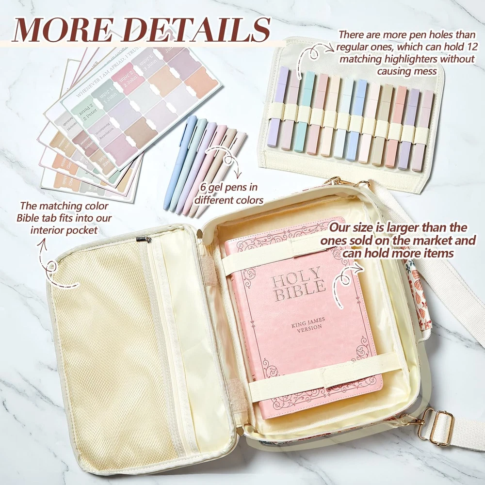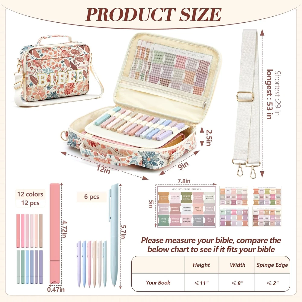 Fast Shipping Great Customer Support Satisfaction Guaranteed DESCRIPTION Shipping Shipping Shipping All domestic packages are shipped for Free (Unless other shipping method was selected during the checkout) Most items ship and arrive much sooner than the estimate delivery date. Usually within 2-3 days from payment. However, we have longer estimates to compensate for the occasional delay or supply chain breakdown. We do not accept P.O. BOXES - PLEASE PROVIDE A PHYSICAL ADDRESS Return Return Return In the event that you would like to return your purchase, we allow returns that are processed within the defined return date (the return date is to be found in the return policy/shipping and handling section) Please contact us for a return authorization and the return shipping address. Payment Payment Payment PayPal is our preferred method of payments it's the quickest, easiest and most secure way to pay for your goods or services online. PayPal offers buyer and seller protection should there be a problem. If you do not have a PayPal account, to get started and buy your first item with us is very easy. Simply click on the 'Buy It Now' button and follow the eBay checkout steps. Select PayPal as the payment method you then will be given the chance to enter your card details in to PayPal's secure checkout in order to pay for your order. Once the payment has been made, you will then be given the opportunity to make your own PayPal account to make paying for your items in the future very easy. Should there be a problem with payment please do let us know. Feedback Feedback Feedback Customer satisfaction is very important to us. If you have any problem with your order,please contact us and we will do our best to make you satisfied, please do not leave a negative feedback before we resolve your problem. We guarantee that your issue will be solved quickly. As long as you are happy with your purchase of , please leave us a positive feedback. Your feedback is very important to us it affects our search placement on eBay. We will leave a positive feedback for you in return automatically once we receive your feedback. Contact Us Contact Us Contact Us If you have any queries, please contact us via ebay. We usually respond within 24 hours on weekdays. Thank you for visiting our ebay store! Quality and Craftsmanship: experience the comfort of bible bag protection with our waterproof PU material bible cover; Crafted with a light color palette and featuring exquisite towel embroidery that adds a touch of class to your bible study; This Bible carrying case is about 12 x 9 x 2.5", Our size is larger than the ones sold on the market and can hold more items; it safeguards your sacred texts from wear and tear; Its sturdy handle and shoulder strap allow for ease of carriage Multipurpose Bible Organizer: our Bible cover isn't just beautiful; It's functional too; Boasting a front pocket and several interior organization pockets, it ensures your bible study supplies are always well arranged; The zippered pockets provide an extra layer of protection for your items, and it's easy to carry, thanks to the shoulder strap and handle Ideal Bible Study Accessories: nothing enhances bible study like the right tools; We include 12 assorted color highlighters and 6 color core manual pens, suitable for penning down your notes and thoughts without smearing or soiling your hands; These writing tools offer a smooth, elegant writing experience; Also, they're compact and easy to store in the inner pocket of the bible bag Convenient Labeling: with the set of light color Bible labels included in our kit, finding books and passages becomes a breeze; The tabs feature clear, easy to read fonts and vibrant printing that simplifies your bible referencing tasks Stylish Bible Carrying Case and Organization Kit: this bible organizer kit is not just a tool; It's a statement of style and quality; Suitable for use in various occasions, from bible study sessions to travel and day to day use; With its wide range of accessories and sturdy design, the kit makes a thoughtful gift for family, friends, colleagues, students, and teachers on holidays and special occasions; Spread the joy of an organized, stylish bible study experience Bible Cover Case for Women with Tabs 6 Gel Pens & 12 Highlighters, Tote Bag Click here to see description Fast Shipping Great Customer Support Satisfaction Guaranteed DESCRIPTION Shipping All domestic packages are shipped for Free (Unless other shipping method was selected during the checkout) We ship within two business days of payment, usually sooner Standard FREE shipping takes between 3-5 business days Expedited shipping takes between 2-3 business days Overnight shipping takes between 1-2 business days We do not accept P.O. BOXES - PLEASE PROVIDE A PHYSICAL ADDRESS We Ship Globally using ebay's GSP, the item is sent to a logistic center in KY and shipped from there to the rest of the world. International customers are responsible for all duties and taxes Contact your local authority for questions related to the amount of duties or taxes you will be responsible for Return In the event that you would like to return your purchase, we allow returns that are processed within the defined return date (the return date is to be found in the return policy/shipping and handling section) Please contact us for a return authorization and the return shipping address. Please contact us for a Return Merchandise Authorization (RMA) number. We advise you to use a reputable carrier service when returning your goods. Please pack all returns appropriately. We ship globally Via eBay's global shipping program (GSP). Thus we don't cover returns for items shipped globally. Buyers returning such items will be refunded ONLY for the item's cost and not for the shipping. please check the Voltage information and make sure it matches the one in your country. In case it's not stated in the description, do ask us. Payment PayPal is our preferred method of paym