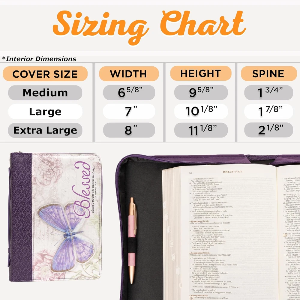 Fast Shipping Great Customer Support Satisfaction Guaranteed DESCRIPTION Shipping Shipping Shipping All domestic packages are shipped for Free (Unless other shipping method was selected during the checkout) Most items ship and arrive much sooner than the estimate delivery date. Usually within 2-3 days from payment. However, we have longer estimates to compensate for the occasional delay or supply chain breakdown. We do not accept P.O. BOXES - PLEASE PROVIDE A PHYSICAL ADDRESS Return Return Return In the event that you would like to return your purchase, we allow returns that are processed within the defined return date (the return date is to be found in the return policy/shipping and handling section) Please contact us for a return authorization and the return shipping address. Payment Payment Payment PayPal is our preferred method of payments it's the quickest, easiest and most secure way to pay for your goods or services online. PayPal offers buyer and seller protection should there be a problem. If you do not have a PayPal account, to get started and buy your first item with us is very easy. Simply click on the 'Buy It Now' button and follow the eBay checkout steps. Select PayPal as the payment method you then will be given the chance to enter your card details in to PayPal's secure checkout in order to pay for your order. Once the payment has been made, you will then be given the opportunity to make your own PayPal account to make paying for your items in the future very easy. Should there be a problem with payment please do let us know. Feedback Feedback Feedback Customer satisfaction is very important to us. If you have any problem with your order,please contact us and we will do our best to make you satisfied, please do not leave a negative feedback before we resolve your problem. We guarantee that your issue will be solved quickly. As long as you are happy with your purchase of , please leave us a positive feedback. Your feedback is very important to us it affects our search placement on eBay. We will leave a positive feedback for you in return automatically once we receive your feedback. Contact Us Contact Us Contact Us If you have any queries, please contact us via ebay. We usually respond within 24 hours on weekdays. Thank you for visiting our ebay store! Durable: Protect your Bible from life’s mishaps with this purple fashion Bible cover for men and women made from sturdy faux leather material that is easy to clean and will withstand daily wear. Scripture Bible Case: This stylish purple case features scripture sentiment from Jeremiah 17:7 over a floral/butterfly design. A panel debossed with a flower motif wraps around the spine and back. Convenient Accessories: Handle is easy to hold, or slip this Bible cover into a larger bag for easy travel to church or Bible Study. Interior pen loop secures your pen or highlighter when not in use. Secure Zipper Closure: Ensures your Bible stays clean and safe inside. Slip your loose notes, bulletins, or tissues inside for easy storage. Bible Cover for Women Blessed Butterfly Jeremiah 17:7 Purple Floral XL Click here to see description Fast Shipping Great Customer Support Satisfaction Guaranteed DESCRIPTION Shipping All domestic packages are shipped for Free (Unless other shipping method was selected during the checkout) We ship within two business days of payment, usually sooner Standard FREE shipping takes between 3-5 business days Expedited shipping takes between 2-3 business days Overnight shipping takes between 1-2 business days We do not accept P.O. BOXES - PLEASE PROVIDE A PHYSICAL ADDRESS We Ship Globally using ebay's GSP, the item is sent to a logistic center in KY and shipped from there to the rest of the world. International customers are responsible for all duties and taxes Contact your local authority for questions related to the amount of duties or taxes you will be responsible for Return In the event that you would like to return your purchase, we allow returns that are processed within the defined return date (the return date is to be found in the return policy/shipping and handling section) Please contact us for a return authorization and the return shipping address. Please contact us for a Return Merchandise Authorization (RMA) number. We advise you to use a reputable carrier service when returning your goods. Please pack all returns appropriately. We ship globally Via eBay's global shipping program (GSP). Thus we don't cover returns for items shipped globally. Buyers returning such items will be refunded ONLY for the item's cost and not for the shipping. please check the Voltage information and make sure it matches the one in your country. In case it's not stated in the description, do ask us. Payment PayPal is our preferred method of payments it's the quickest, easiest and most secure way to pay for your goods or services online. PayPal offers buyer and seller protection should there be a problem. If you do not have a PayPal account, to get started and buy your first item with us is very easy. Simply click on the 'Buy It Now' button and follow the eBay checkout steps. Select PayPal as the payment method you then will be given the chance to enter your card details in to PayPal's secure checkout in order to pay for your order. Once the payment has been made, you will then be given the opportunity to make your own PayPal account to make paying for your items in the future very easy. Should there be a problem with payment please do let us know. Feedback Customer satisfaction is very important to us. If you have any problem with your order,please contact us and we will do our best to make you satisfied, please do not leave a negative feedback before we resolve your problem. We guarantee that your issue will be solved quickly. As long as you are happy with your purchase of , please leave us a positive feedback. Your feedback is very important to us it affects our search placement on eBay. We will leave a positive feedback f