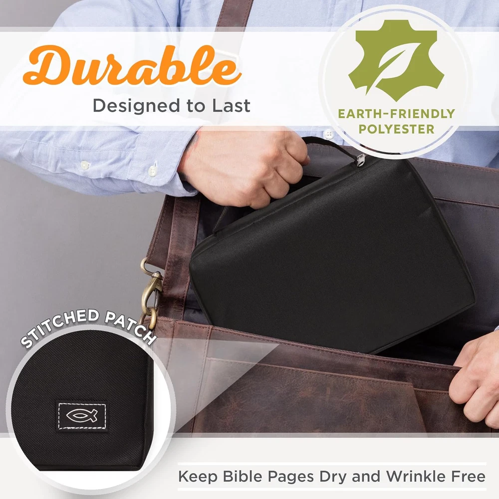 Fast Shipping Great Customer Support Satisfaction Guaranteed DESCRIPTION Shipping Shipping Shipping All domestic packages are shipped for Free (Unless other shipping method was selected during the checkout) Most items ship and arrive much sooner than the estimate delivery date. Usually within 2-3 days from payment. However, we have longer estimates to compensate for the occasional delay or supply chain breakdown. We do not accept P.O. BOXES - PLEASE PROVIDE A PHYSICAL ADDRESS Return Return Return In the event that you would like to return your purchase, we allow returns that are processed within the defined return date (the return date is to be found in the return policy/shipping and handling section) Please contact us for a return authorization and the return shipping address. Payment Payment Payment PayPal is our preferred method of payments it's the quickest, easiest and most secure way to pay for your goods or services online. PayPal offers buyer and seller protection should there be a problem. If you do not have a PayPal account, to get started and buy your first item with us is very easy. Simply click on the 'Buy It Now' button and follow the eBay checkout steps. Select PayPal as the payment method you then will be given the chance to enter your card details in to PayPal's secure checkout in order to pay for your order. Once the payment has been made, you will then be given the opportunity to make your own PayPal account to make paying for your items in the future very easy. Should there be a problem with payment please do let us know. Feedback Feedback Feedback Customer satisfaction is very important to us. If you have any problem with your order,please contact us and we will do our best to make you satisfied, please do not leave a negative feedback before we resolve your problem. We guarantee that your issue will be solved quickly. As long as you are happy with your purchase of , please leave us a positive feedback. Your feedback is very important to us it affects our search placement on eBay. We will leave a positive feedback for you in return automatically once we receive your feedback. Contact Us Contact Us Contact Us If you have any queries, please contact us via ebay. We usually respond within 24 hours on weekdays. Thank you for visiting our ebay store! Durable: Protect your Bible from life’s mishaps with this stylish black Bible cover for men/women made from sturdy poly-canvas material that is easy to clean and will withstand daily wear. Scripture Bible Cover: This fashionable black case makes a great gift for loved ones, featuring the Christian fish symbol appliqued on the bottom corner. Secure Zipper Closure: Ensures your Bible stays clean and safe inside. Interior and exterior pockets provide extra space for organization. Convenient Accessories: Interior pen loop secures your pen or highlighter when not in use. Handle is easy to hold, and additional back pocket allows for more storage. Value priced, heavy-duty poly-canvas Bible / Book Cover features a rubberized fish applique, a webbing carry handle, an exterior zip pocket and a pen loop inside of the case. Great features at an affordable price. The Medium size accommodates Bibles such as The Holy Bible, NLT Reference Editions, Daily Study Bible for Women and The Life Application Bible - Personal size, or other books and Bibles up to 6 5/8" x 9 5/8" x 1 3/4". Choose Color and Size Bible Cover with Zipper, Jesus Fish Design, Black Canvas, Medium Size Click here to see description Fast Shipping Great Customer Support Satisfaction Guaranteed DESCRIPTION Shipping All domestic packages are shipped for Free (Unless other shipping method was selected during the checkout) We ship within two business days of payment, usually sooner Standard FREE shipping takes between 3-5 business days Expedited shipping takes between 2-3 business days Overnight shipping takes between 1-2 business days We do not accept P.O. BOXES - PLEASE PROVIDE A PHYSICAL ADDRESS We Ship Globally using ebay's GSP, the item is sent to a logistic center in KY and shipped from there to the rest of the world. International customers are responsible for all duties and taxes Contact your local authority for questions related to the amount of duties or taxes you will be responsible for Return In the event that you would like to return your purchase, we allow returns that are processed within the defined return date (the return date is to be found in the return policy/shipping and handling section) Please contact us for a return authorization and the return shipping address. Please contact us for a Return Merchandise Authorization (RMA) number. We advise you to use a reputable carrier service when returning your goods. Please pack all returns appropriately. We ship globally Via eBay's global shipping program (GSP). Thus we don't cover returns for items shipped globally. Buyers returning such items will be refunded ONLY for the item's cost and not for the shipping. please check the Voltage information and make sure it matches the one in your country. In case it's not stated in the description, do ask us. Payment PayPal is our preferred method of payments it's the quickest, easiest and most secure way to pay for your goods or services online. PayPal offers buyer and seller protection should there be a problem. If you do not have a PayPal account, to get started and buy your first item with us is very easy. Simply click on the 'Buy It Now' button and follow the eBay checkout steps. Select PayPal as the payment method you then will be given the chance to enter your card details in to PayPal's secure checkout in order to pay for your order. Once the payment has been made, you will then be given the opportunity to make your own PayPal account to make paying for your items in the future very easy. Should there be a problem with payment please do let us know. Feedback Customer satisfaction is very important to us. If you have any problem with your order,please contact us and