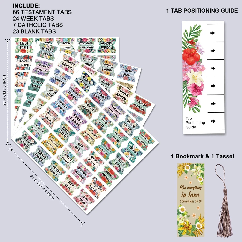 Store New Arrivals Add to Favorite View Feedback Contact Bible Index Tabs New & Old Testament Tabs Matte Laminated Floral Design - 122 Pcs (Floral) Description Item model number CFC165424 Sheet Size Letter (8.5'' x 11'') Color A11 Brand CUALFEC Material Paper Material Type Paper Manufacturer Part Number CFC165424 Item Weight 2.08 ounces Number of Dividers 121 Manufacturer CUALFEC Package Dimensions 9.13 x 6.26 x 0.28 inches Size Floral Cualfec 122pcs floral designed old & new testament index tabs, blank tabs for bibles. Elegant bookmark with beautiful tassels included. Elegant Floral Design: All the stickers and accessories are of beautiful design. Bible tabs and blank tabs are of unique colorful floral design. Make Bible Index Easy: There is easy-fold-line on each stickers for easy folding. Super easy to stick on the bible pages while using with the tab positioning guide, no more mess! Durable & High Quality: The stickers are made of high quality synthetic paper + matte lamination, which is much more durable and tear resistance compares with regular stickers. They are of great stickiness on papers, will not fall off that easily. Bible Index Tabs: Package Include 39 old Testament Tabs + 27 new testament tabs + 24 week tabs + 23 blank tabs + 7 Catholic tabs + 1 tab positioning guide + 1 bookmark with tassels. Product Description Make Your Bible Beautiful and Neat! We designed a beautiful and useful positioning guide card for easy locating. Its length is exactly the same size as some hard cover Bibles. You can apply all the tabs very easily. These tabs will look beautiful and neat on your Bible! The guide card has patterns on both side, perfect to be used a bookmark. Thank you for interest in our Bible tabs! This pack of Bible tabs are of beautiful floral design. There are 39 old Testament Tabs, 27 new testament tabs, 24 week tabs, 30 blank tabs & 1 tab positioning guide in the package. They are super easy to be applied on your Bible. Not only for the Bibles, you can also write whatever you want on the blank tabs with fine permanent markers. We also have many other theme Bible tabs for your choice, please see the links below. Material: Thin & durable vinyl with matte lamination. Easy to Apply: With a easy-fold-line, each tab is ready to be folded. Fully removable when applying. Strong Stickiness & Tear-Resistant: Durable enough for long-term use. Tips: Please heat the tabs such as using a hair dryer before removing when the tabs have been applied on the pages for a long time. ABOUT US We offer the best prices around on high quality products. Our E-store includes media such as books, movies, music and games while offering electronics, toys, sporting apparel, clothing, tools, general home, garden items and more. SHIPPING We are always working hard to ensure your package arrives as soon as possible. Please understand that some factors like weather, high postal traffic, and the performance of shipping companies are outside of our control. We offer free shipping to the lower 48 states and ship within 2 business days of payment, usually sooner. We do not accept P.O. Boxes. Please provide a physical address. RETURNS We offer a 30-Day Return Policy on items which you are not completely satisfied with. You have the option for a full-refund or an exchange of the item. No returns are available on items shipped outside of the USA. PAYMENT We accept PayPal. CONTACT US This page content is yet to come Please ad us to your favorite seller and visit again later Thank You CUSTOMER SATISFACTION We try our very best to make sure every customer is completely satisfied. If there's a problem, message us! We're happy to help.