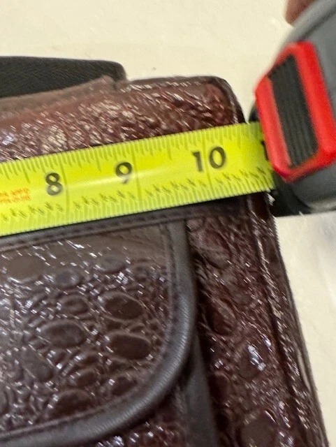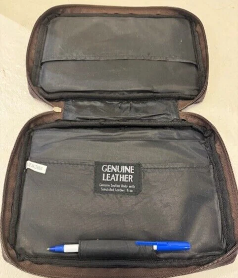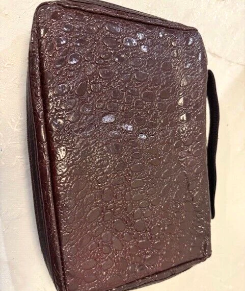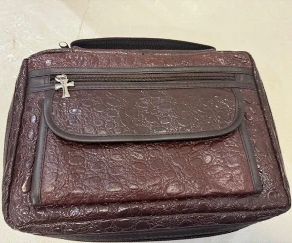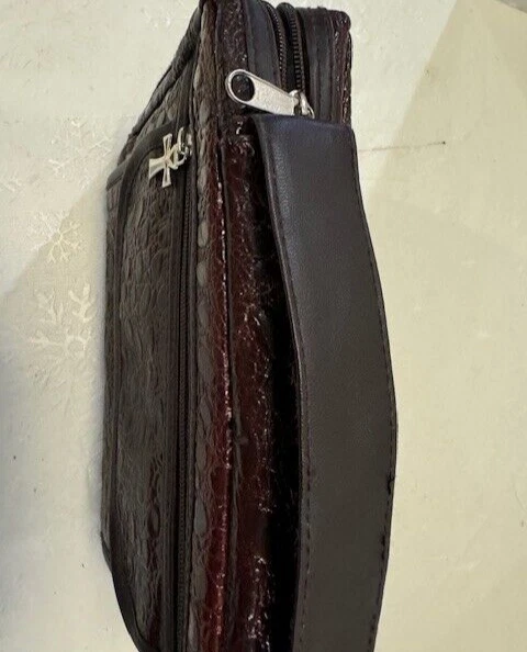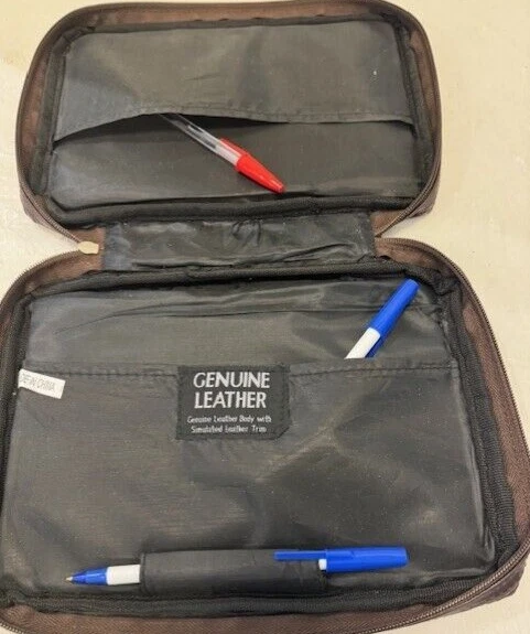 Genuine Leather Book Bag /Carrier to hold Bible, pencils-pens, paper note pad etc. Has a zip outside pocket with hanging cross and 2 inside open pockets. Zips closed all the way around. Handle on top. Approx: 10" x7". Good Condition. Free Shipping (DW-B-17)