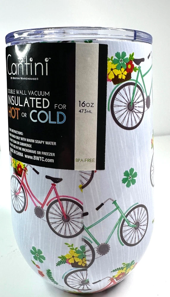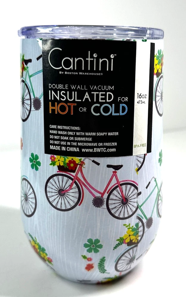 Light Blue Bicycle Graphic Designed Cantini Insulated Travel Mug Cup for Coffee Wine etc. Stainless Steel, Insulated, Double Walled Vacuum. NEW WITH TAGS