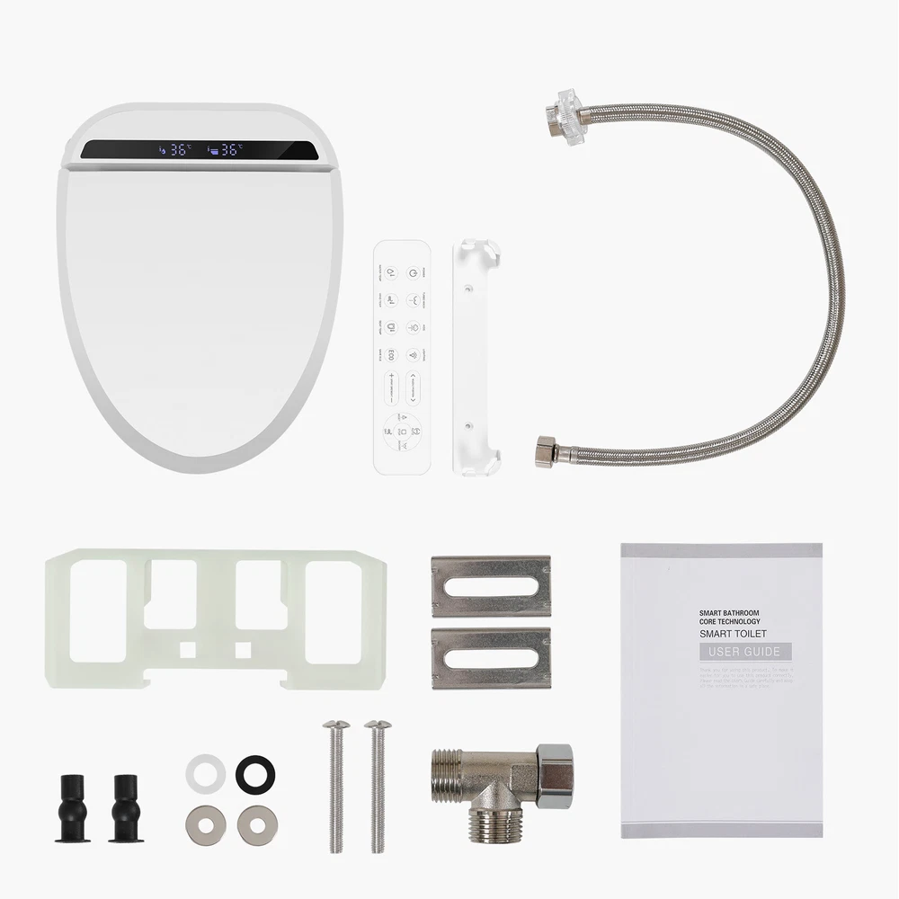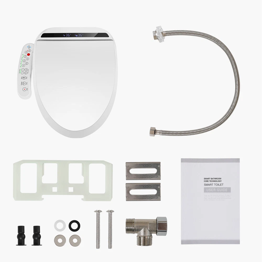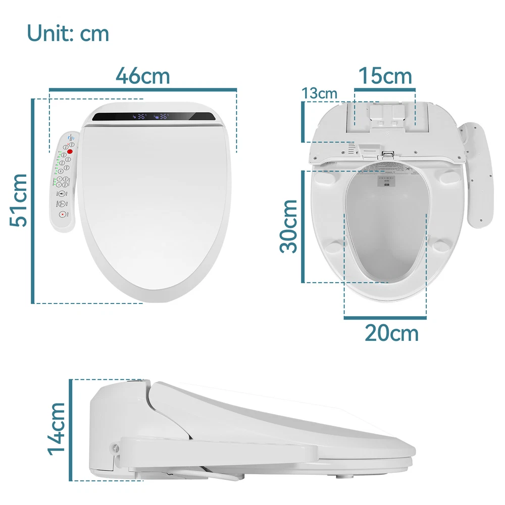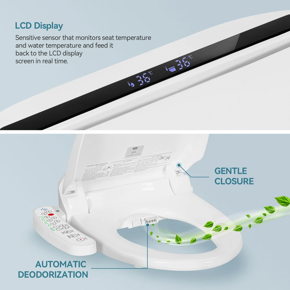 Smart toilet seat, wc shower environmentally friendly energy saving, heated seat toilet shower wc bidet attachment Enjoy a easy way of life for you and your family. Fits well for any family. Features: - Has seat sensor, seat heater, backward wash gear/Oszillationswaschgang, ladies wash gear, car wash gear, self-cleaning nozzle, power/saving function, LED night light. - The intelligent toilet lid only works when the skin touches the sensor section.effectively prevents accidental contact. - Wenn der Benutzer sitzt, wird durch Drücken der Taste die Deo-Funktion aktiviert. Hilft, den Gestank zu entfernen. - The water heater heats the water and the built-in air dryer offers 3 different adjustable temperatures. - Adjustable nozzle position and water pressure, can make better laundry for men and women. Treatment of patients with hemorrhoids. - KID WASH: Special design for the sitting position of children on the toilet. Softer flush, protects the delicate children's skin. - Seat temperature, water temperature, nozzle position and water pressure can be easily adjusted to your preferences. - Das elegante Design passt auf die meisten zweiteiligen Standardtoiletten und fügt sich harmonisch in jeden Badezimmerstil ein. - you can save at least 30% on toilet paper thanks to its environmentally friendly properties. - No plumbing skills or special tools are required. Specification: How do I choose the right size for the ELECWISH seat? 1 - Measure the distance between the tank and the front of the toilet bowl. ≥ 50cm-- Extended size 2 - Measure the distance from the center of the screw holes to the toilet basin, it must be at least 3 cm. 3 - Measure the distance of the mounting holes of the toilet, must be in 14cm ~20cm. Package list: - 1 x Smart toilet seat - 1 x mounting accessories - 1 x Assembly instructions On Dec 12, 2024 at 05:13:19 PST, seller added the following information: