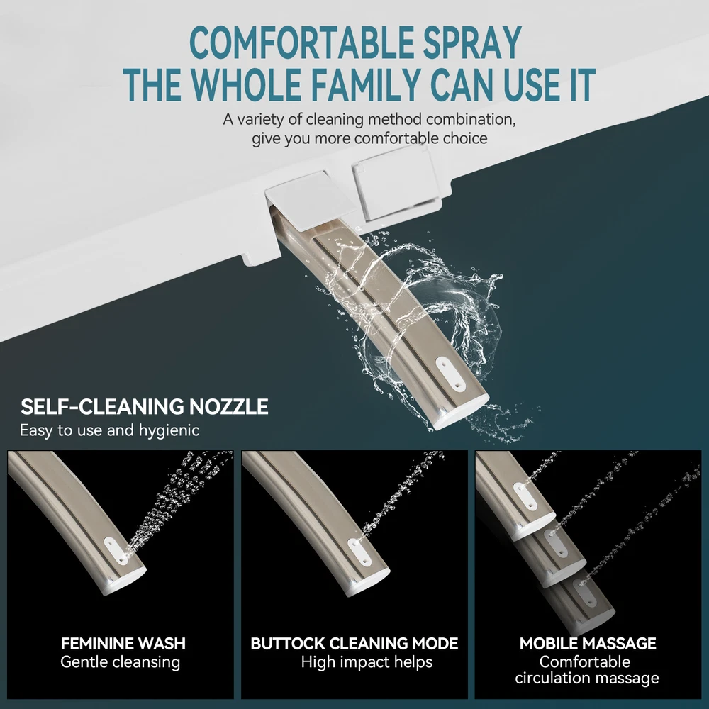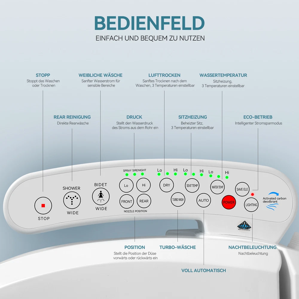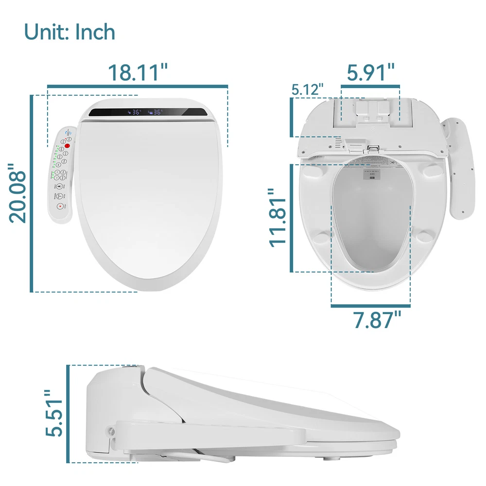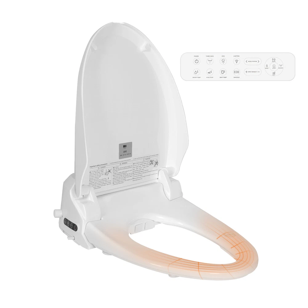 Smart toilet seat, wc shower environmentally friendly energy saving, heated seat toilet shower wc bidet attachment Enjoy a easy way of life for you and your family. Fits well for any family. Features: - Has seat sensor, seat heater, backward wash gear/Oszillationswaschgang, ladies wash gear, car wash gear, self-cleaning nozzle, power/saving function, LED night light. - The intelligent toilet lid only works when the skin touches the sensor section.effectively prevents accidental contact. - Wenn der Benutzer sitzt, wird durch Drücken der Taste die Deo-Funktion aktiviert. Hilft, den Gestank zu entfernen. - The water heater heats the water and the built-in air dryer offers 3 different adjustable temperatures. - Adjustable nozzle position and water pressure, can make better laundry for men and women. Treatment of patients with hemorrhoids. - KID WASH: Special design for the sitting position of children on the toilet. Softer flush, protects the delicate children's skin. - Seat temperature, water temperature, nozzle position and water pressure can be easily adjusted to your preferences. - Das elegante Design passt auf die meisten zweiteiligen Standardtoiletten und fügt sich harmonisch in jeden Badezimmerstil ein. - you can save at least 30% on toilet paper thanks to its environmentally friendly properties. - No plumbing skills or special tools are required. Specification: How do I choose the right size for the ELECWISH seat? 1 - Measure the distance between the tank and the front of the toilet bowl. ≥ 50cm-- Extended size 2 - Measure the distance from the center of the screw holes to the toilet basin, it must be at least 3 cm. 3 - Measure the distance of the mounting holes of the toilet, must be in 14cm ~20cm. Package list: - 1 x Smart toilet seat - 1 x mounting accessories - 1 x Assembly instructions On Dec 12, 2024 at 05:13:19 PST, seller added the following information:
