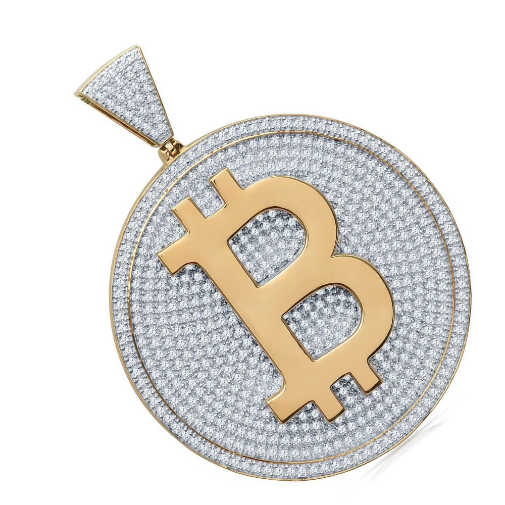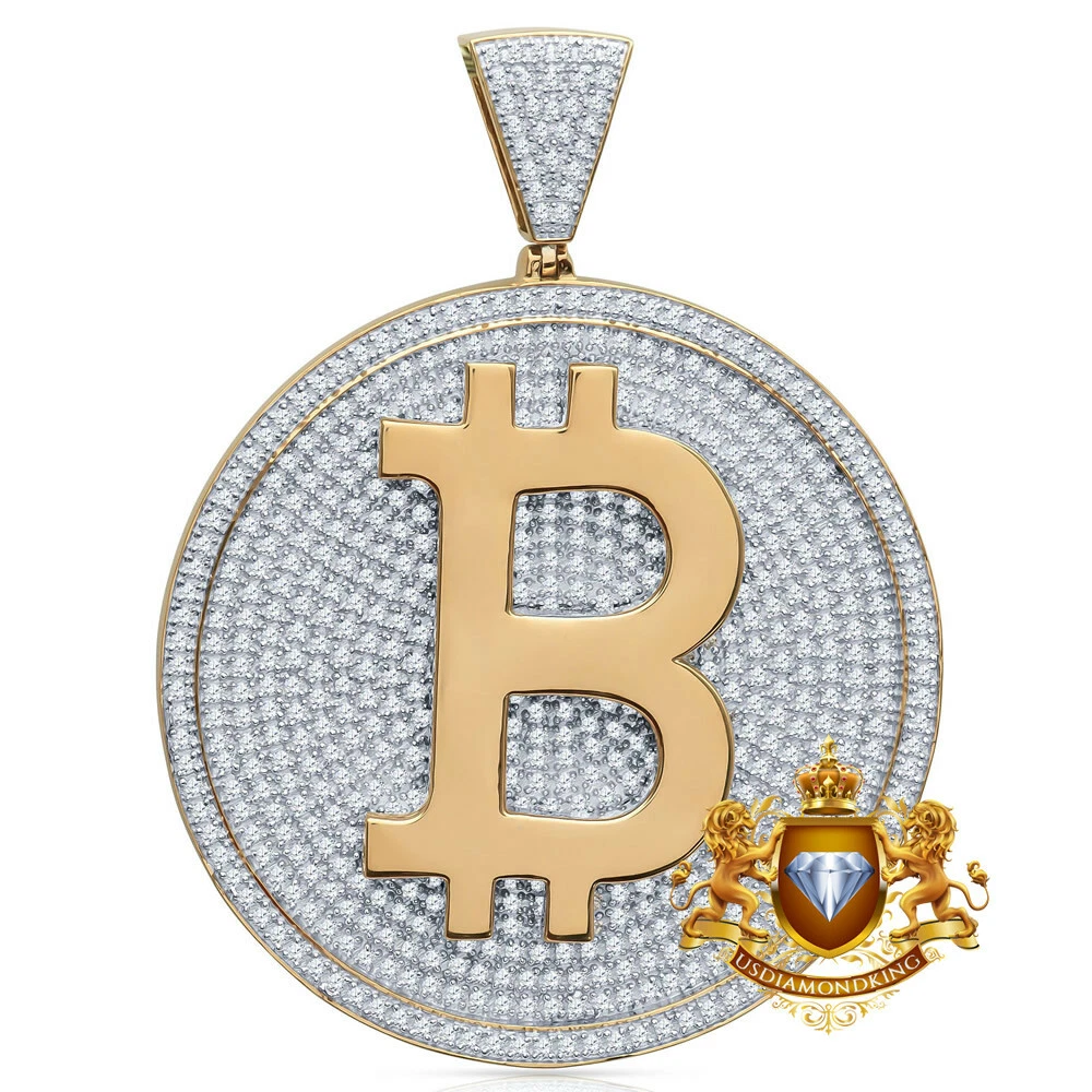 41+ Grams Men's Big XL 3'' 14K Gold On Real Sterling Silver Bitcoin Cryptocurrency Pendant Simulated Diamond Medallion Charm 'Photos do not indicate actual size. All size dimensions are provided below. Please read through before purchasing." Style : Real Sterling Silver Custom Pendant Charm 14K Gold Finish Metal - 14k Gold Over Pure Italian Sterling Silver Charm Length : 3.00 Inches ( Including Bail ) Charm Width : 2.25 Inches Charm Thickness : 5 mm Main Stone : Simulated Diamonds (Cubic Zirconia) Carat Weight (TCW) : 6 Cwt. Stone Setting : Micro Pave Stone Shape : Round Brilliant Stone Color : White Stone Cut : Good Gender : Men's / Women's Total Weight ( Charm + Chain ) : 41 + Grams ITEM # VN CUSTOM 62649 Weights are approximate, there may be up to 10% variation in actual item. *** Comes With Complimentary Presentation Gift Box ***