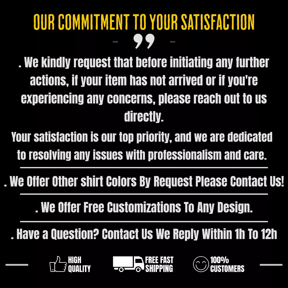 Premium Cotton T-Shirts | Product Details Premium Quality T-Shirts For any issues with your order or if you have not received your item, please contact us directly. We are committed to resolving any concerns with the highest level of professionalism. Product Specifications Material: 100% cotton (fiber content may vary for different colors) Weight: Medium (5.3 oz/yd² (180 g/m²)) Pre-shrunk Shoulder-to-shoulder taping Quarter-turned to avoid crease down the center Size Chart Size Chart in Inches Size Width (in) Length (in) Sleeve Length (in) S 18.00 28.00 7.75 M 20.00 29.00 8.25 L 22.01 30.00 8.25 XL 24.02 31.00 8.76 2XL 26.03 32.00 9.26 3XL 28.04 33.00 9.77 4XL 29.97 34.00 10.24 5XL 31.97 35.00 10.75 Size Chart in Cm Size Width (cm) Length (cm) Sleeve Length (cm) S 45.70 71.12 18.40 M 50.80 73.66 19.70 L 55.80 76.20 20.90 XL 60.90 78.74 22.20 2XL 66.00 81.28 23.50 3XL 71.10 83.82 24.80 4XL 76.30 86.36 26.00 5XL 81.20 88.90 27.30 Interested in more items? Contact us to arrange combined shipping and save on costs Payment Options We accept a variety of payment methods, including credit and debit cards, Apple Pay, Google Pay, PayPal, and PayPal Credit. Contact Us Check back soon for updated contact information. In the meantime, add us to your favorite sellers and visit our shop again later. Thank you for your patience! Visit Our Shop Please note: Orders of incorrect sizes are not eligible for refunds. All products are made on demand, so exchanges require producing a new item.