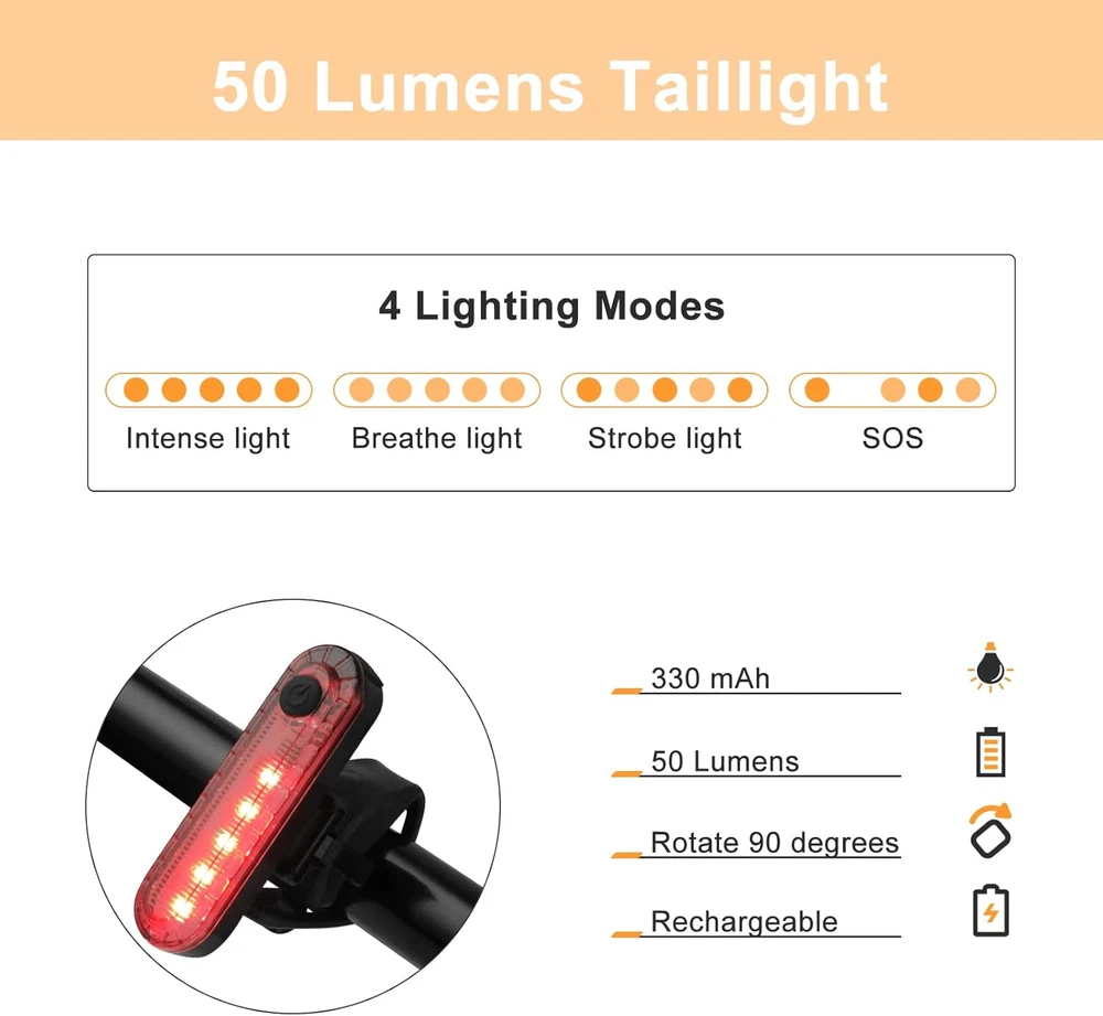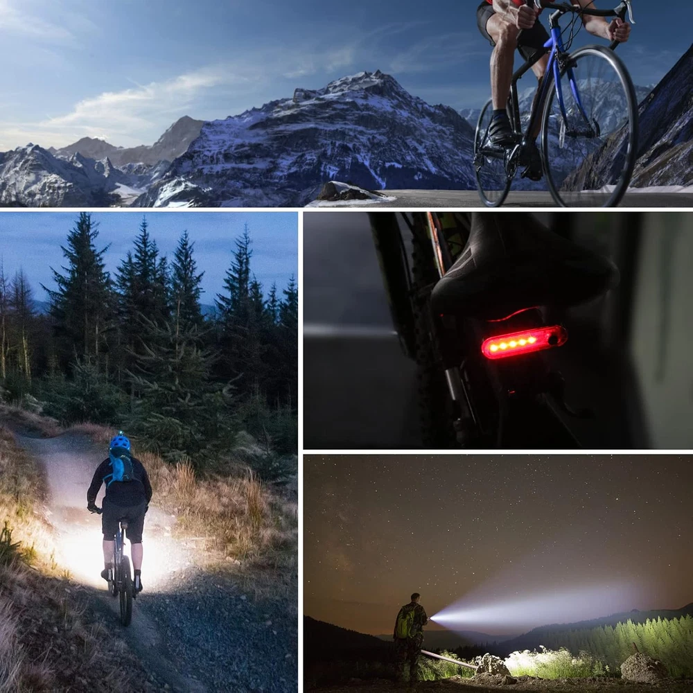 đ˛ăSuper Bright Frontlight & Waterproofă-The bike headlight is equipped with 2 professional LED lamp beads, one is a floodlight and the other is a spotlight. With a maximum output of 1000 lumens and 4-hour runtime, it will light up the road you ride at night. IPX5 waterproof design can be used in rain and snow. đ˛ăPower Display & USB Rechargeableă-The bicycle headlight has a built-in rechargeable lithium battery, and it takes 2 hours to charge the 1200mAh. USB charging can charge the lamp anytime. The display on the bicycle light shows the battery level to remind you that the light needs to be charged. đ˛ăUniversal Fit & Easy Installă-Bicycle frontlight made of high-quality aluminum alloy shell, which is very sturdy and has good impact resistance and heat dissipation. The rubber strap tightly fit around many size seat posts, handlebars, backpacks and helmets to keep lights secure and firm.They are very easy to install, no tools are required. đ˛ă6 Lighting Modesă-The bicycle lights set feature one-touch switch, and front light provide 6 different lighting modes and taillight provide 4 mode to select. Simply click the button and select the light modes as desired.Can be used as an emergency flashlight, put it in the car, basement and emergency kit. Use it during cycling, running, hiking, camping, dog walking, night activities, power outages, etc.! đ˛ăGreat Value Bike Lights Setă-Bike light kit includes 1 * bicycle front headlight, 1 * bike Taillight, 2 * USB charging cable.The bicycle rear light is 50 lumens, 330mAh rechargeable lithium battery, 4 lighting modes. Bike headlight and taillight are suitable for bicycles, scooters, strollers and wheelchairs. Bike Lights set Bike Headlight and Taillight Bicycle Front Headlight and Back Taillight USB Rechargeable Bicycle Headlight bicycle lights front and rear