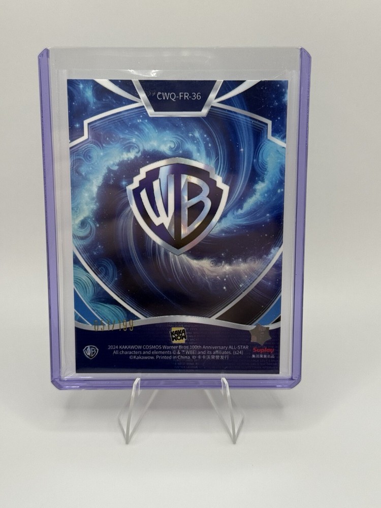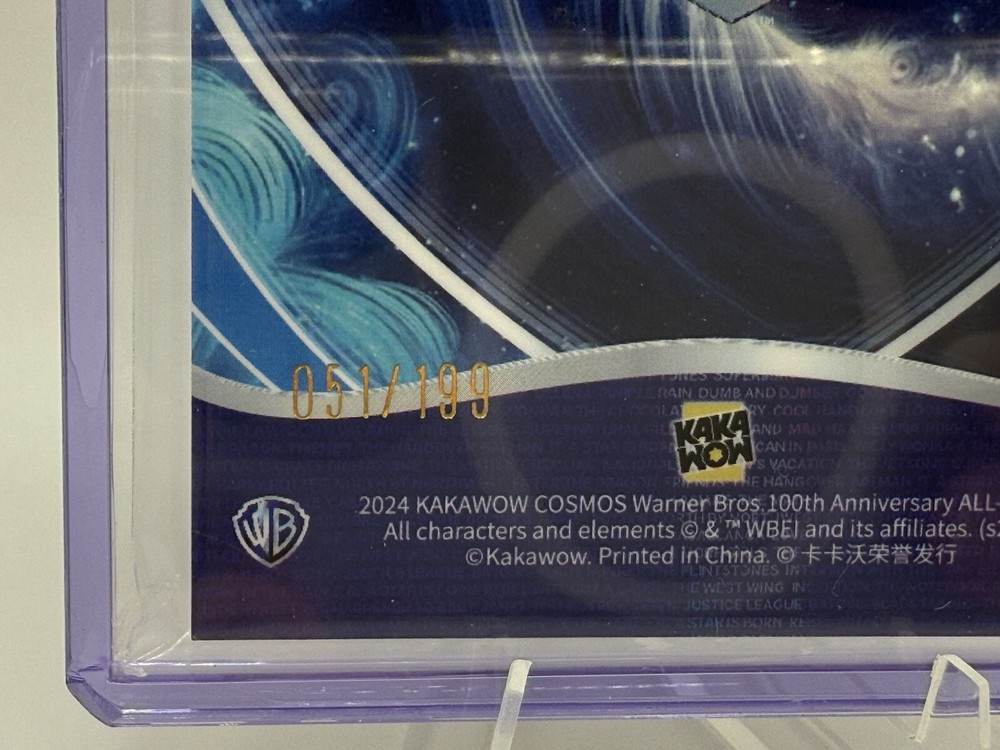 A non-sport trading card featuring Bilbo in silhouette from The Hobbit franchise. This Cosmos Warner Brothers card by Kakawow is made of card stock, with a limited edition of 199. It is part of the 100th anniversary collection and is labeled as "Bilbo Silhouette." The card number is CWQ-FR-36 and it is in near mint or better condition. The card is in English and was manufactured in China in 2024.