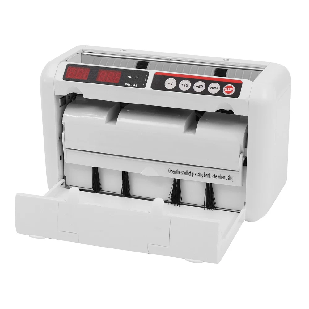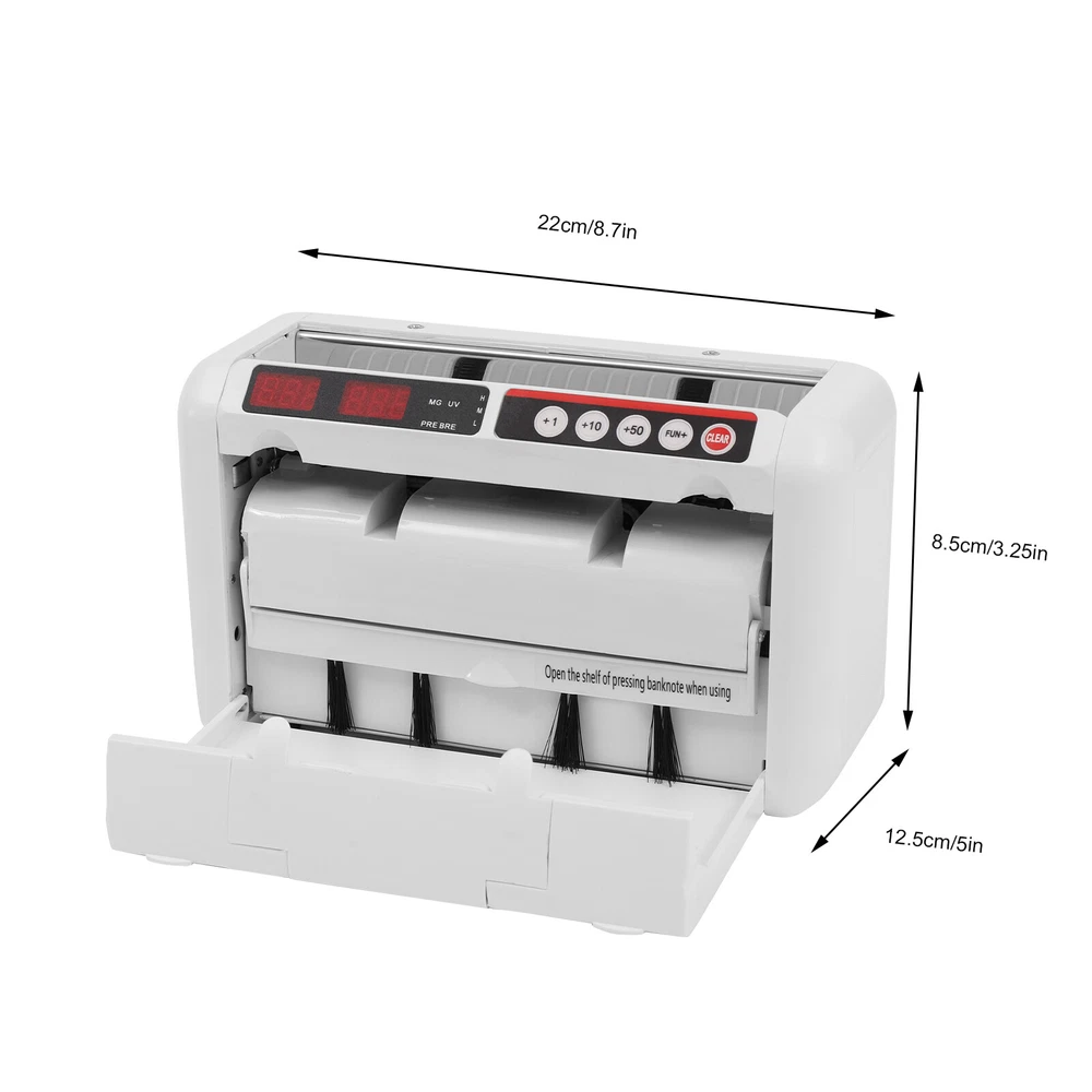 Description What do you look for in an affordable portable bill counter? We know, and we can do it! Leave all your bill counting and counterfeit detection to this counting machine with UV and magnetic detection, which will greatly improve efficiency and accuracy to protect your business. Key Features UV & MG Detection: Powerful UV and magnetic detection easily detect suspicious counterfeit, torn, or damaged bills to ensure that the cash counted is authentic and intact. Auto-stop Function: It automatically stops when counterfeit or damaged bills are detected allowing you to detect them in time to avoid losses. And it is very convenient to continue working with a single press of the reset/zero button. Precise and Efficient: It uses frictional bill splitting to achieve efficient countin Bill Counter Money Cash Counting Machine Portable Rechargeable UV Detection New ♥♥Welcome to Yunchenmj001♥♥ Description What Do You Look for in an Affordable Portable Bill Counter? We Know, and We Can Do It! Leave All Your Bill Counting and Counterfeit Detection to This Counting Machine with Uv and Magnetic Detection, Which Will Greatly Improve Efficiency and Accuracy to Protect Your Business. Key Features Uv & Mg Detection : Powerful Uv and Magnetic Detection Easily Detect Suspicious Counterfeit, Torn, or Damaged Bills to Ensure That the Cash Counted Is Authentic and Intact. Autostop Function : It Automatically Stops When Counterfeit or Damaged Bills Are Detected Allowing You to Detect Them in Time to Avoid Losses. and It Is Very Convenient to Continue Working with a Single Press of the Reset/Zero Button. Precise and Efficient : It Uses Frictional Bill Splitting to Achieve Efficient Counting of 800pcs/Min, Which Greatly Improves Efficiency. and Two Three-digit Clear Led Displays to Let You Easily and Accurately Know the Number of Bills. Easy to Carry : the Portable Bill Counter Powered by a Lithium Battery Can Serve You Anywhere and Anytime Without the Restriction of Wires. with a Net Weight of Only 4.45 Pounds and a Carrying Case with Straps, You Can Carry It Easily. Multi-function : the Simple yet Clear Operation Interface Brings You a Variety of Modes and Functions Such As Preset Sheet Count, Zeroing, Resetting, Checking, and Counting to Meet Various Counting Needs. Charging or Plug-in Use : Every Machine Comes with a Dc Plug and Rechargeable Function. the Built in 1800 Mah High-capacity Lithium Battery Can Last for 3 to 4 Hours and Stand by for About a Week. When You Need to Count Money, the Machine Can Serve You at Any Time to Protect Your Property. Multiple Currency Detection : the Bill Counter Is Suitable for Use with Different Currencies Such As the Us Dollar, Euro, Hong Kong Dollar, and Rupee. Its Excellent and Precise Identification and Counting Capabilities Make It Adaptable to Different Occasions. Sturdy and Durable : This Bill Counting Machine Is Made of High Quality Iron and Plastic, Which Is Very Sturdy, Durable, and Not Easily Deformed. Dustproof Design : the Portable Bill Counter Has a Dustproof Cover Design That Can Be Closed to Effectively Prevent Dust from Entering, Which Greatly Reduces the Cleaning Task and Extends the Service Life. Customer Service : the End of the Story Between Us Is Definitely Not "We Sell and You Buy" If You Have Any Problems, Please Feel Free to Contact Us. We Will Reply and Solve the Problem for You As Soon As Possible. Details Antislip Feet : the Bottom Is Equipped with Four Antislip Rubber Feet That Can Effectively Fix and Prevent Slippage to Make It Run Stably. Cleaning Brush : the Small, Lightweight Brush Allows You to Clean All the Dead Corners of the Product, so It Is As Clean As New Even After a Long Time of Use. Carrying Bag : the Black Carrying Bag Made of High Q uality Pu Can Effectively Prevent Dust and Rain from Entering to Extend Its Service Life. Adjustable Nylon Makes It Easy to Carry. Banknote Stopper : the Raised Banknote Stopper and Metal Frame Can Effectively Stop the Banknotes from Falling out so That They Can Be Stacked Neatly. Bill Pressing Board : the Bill Pressing Board Is Equipped with Four Brushes to Effectively Prevent Bills from Splashing. Application It Is Suitable for Banks, Companies, and Supermarkets for Banknote Inspection and Counting. Specification Material: Iron, Plastic, Rubber Model: K1000 Input Voltage: 110-220v 50-60hz Working Voltage: Dc 12v1.5a Power: 25w Plug: American Standard Color: White Counterfeit Detection Technology: Uv , Mg Suitable Banknote Length: 110-190mm/4.33-7.48in Suitable Banknote Width: 50-80mm/1.96-3.14in Capacity: 100-130pieces(Change According to Different Currencies ) Suitable Banknote Thickness: 0.075-0.15mm/0.003-0.006in Li-ion Battery Capacity: 1800 Mah Continuous Use Time: 3-4 Hours Standby Time: About 1 Week Feeding Method: Friction Cents Counting Range: 1~999 Sheets Display Mode: 3+3 Digit Led Display Counting Speed: 800pcs/Min Applicable Currencies: Usd, Eur, Hkd, Hub, and Other Currencies Gross Weight: 2.6kg/5.73lbs Net Weight: 2.02kg/4.45lbs Package Size: 27.5*14.5*17.5cm/10.82*3.34*6.88in Product Size: 22*8.5*12.5cm/8.7*3.35*5in How to Use Open the Flip . Pull out the Brush . Turn on the Power Start Counting. Package Included 1* Bill Counter 1*Power Supply 1*Carrying Case 1*Belt 1*Brush 1*English Manual Notes Please Read the Manual Carefully Before Use. Please Allow the Slight Color Difference Caused by the Shooting Light and 1-3cm Error Due to Manual Measurement. Please Make Sure You Do Not Mind Before You Order. Payment Delivery details Terms of sales About us Contact us Payment We accept ebay payment 。 Fees such as import duties, taxes are not included in the item price or shipping costs. These charges are the buyer's responsibility. Delivery details Shipping: 2-9 working days to: USA Terms of sales We maintain high standards of excellence and strive for hundred percent customer satisfaction. Feedback is very important to us. We hope that you contact us immediately before you g