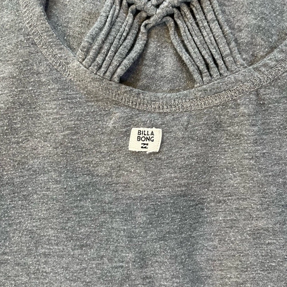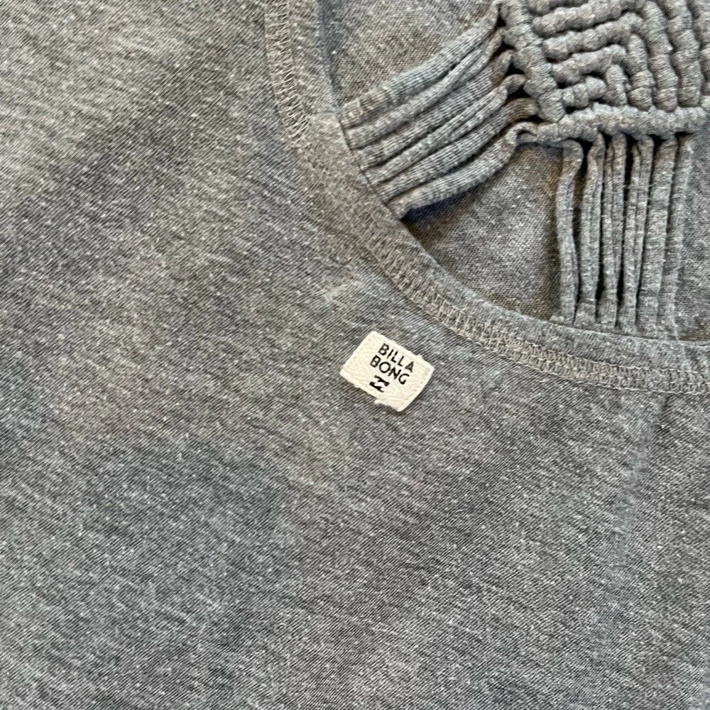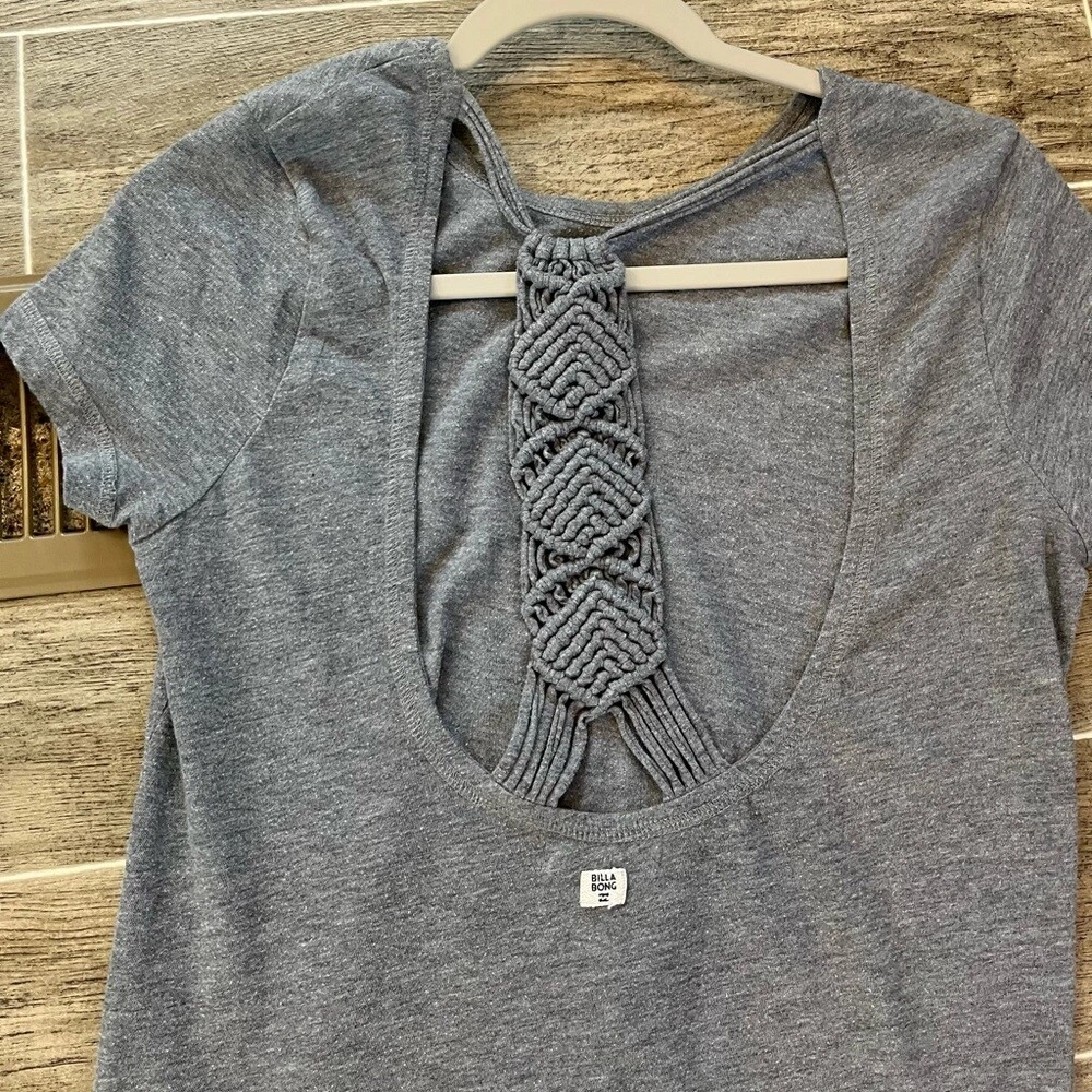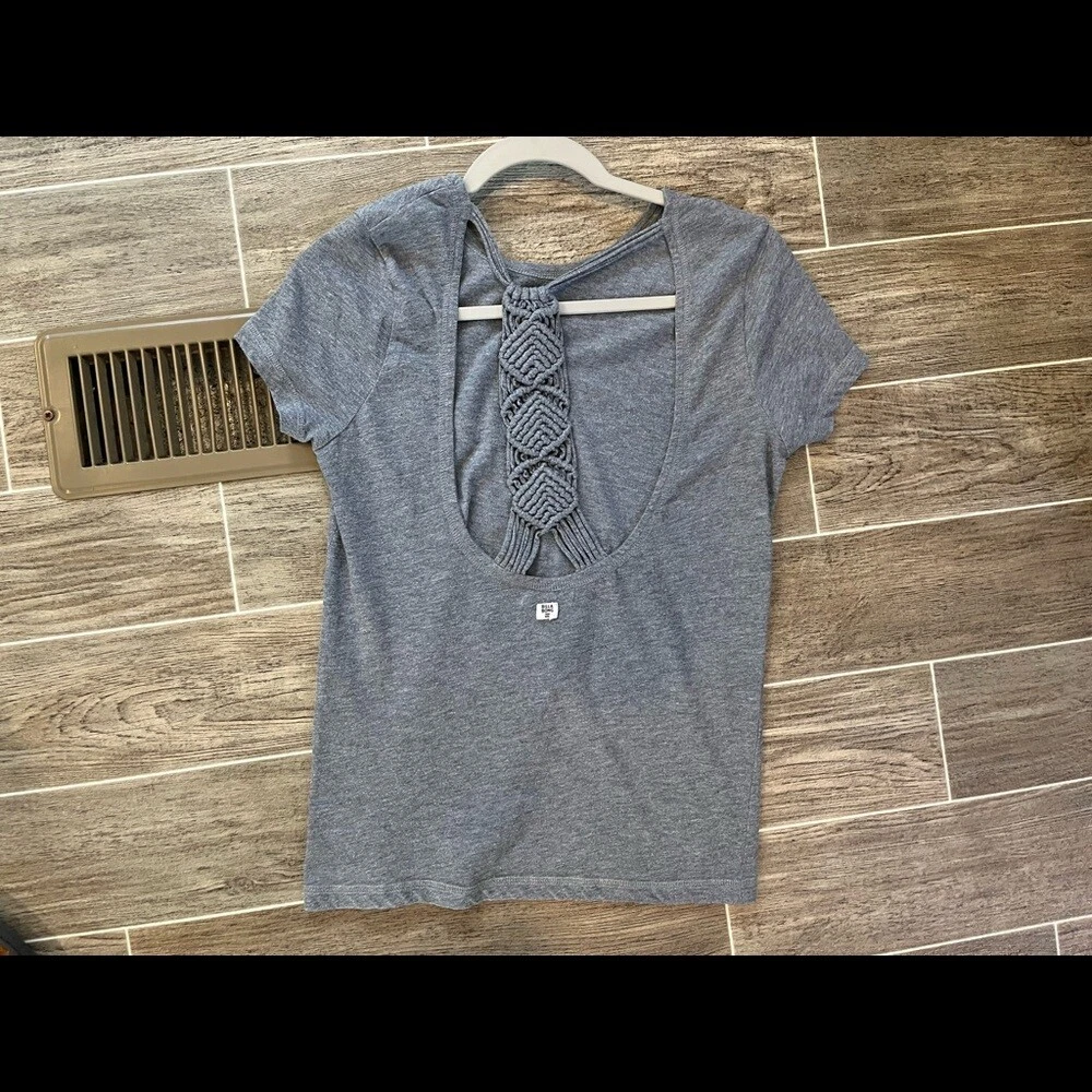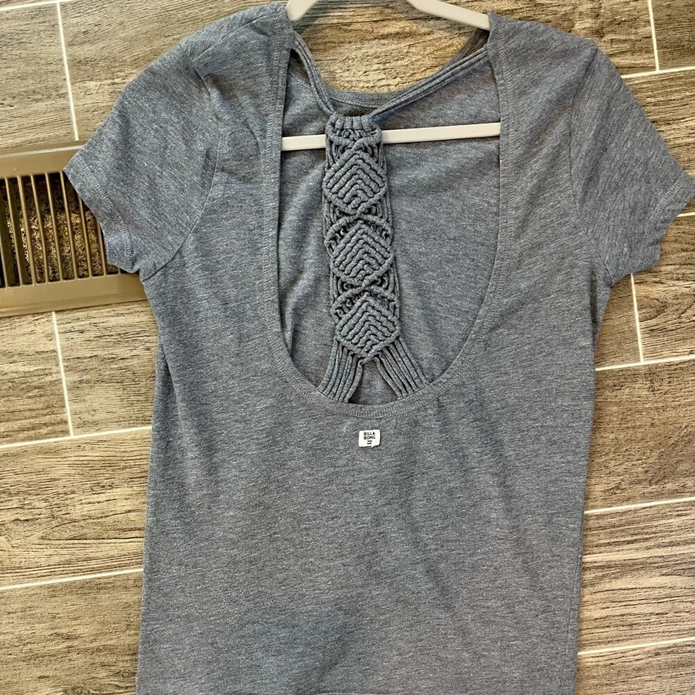 Billa Bong brand. gray summer shirt. Short Sleeve. Size s/p. Poly/cotton. Open back with nice embroidered trim. Excellent condition. Knotted in back. Gray