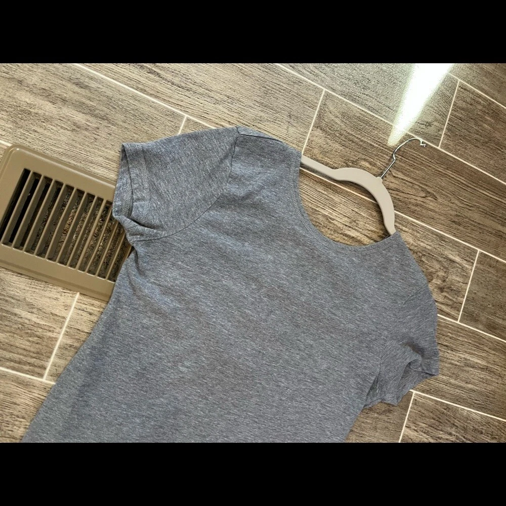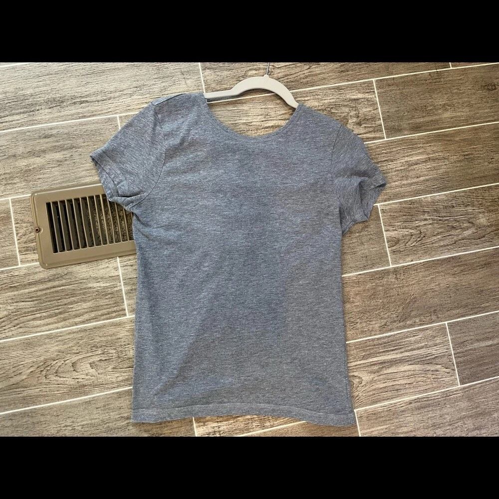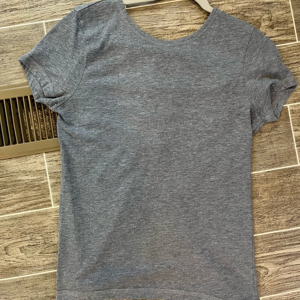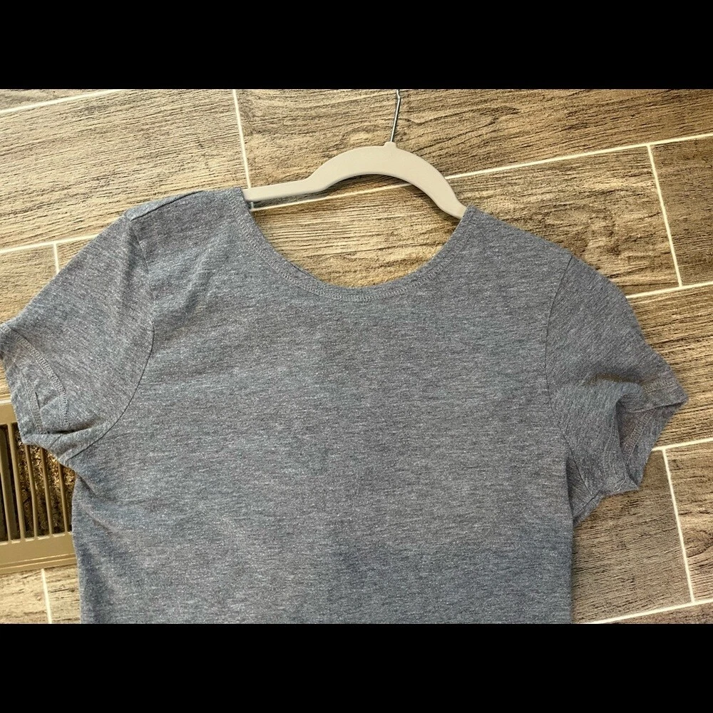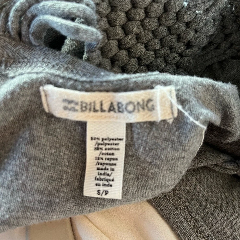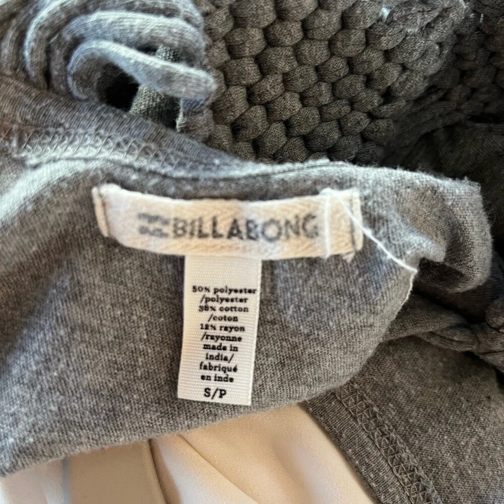 Billa Bong brand. gray summer shirt. Short Sleeve. Size s/p. Poly/cotton. Open back with nice embroidered trim. Excellent condition. Knotted in back. Gray