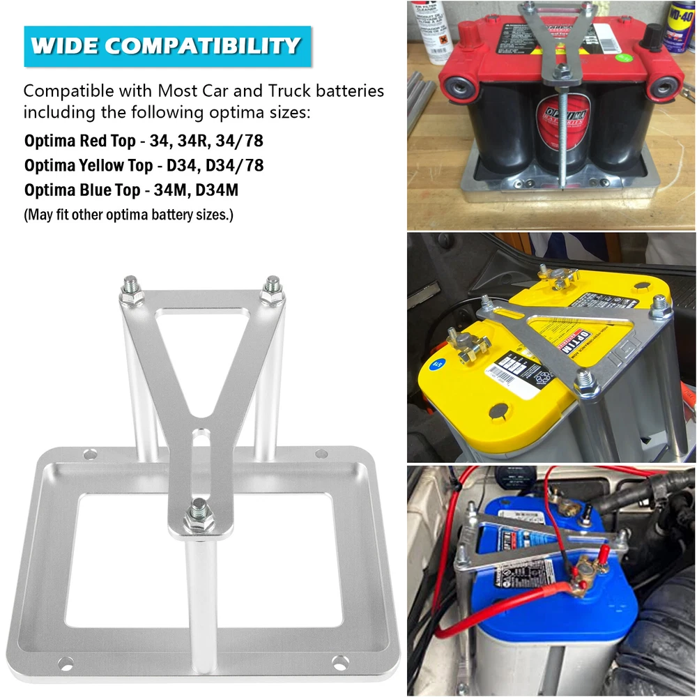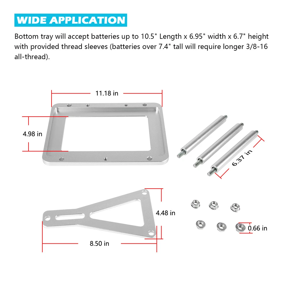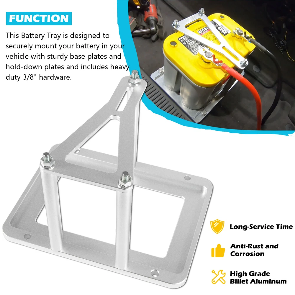 Universal Aluminum Billet Battery Tray Hold Down Trunk Relocation Box for Optima Race Racing Mount Red Yellow Blue Top 34 34/78 D34 D34/78 34M D34M 551181 Function: This battery tray is designed to securely mount your battery in your vehicle with sturdy base plates and hold-down plates and includes heavy duty 3/8" hardware. Compatibility: Compatible with Most Car and Truck batteries including the following optima sizes: Red top: 34, 34R, 34/78 & Yellow top: D34, D34/78 & Blue top: 34M, D34M (may fit other optima battery sizes) Wide Application: Overall dimensions of the base plate are 11.25" long by 8.5" wide. Bottom tray will accept batteries up to 10.5" Length x 6.95" width x 6.7" height with provided thread sleeves (batteries over 7.4" tall will require longer 3/8-16 all-thread). Package Included: 1 x Base Plate, 1 x Top Plate, 3 x All-Thread Hold Downs with Nuts, 3 x Thread Sleeves. Made of High Grade Billet Aluminum with high precision and strength, anti-rust and corrosion for great durability, providing a long lasting service time. Satisfaction Guarantee: Yoursme aims to provide the best service for our customer , if you're not 100% satisfied with our item, simply return it for a full refund in 30 days. We support 12 months’ Warranty. If you have any problems about our products, please feel free to contact us. Aircraft Grade Quality Made of aircraft grade alloy aluminum, solid and durable, electroplated to be rust and corrosion resistance for long term service. Precision CNC Cut CNC machined, all the holes and edges are smooth and precise and accuracy. Full Kit The whole battery tray include 1 base plate, 1 top plate, 3 all-thread hold downs with nuts, 3 thread sleeves.