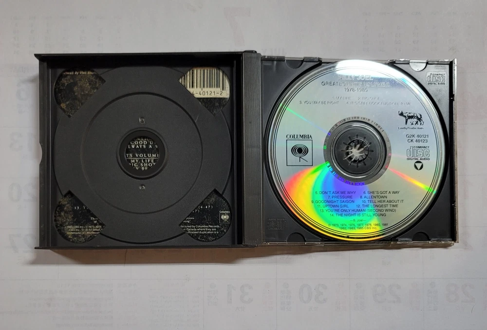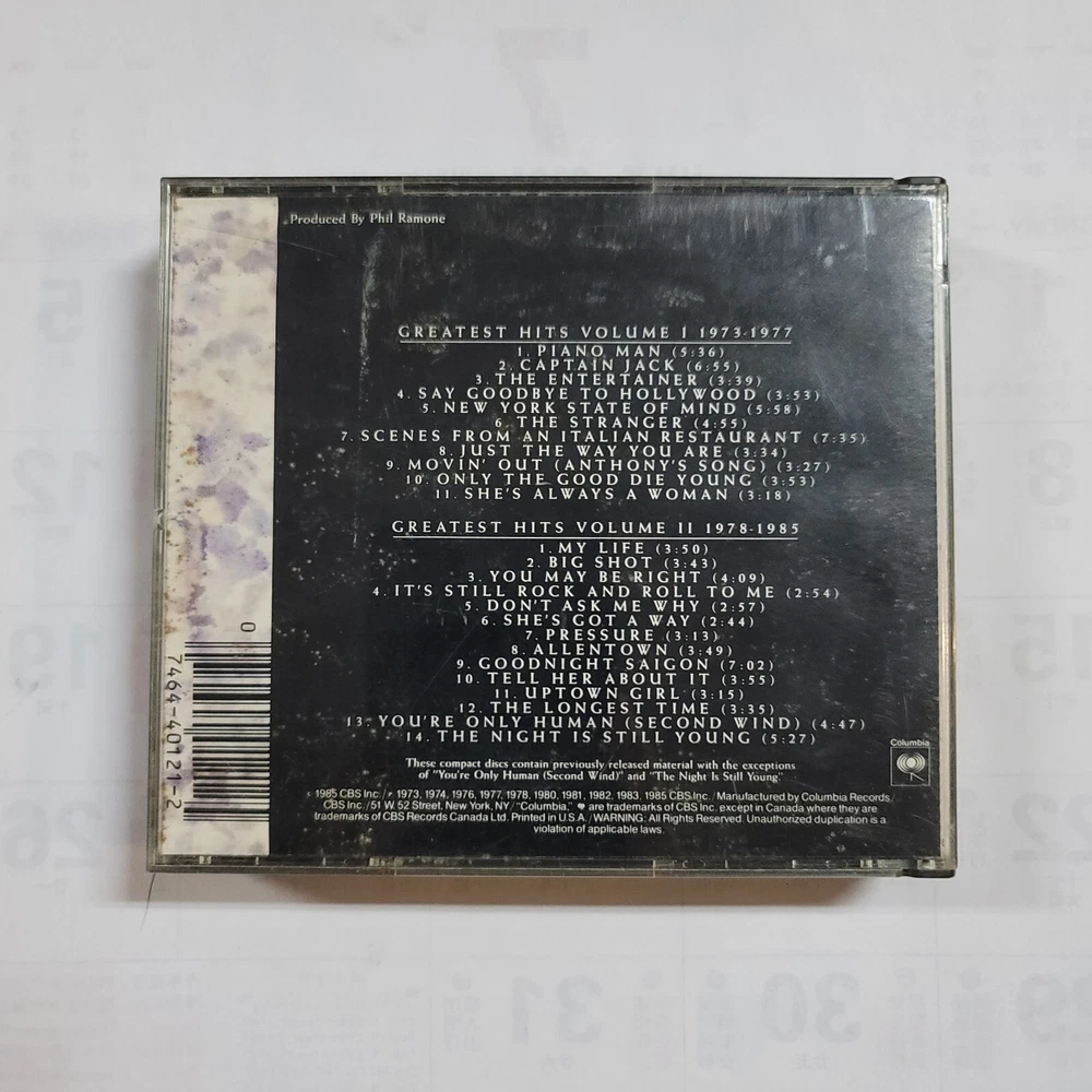 Edition:Greatest HitsMPN:40121Instrument:Drums, Keyboard, Piano, Guitar, Bass Guitar, Acoustic Guitar, Electric GuitarColor:MulticolorLanguage:EnglishType:AlbumCase Type:Jewel Case: StandardArtist:Billy JoelEra:1980sRun Time:AlbumFormat:CDGenre:RockOccasion:Wedding, Fourth of July, New Year, Carnival, BirthdayRelease Year:1985Features:DVD-Audio, Live Recording, Original Cover, Numbered, Import, Mixed, Sealed, Digipak, DualDisc, Remastered, Original Inner Sleeve, Compilation, Enhanced, SACDRecord Label:ColumbiaRelease Title:Billy Joel Greatest Hits Vol 1 & 2Style:Soft Rock, Blues Rock, Traditional/Vocal, Singer-Songwriter, Hard Rock, Synth-Pop, Pop Rock