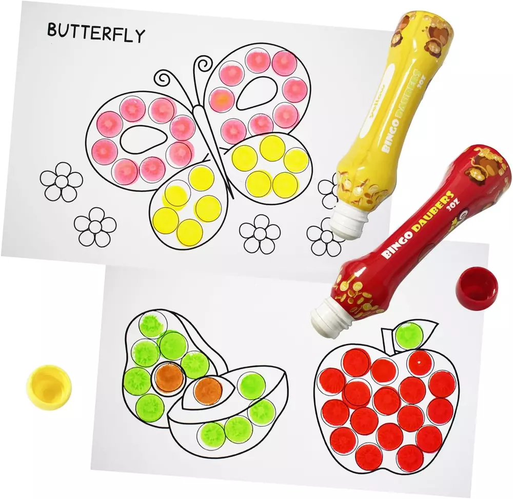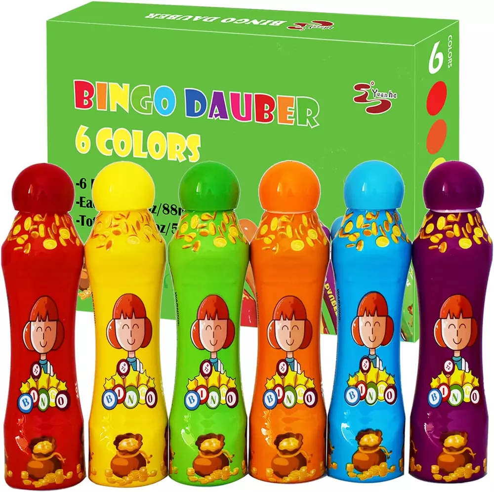 MULTI COLORS:Set of 6 mixed color bingo daubers,filled with premium quality ink that dries in seconds! No mess, no splatter. PREMIUM QUALITY:The leakage-proof dot markers for kids keeps the color fresh for a long time and the large sponge tip will not dry out. SAFE AND EASY TO USE: 3oz/88ml large capacity. Made of non-toxic ink,which are completely safe for children. And kids can easily unscrew the caps. BEST GIFT: Perfect for bingo games! The ink dries quickly so you don't have to worry about smearing your card, you can enjoy the bingo game with your family. FUN AND LEANING: Teachers and Parents can have fun with kids for dot paint projects, Dabbing, Bingo daubing. Product Description Durable Large Sponge Tip The leakage-proof dot markers for kids keeps the color fresh for a long time and the large sponge tip will not dry out. No mess, no splatter! Description: Looking for a fun way to introduce your little kids to coloring? Worrying about the ink smears your hand in the bingo game. Our dot markers are the perfect choice! The bingo daubers are made of non-toxic ink,which are completely safe for children. And kids can easily unscrew the caps. The ink dries quickly,no mess, no splatter.you can enjoy the bingo game with your family. 12 fun colors to choose from, creating colorful designs is a breeze! Packing: color box Meterial: non-toxic ink Colors:red/orange/yellow/apple green/blue/purple Applicable age: 3 years and up Package Included : 6x Bingo daubers Math Skills People can paly the math game by the dot markers and help children to learn numbers. Perfect for the Bingo Game The ink dries quickly so you don't have to worry about smearing your card, you can enjoy the bingo game with your families. Paint the Funny Cartoon Teachers and Parents can have fun with kids for dot paint projects to nurture hand-eye coordination and improve children’s creation.
