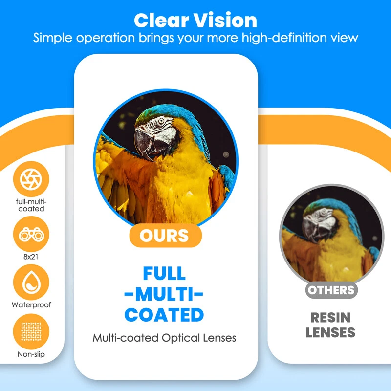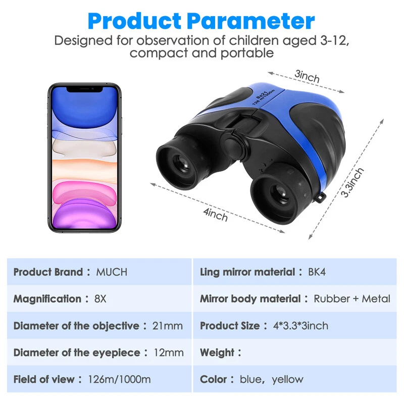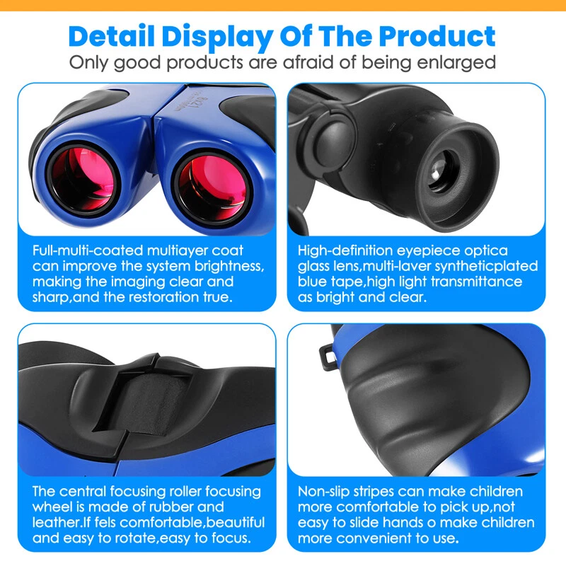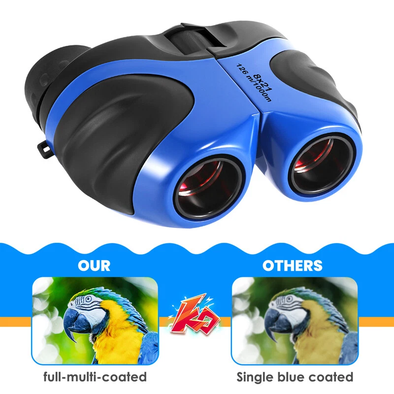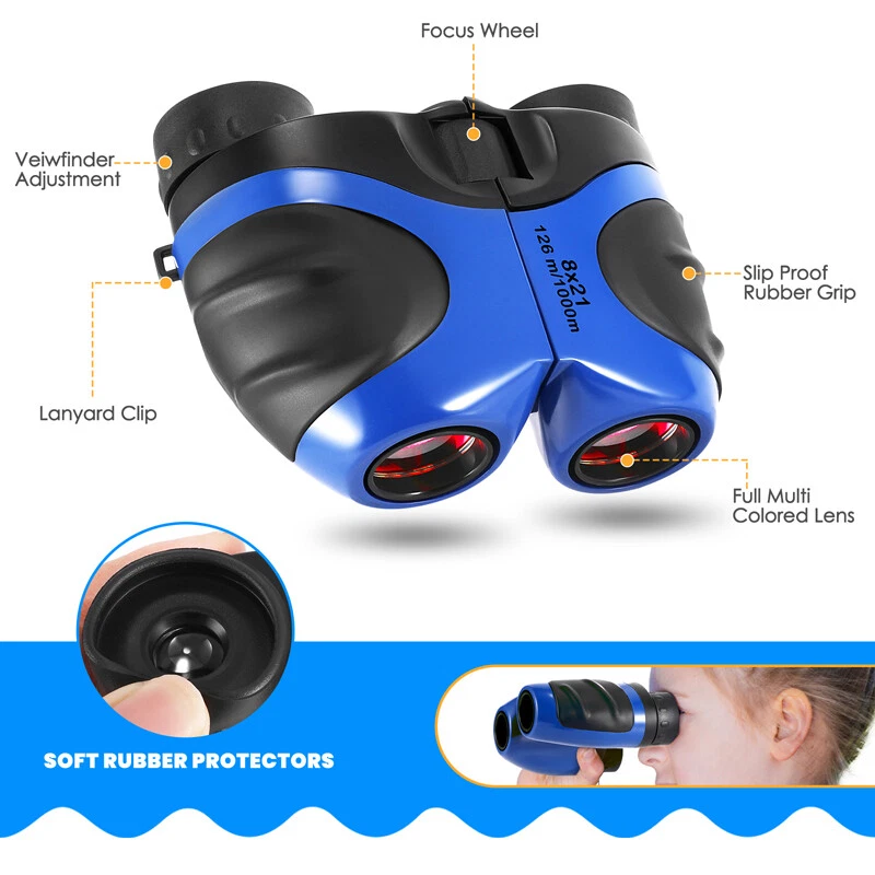 Kids Children's Pocket Mini Binoculars 8x21 Color Adjustable Focus Telescope Feature: -- Safe and Reliable: There is soft rubber around the eyepiece to protect children's eyes, while there is an extra coating around the eyepiece to protect the lens when dropped. -- Advanced Design: Non-slip scratches, the grip is ergonomically designed to fit children's hands, easy to focus, and can see a clear view. -- HD Field of View: With 8x magnification, wide field of view, the binoculars can be adjusted, perfect for bird watching, learning, hunting, theater, hiking. -- Shockproof Function: The durable telescope is coated with shock-absorbing rubber to withstand drops on the ground, and the shockproof rubber can protect the telescope from damage. Specification: Color: Blue Material: rubber + plastic Field of view: 126m/1000m Magnification: 8 times Diameter of objective: 21mm Diameter of eyepiece : 12mm Focusing type: center focusing Product size: 11*8.5*7.5cm/4*3.3*3inch Package includes: 1x Telescope 1x Lanyard 1x Cleaning Cloth 1x Instruction Manual 1x Packaging Bag 1x Packing Box Payment Delivery details Terms of sales About us Contact us Payment Payments: Paypal, Google Pay, Visa, Master Card, Amerian Express, Discover. Delivery details All items are shipped from US warehouse located at NJ . We ship to your eBay or Paypal address. Please make sure your eBay or Paypal address is correct before you pay. Terms of sales Free return About us Pls contact our customer service firstly if have any problems , we will help to solve the issue, and could offer free return service for full refund or free replacement after confirming. You can buy from us with confidence Contact us If have any problems, please feel free to contact us.