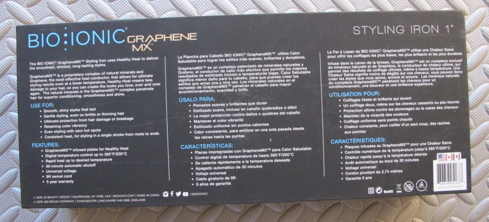 Bio Ionic Graphene MX Styling Iron 1" New, unused, open box item. Ceramic Mineral Complex. BioCeramic MCH Heater. Far Infrared Heat. Adjustable Heat. Swivel Cord. 30 Mins Automatic Shut-Off . 38 Wattage Rating. 385 Temperature. 9 ft Cord Length. Universal Voltage. Benefits: Quickly create beautiful, long lasting styles with 58% less breakage Over 90% of users saw no hair damage after using, and over 85% of stylists said it makes hair look and feel healthier 1" plates and rounded barrel easily create curls, waves or straight styles Digital temperature control up to 385°F, 30 min auto-shutoff and 110V
