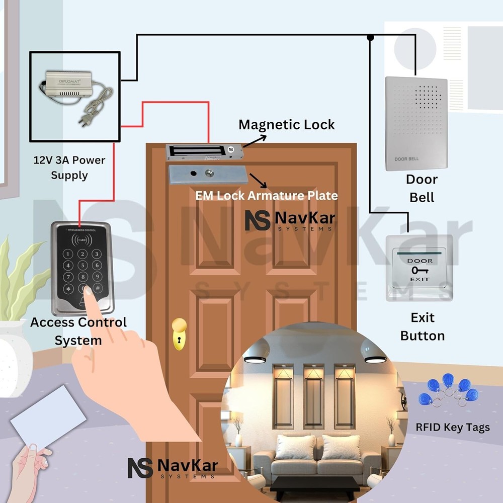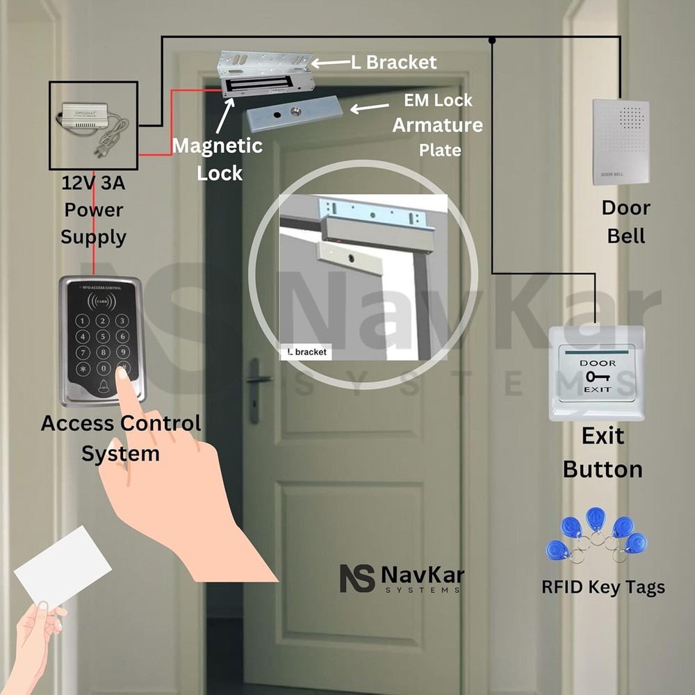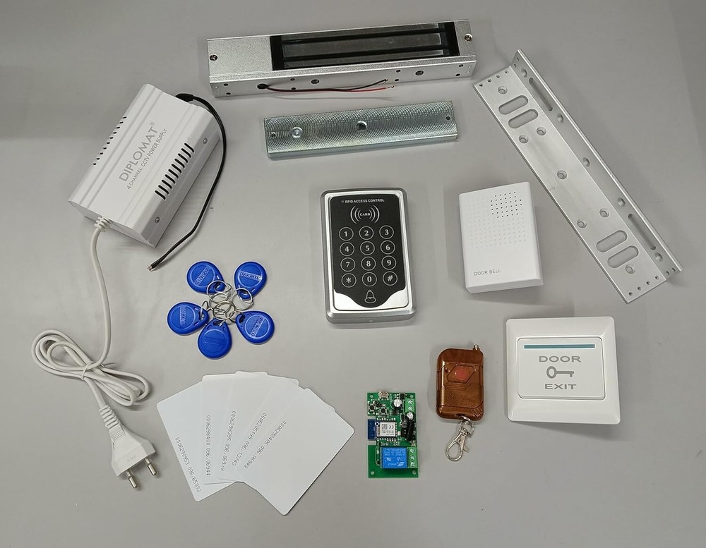 This is a NEW RFID Reader Access Control Keypad, which can update the safety of your home and office. It is perfect for Homes, Office, Factory and many other fields! It is powerful and can open the door using proximity cards, passwords etc The access controller can provide users with more convenience by connecting to terminals, including the button for opening the door, doorbell, and electric lock that is normally open or closed. RFID Reader Access Control System with Electro Magnetic Lock Access Controller+ Power Controller+ Electromagnetic Lock with L Bracket + 5 RFID cards + 5 Keyfobs + Exit button With 1x Remote, 1x Tuya Wifi PCB, You Can Open Lock via Remote control Package: 1 x Fingerprint + RFID Access Controller 1 x Power supply controller 1 x Remote 1 x Tuya Wifi PCB 1 x Electromagnetic Lock 1 x L Bracket 1 x Exit button 5 x RFID cards 5 x ID Keyfobs 1 x doorbell RFID Access Controller: Contactless RFID transponder technology with power off data protection function Support offline work and full programming from the keypad Support card, password, card+password to open door Support master cards to add or delete user cards Support the switch for opening the door Elegant appearance with clear numbers, convient to use Voltage: DC 12V Current: <100mA User capacity: 1000 users Frequency: 125KHz Support: Card, PIN, card + PIN Valid password: General 1 set Card type: EM, MF1 External reader: Not support Distance: 2 to 10cm Material: Plastic Size: 117 x 75 x 20mm (4.6 x 2.95 x 0.79 inch) Weight: 106g (3.74oz) Electro Magnetic Lock (600lbs) Overview: This item is magnetic lock that consists of an electromagnet and an armature plate used for access control door locks. By attaching this to the door frame and the armature plate to the door, a current passing through the electromagnet attracts the armature plate, holding the access control door lock shut. When power off, the door will open. It is suitable for wooden door, glass door, metal door, fire-proof door etc. Specifications: force/ Pull force : 180KG(350lbs) holding force/ Pull force : 250KG(600lbs) Working mode: power-on to lock Working temperature: -10 to 55 Celsius degree (14 to 131 Fahrenheit degree) Humidity: 0 to 95% Features: Good quality and durable to use. Corrosion resistant. Aluminum shell adopts high strength material, with hard anodised processing. Anodized aluminum, lock body and suction plate selected chemical electroplating antirust treatment Built-in reverse current protection device (MOV). Can be opened by push button, remote controller, etc. Fit for wooden door, metal door, glass door, fireproof door, etc. Exit button: The plastic Door Exit button is widely used in the door access control systems. Just press the exit button and you can have the access authority to go. Supports NC Mode (Fail-Safe Mode) & NO Mode (Fail-Secure Mode) Up to 1,000,000 times aging test Faceplate Dimension : 8 6 x 8 6x29.5 (mm) Material: Hard Plastic Remote Control: This is a remote control device for Door Access Control System use, after you connect it on your system, you can press the remote control to open the door remotely, the distance can reach up to 50 meters. 125Khz RFID Keyfobs: Waterproof Detecting distance: 2-5cm Operating frequency: 125Khz Each comes with Key ring included Compatible with all RFID ID card reader to gain access Each token pre-programmed with unique ID which is printed on it