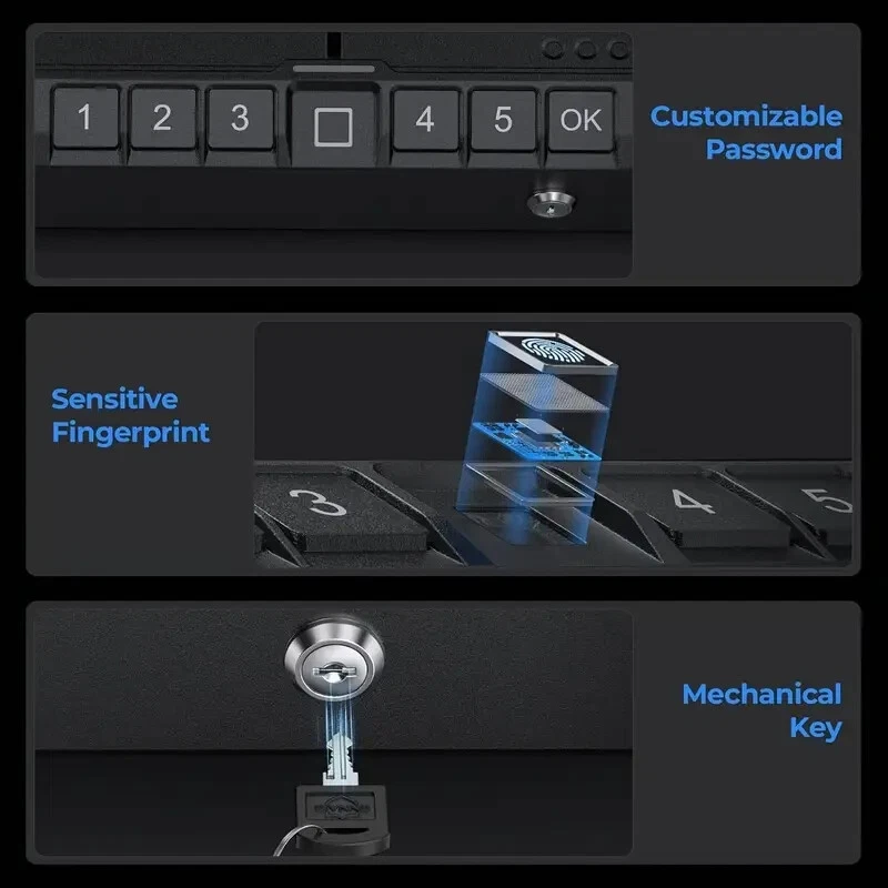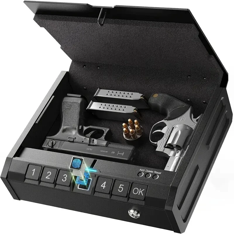 Ensure your valuables and firearms are secure with this Biometric Black Gun Safe , designed for quick access and maximum protection. Perfect for handguns, jewelry, or other valuables, this durable security box offers peace of mind at home or on the go. Features: Quick-Access Technology: Fingerprint scanner, keypad, and key lock for versatile entry options. Durable Construction: Made with high-quality aluminum alloy for long-lasting security. Compact & Portable: Ideal for bedside, nightstands, cars, or travel use. Organized Storage: Designed to keep pistols and valuables neatly secured. Specifications: Material: Aluminum Alloy Uses: Home security, car safe, bedside storage Design: Sleek, black finish for discreet storage Upgrade your security with this reliable and efficient storage box—perfect for home or travel!
