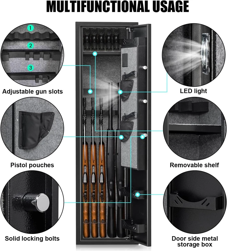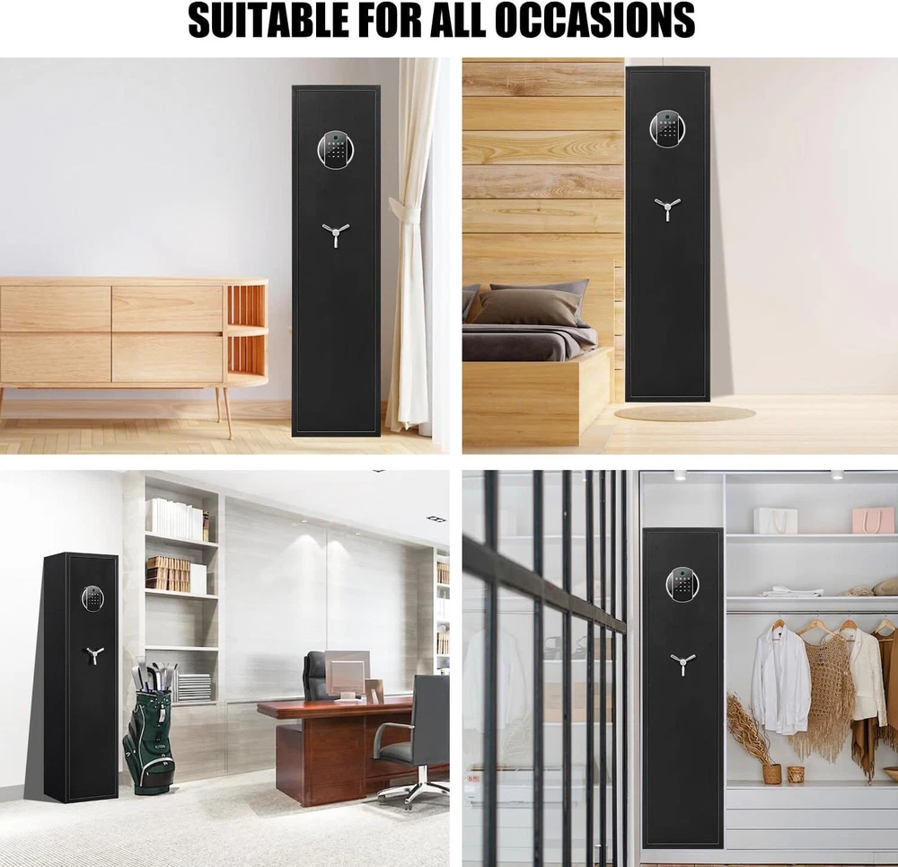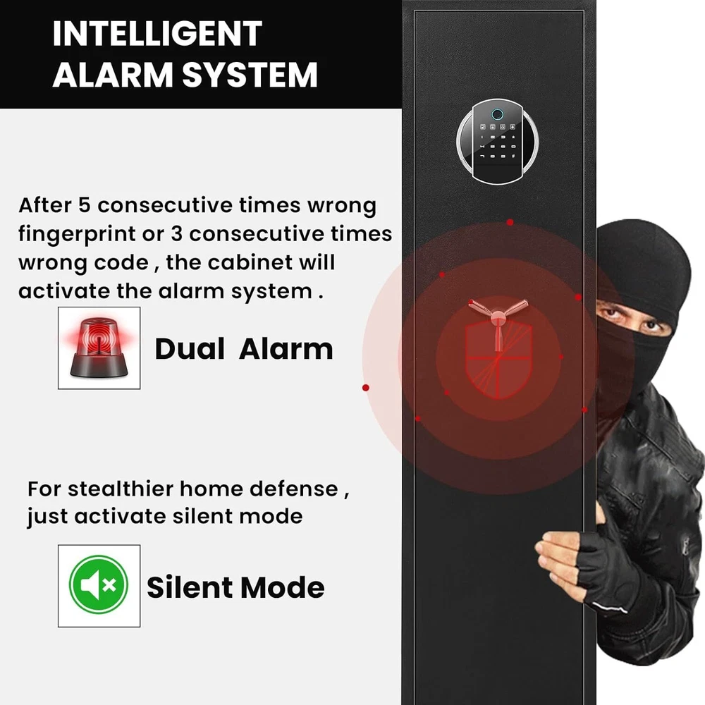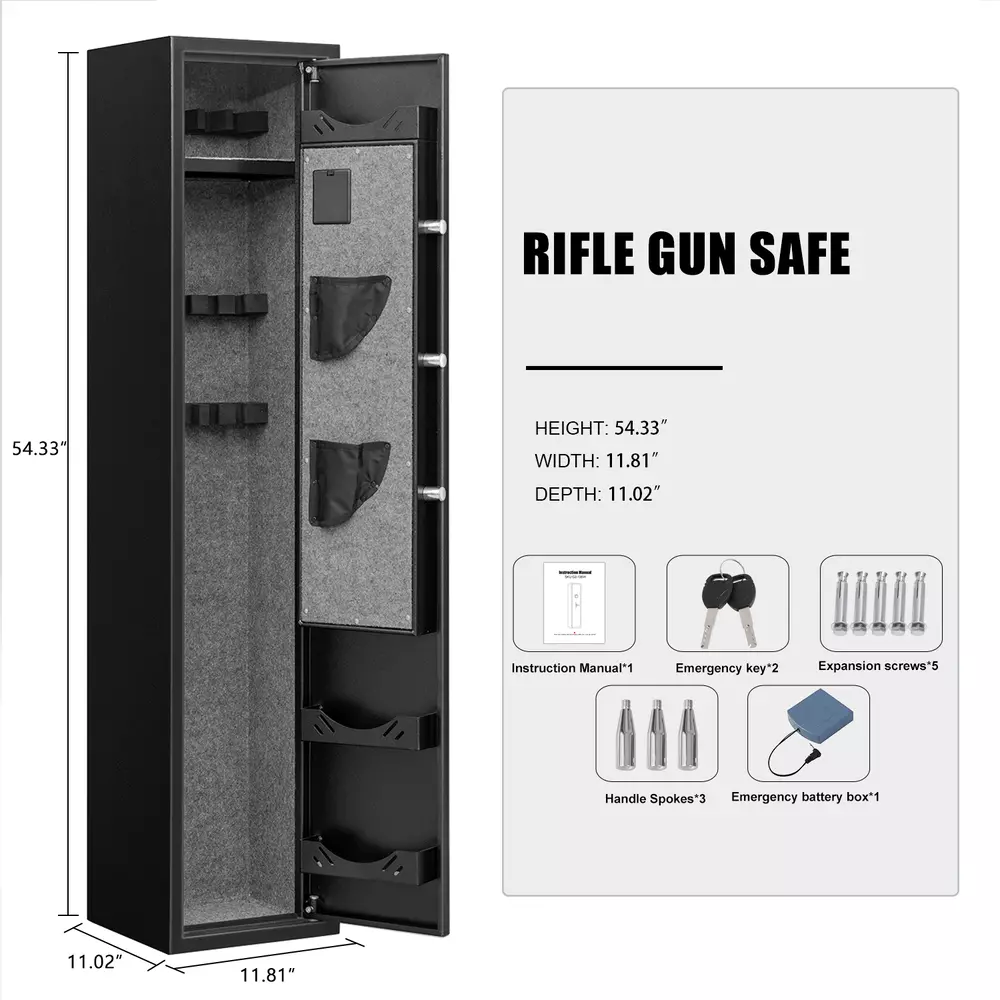 【Quick Access Biometric Gun Safe】 Our gun safe are designed for quick access with instant biometric analysis of your fingerprint. 0.1s unlock, you can quickly open and access when you need it. 【Higher Level of Security for Your Firearms】This Heavy Duty Rifle Gun Safe built with low carbon alloy steel, 5 solid locking bolts system on three sides helps prevent tampering. This gun safe for guns can prevent little ones and unauthorized persons from being accessing your guns. 【Larger and Deeper Gun Safe for Rifle and Pistols】 Exterior Dimensions: 11.02"D x 11.81"W x 54.33"H. Our rifle safe holds handguns and up to 3-5 rifles, it comes with removable shelves inside, depending on the length of your rifle, you can install the shelf as your need. 3 Pistol pouches are equipped on the gun safe's door for pistols. Our gun locker also has separate inner locking boxes for storing bullets, pistols, money and other valuables. 【Anti-tampering Alarm System and Mute Mode】 If the wrong fingerprint is inputting 5 times or password is inputting 3 times in a row, our long gun safe will activate the alarm. You can also press"*" and "9" to activate the vibration alarm mode manually. If the gunsafe is shaken, it will give an alarm immediately. During the alarm period, you can enter the right password to cancel the alarm. If you don't want the gun safe to make a sound, you can press"#"and press"1"to turn on Mute Function. 【4 Ways to Open】Our gun safe for rifles and shotguns features hidden keyhole and backlit keypad. This gun safe fingerprint features 4 different methods of securing and accessing your firearms.① fingerprint + handle(quick access); ② password + handle(quick access); ③ emergency key + handle(used for the first time, forgotten password or battery dead); ④ emergency battery box + fingerprint/password + handle(battery dead). Please don't lock the emergency keys in the gun safe. 【Complete Accessories】1 x Rifle Gun Safe, 2 x Emergency Keys, 2 x inner cabinet Keys, 5 x Mounting screws, 1 x Emergency battery box, 1 x Instruction Manual. The shotgun safe comes with pre-punched holes in the back and at the bottom, you can easy mount the clearance gun safes on the wall or floor use necessary hardware. 【24/7 Customer Service and Lifetime Key Matching Servce】 Our experienced customer service team will respond within 24 hours and solve the problem for you! If there are any problems with the safe rifle or your key is lost, please feel free to contact us.