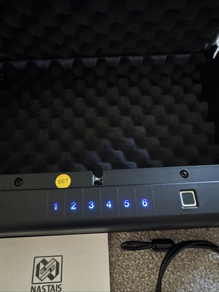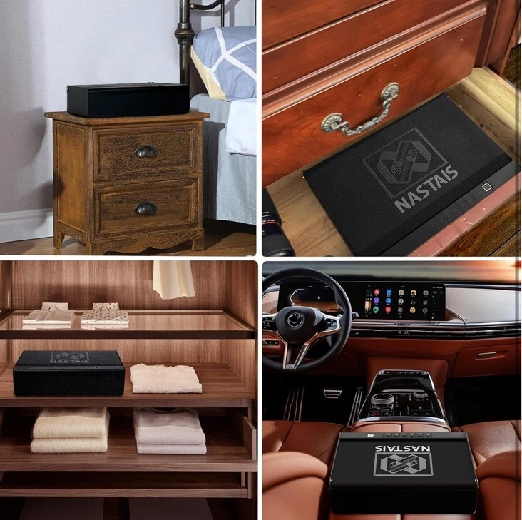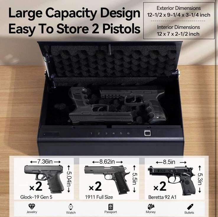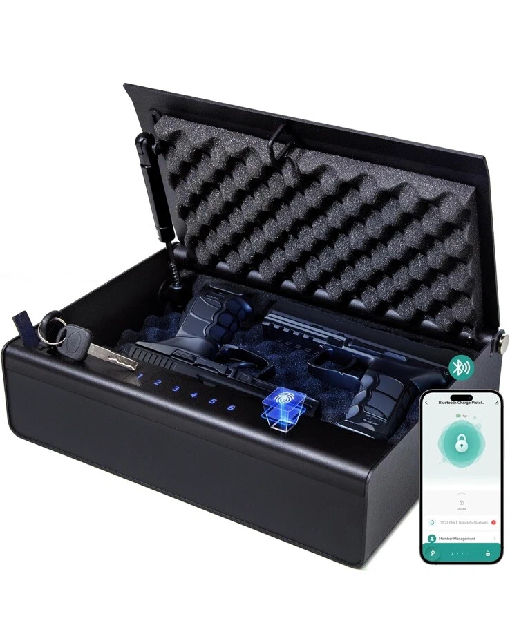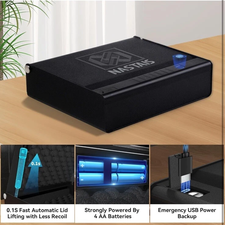 4 Ways to Qiuck Access: NASTAIS gun safe realizes quick unlocking by mechanical key, digital password, biometric fingerprint and APP to meet various scenarios, making gun access more flexible and ensuring safety in dangerous moments. APP Smart Unlock: The pistol safe connects to the cell phone through Bluetooth, thus realizing APP intelligent management. Not only can you remotely control the switch, but also get the dynamics of the pistol safe in real time through APP. Additionally, the Bluetooth connection uses end-to-end encryption to prevent unauthorized access to your information, and the app also does not store personal data. Our commitment to your security goes beyond physical protection and includes protecting your personal information every step of the way. Biometric Fingerprint Unlock: Gun safe box SWISS FPC semiconductor fingerprint identification technology to achieve Biometric identification less than 0.1S, with a recognition rate of greater than 98%, providing vital security when you need it most, fast. The fingerprint lock can store up to 20 user fingerprints for access by multiple users. USB Powered and Quite,Visible Operation: The pistol safe is equipped with 4*AA batteries and a low-power chip to keep you in the know with the low-battery reminder function, and can also be powered via an external USB port to ensure uninterrupted security. The gun safe also features a silent mode for silent access, plus integrated LED lighting further improves visibility in dimly lit environments, making it simple and safe to access your firearms or valuables even when it's late at night. Extra Large Capacity Design: The gun safe securely stores 2 standard handguns and extra ammo. Exterior Dimensions: 12-1/2 x 9-1/4 x 3-1/4 inch, Interior Dimensions: 12 x 7 x 2-1/2 inch, fit in bedroom nightstand cloakroom car. Sturdy and Security: Constructed of sturdy alloy steel, the gun safe features a pry-resistant door that provides high-strength security to keep your firearms safely stored away from unauthorized access, and comes with two pre-drilled holes and sturdy steel cables for mounting to ensure maximum protection against theft and intrusion. Feel secure wherever you install your gun safe.