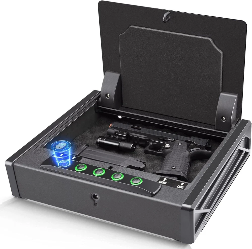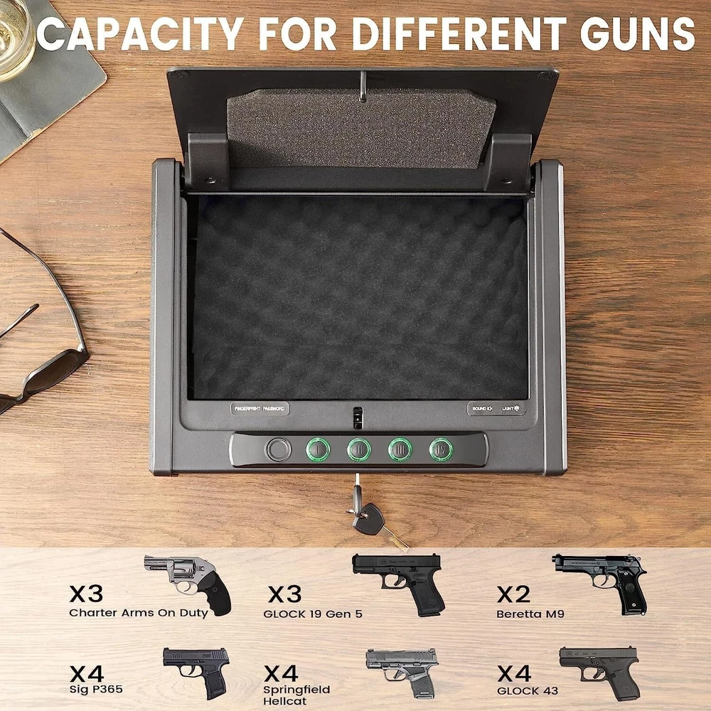 Biometric Fingerprint Gun Safe for 3 Pistols Safe DOJ Certified with 3 Quick Access Handgun Safe Product Dimensions 10.6"D x 14.1"W x 3.2"H Lock Type Electronic, Key Color Biometric & Frosted Black Capacity 0.17 Cubic Feet Material Alloy Steel 【DOJ Certified, Not All Safe Can Pass】: The safety of users is our eternal pursuit. SOULYI gun safe meets the most rigid safety standards. All tests, picking or manipulating, forced removal inspection, tensile, shock, plug pulling, plug torque, sawing and drop, are approved by California Department of Justice. The DOJ certification tells you that it truly will protect you and your family all the time 【Whole Body Pry-Resistant】: The lid edge slightly larger than the interior box edge, for overlapping perfectly without gap. Interior V-shaped plate of the box body bottom overlapping with lid completely prevents tool penetrating. It's impossible to pry open with hand tools and pistols. It provides secure storage for three standard handguns or one larger pistol and extra ammunition. It Keeps your guns in a reliable rapid pistol safe to prevent gun theft 【Unbreakable Construction】: Besides the thickest solid steel material (box 1.5mm low carbon steel, door sheet 3mm), the rugged stamping surface enhanced toughness to fight most of violent attack or crowbar impact. The reinforcing steeling of the two sides of SOULYI handgun safe also makes the lockbox stronger. Loop the high strength steel security cable around a solid object to fix it. It is great safety assistant during your car travel 【3 Quiet Ways and Quick Access】: Unlock the Swiss upgraded biometric gun safe by registered fingerprint within 0.1 seconds,100 fingerprints capacity. You can set a 3~8 digits password with an electronic keyboard. Separate switches for light OFF and sound OFF help to conceal in the dark to ensure your safety in danger and emergency, and to save power; two spare keys allow you to unlock the vehicle pistol safe traditionally 【Hide Guns Anywhere】: The compact size makes Soulyi gun safe for pistol easy to place in a regular office, bedroom, basement, closet or under car seats, bedside, drawers, in spare tire wells, and other locations. It keeps your guns away from kids, easy to carry to protect your family and yourself anytime anywhere 【Customer Service】If you have any problem, please feel free to contact us as soon as possible. We definitely will do our best to deal with it.