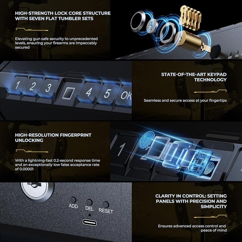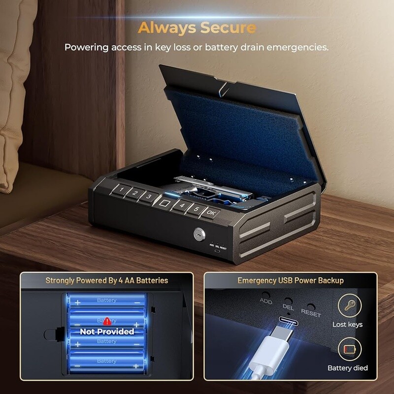 This gun safe is a game-changer—fast fingerprint access, bright interior light, and a sturdy security cable give me peace of mind. The backup power ensures reliability, and the compact design fits perfectly in my nightstand. Highly recommend for quick, secure storage!