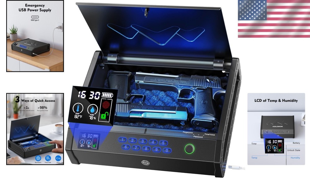 Biometric Fingerprint Gun Safe with LCD Display - Secure Your Firearms Elegantly ‹ › ‹ › ‹ › ‹ › ‹ › ‹ › ‹ › ‹ › ‹ › Biometric Fingerprint Gun Safe with LCD Display Secure Your Firearms Elegantly Features: LCD Display : Stay informed with a clear reading of temperature, humidity, unlock state, battery level, and time. The display lasts for 10 seconds for quick access. Emergency USB Power : In case of battery failure or lost keys, utilize the built-in USB C power supply for temporary access. 3 Access Methods : Effortlessly program up to 100 fingerprints and 10 passcodes. The biometric safe comes with a passcode keypad, biometric recognition, and backup keys for maximum convenience. Solid Security : Equipped with a heavy-duty steel security cable and bolt, this safe ensures your firearms are secure with a pry-resistant door. Mount it easily on a table or in a drawer with two screws. Safety for Children : Protect your loved ones with a portable design, made compact for home or travel. It’s an ideal gift for dads, husbands, grandfathers, and gun enthusiasts. Correct Fit for Two Guns : This safe comfortably holds two standard handguns and extra ammunition. Dimensions: Exterior: 12.6" x 9.84" x 3.15" Interior: 11.3" x 7.2" x 3" Weight: 8.5 lbs Why Choose Our Biometric Gun Safe? In a world where safety and accessibility are paramount, our Biometric Fingerprint Gun Safe stands out with elegance and advanced technology. Its LED display provides essential information at a glance, allowing for precise monitoring of your firearms’ environment. With three reliable access methods, you can gain swift entry while keeping your firearms secure from unauthorized hands. Designed to blend seamlessly into any home or travel context, and crafted with meticulous attention to detail, this fingerprint gun safe not only meets the demands of security but also reflects a commitment to safety and peace of mind. Elevate your firearm storage experience—secure your elegance today! Shipping Free & Fast Shipping - We offer free shipping to most of the USA with a normal delivery time of 3-10 businessdays. However, due to various situations, additional delivery time (up to 3 weeks) may be required for some items. Alternative Carriers - We may use alternative carriers (e.g. USPS, FedEx, UPS, etc.) to ensure your package arrives safely and on time. Due to the use of multiple carriers, we are unable to provide a tracking number automatically. Handling Time - Orders are processed and shipped within 1-5 business days of receiving cleared payment. Shipping Restrictions - Shipping to Alaska, Hawaii, Puerto Rico, Guam, and other US territories may incur shipping charges or delivery restrictions. Please contact us before ordering, or your order can be refunded/cancelled. State Restrictions - There may be restrictions based on your state of purchase. For example, certain items may not be shipped to California due to state regulations. Contact for Tracking Updates - If you require tracking updates or have any concerns about the delivery of your order, please feel free to contact us, and we will be happy to assist you. Return Please see our ebay return policy. We do not accept return on most products. This is to avoid customers mis-using ebay returns. All sales are final. Please be sure to check the return policy listed at the top of the listing. In rare cases, we may accept returns, if the buyer pays both ways shipping and 20% restocking fee. If you are un-sure of return policy of a particular item, please ask before buying. Payment We accept all major credit cards, PayPal, and Apple Pay for your convenience. Your payment information is secure and encrypted to ensure a safe and seamless transaction. Please complete your payment within 3 days of purchase to avoid any delays in shipping. Feedback Your feedback is extremely important to us. We strive to provide the best products and customer service possible. If you are satisfied with your purchase, please take a moment to leave us a positive review. If you have any concerns or issues with your order, please contact us before leaving negative feedback. We are committed to resolving any problems and ensuring your satisfaction. Contact Us If you have any questions or concerns, please feel free to reach out to our customer support team. You can contact us through the eBay messaging system. We are available Monday to Friday, 9:00 am to 5:00 pm EST, and we will do our best to respond to your inquiry within 24 hours. Buy it now and enjoy a pleasant shopping experience! UPC: Not Set Item Height: Not Set Unit Quantity: 8.5 lbs Material: Alloy Steel Features: Portable,Biometric Fingerprint,Combination Lock,Anti-Theft,Pry-Resistant Door,Emergency USB Power,Passcode Keypad,Backup Keys,LCD Display,Temperature Readout,Humidity Readout,Quick Secure Access For Gun Type: Pistol Type: Safe Brand: Unbranded Number of Guns: 2 Locking Mechanism: Biometric Lock Number of Keys: 2 Color: Black Country/Region of Manufacture: Not Set Item Length: Not Set Item Width: Not Set Item Weight: 8.5 lbs MPN: Not Set Unit Type: lb Vintage: Not Set