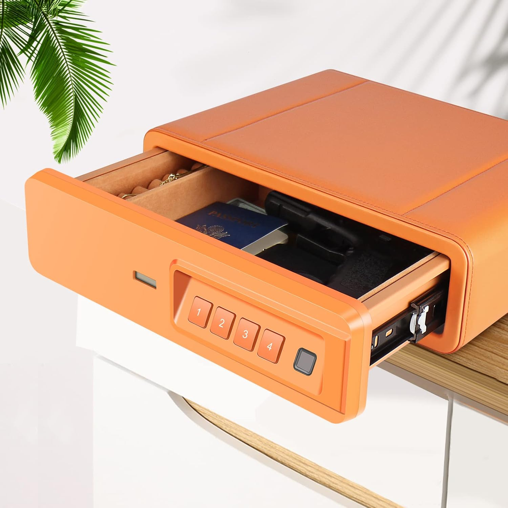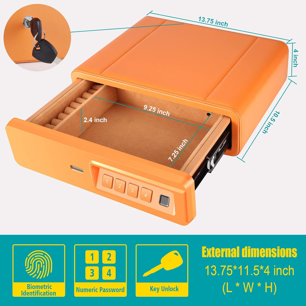 ✅【QUICK ACCESS Biometric Slide-Away Safe 】 QUICK ACCESS to your gun safe and valuables, Jewelries, documents, and firearm(s) from the automatic opening door. Get in quick when it matters most using the rapid backlit keypad, spare key or biometric fingerprint scanner. You can also set the silent mode. It is important function when you have introducer at night or you want to use the safe without disturbing others. ✅【Top-Grade Material, Hight-end Appearance】Made of sturdy, durable leatherette material outer, High-Density soft microfiber lining for safe storage, protect your pistols and Jewelries, and keep your valuable in good condition. ✅【TOUGH AND RUGGED steel construction】 The heavy-duty handgun safe is made of reinforced solid steel wall construction. Built-in hinges and a new internal safety bracket for the maximum prevention against break-ins. Durable powder coating finish preventing corrosion avoid being destroyed and ensure long-term protection of your belongings for years to come. A reliable gun safe pistol safe keeps you and your family away from firearms and protecting your belongings all the time. ✅【INSTANT Biometric / PIN Code and Key ACCESS】For extra-fast 1 second access, a simple touch (of a pre-determined fingerprint) is all it takes. This gun safe can hold up to 20 individual fingerprints, and its touch lifetime is more than 1,000,000 times. INSTANT ACCESS to your valuables, documents, and firearms from the automatic opening door. Get in quick when it matters most using the fingerprint. ✅【LARGE CAPACITY & ANTI-THEFT PROTECTION, 2 Year Warranty】Exterior Dimensions : 13.75" Wx 11.5"D x 4"H. Interior Dimensions 9.25" Wx 7.25"D x 2.4"H, Or interior Dimensions 10.75" Wx 7.25"D x 2.4"H (remove partition). Deluxe quick-access firearm safe for 2 handguns or 1 handgun and some magnizines. Featured on safes includes pry-resistant door, durable dual-layer steel housing and seamlessly welded pry-proof steel body for the ultimate prevention against break-ins. Product Description