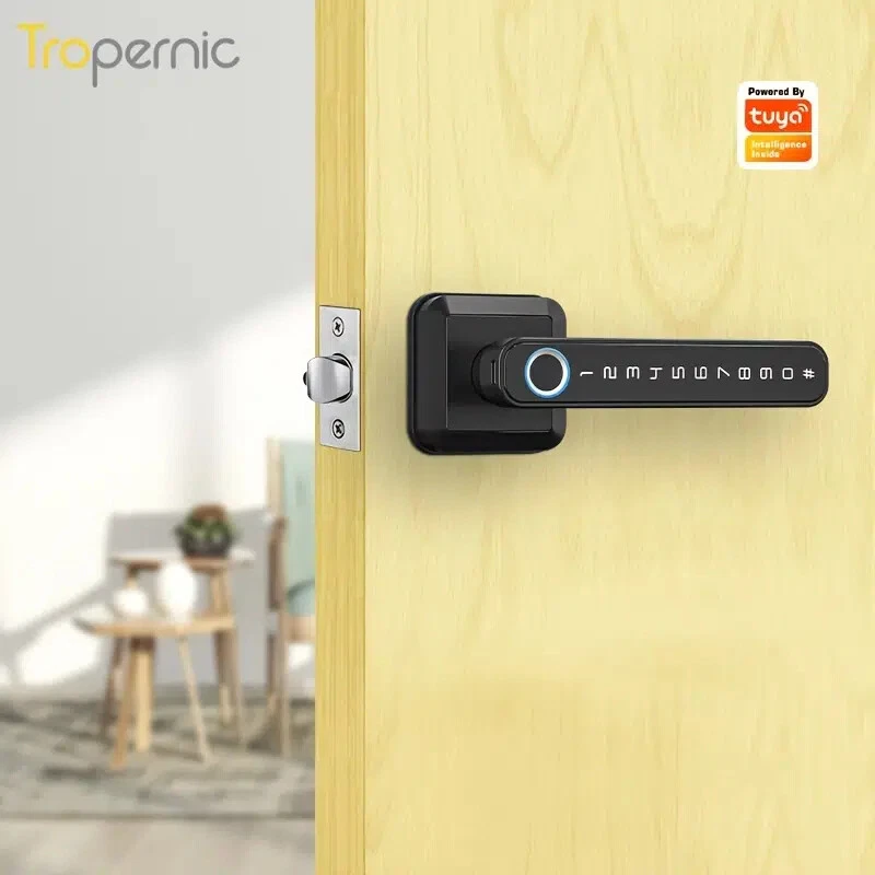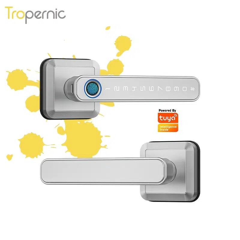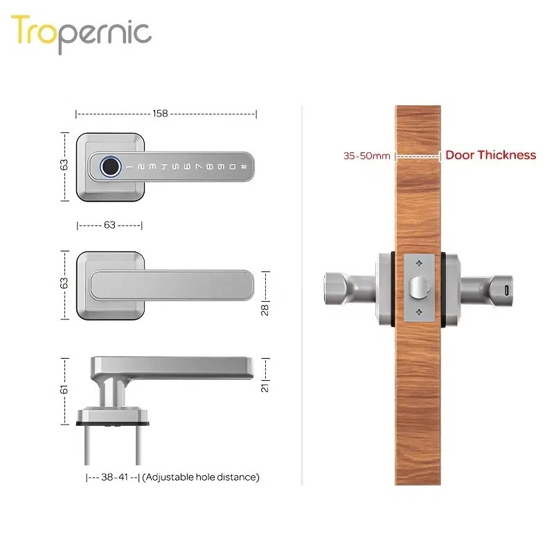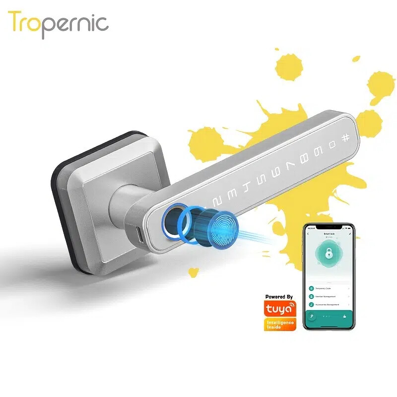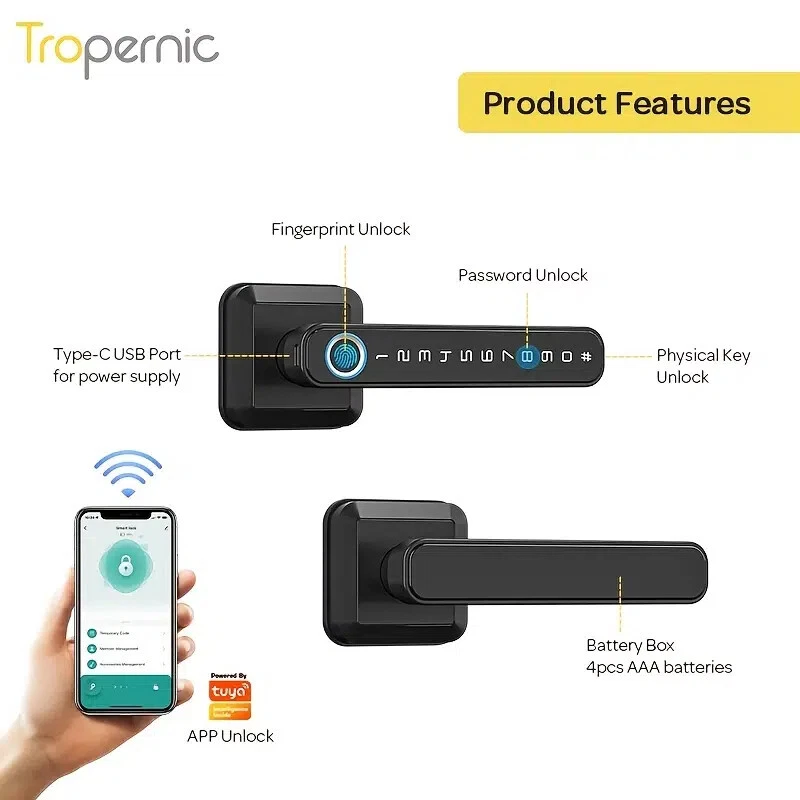 Biometric Fingerprint Digital Keyless Smart Door Lock Handle. Say goodbye to unnecessary locks with this game changing door handle. The door handle comes with an app to download on iOS or Android so you can lock/unlock your door wherever you may be. The handle takes 4 double A batteries which typically last for 6 months before they need to be charged or replaced; Alternatively you can charge up with the included USB-C charger in a pinch. Our handle allows up to 50 fingerprints to use at a time so all your family members can have access. Attach to both right and left door handle door fames Safe and secure for indoor and outdoor use. Size: 142x71x42mm/5.54x2.75x1.65” 5A touch screen, dustproof, waterproof, sensitive touch sensing. You will receive one fingerprint door handle, one instruction manual, and a pack of screws and other tools you will need.