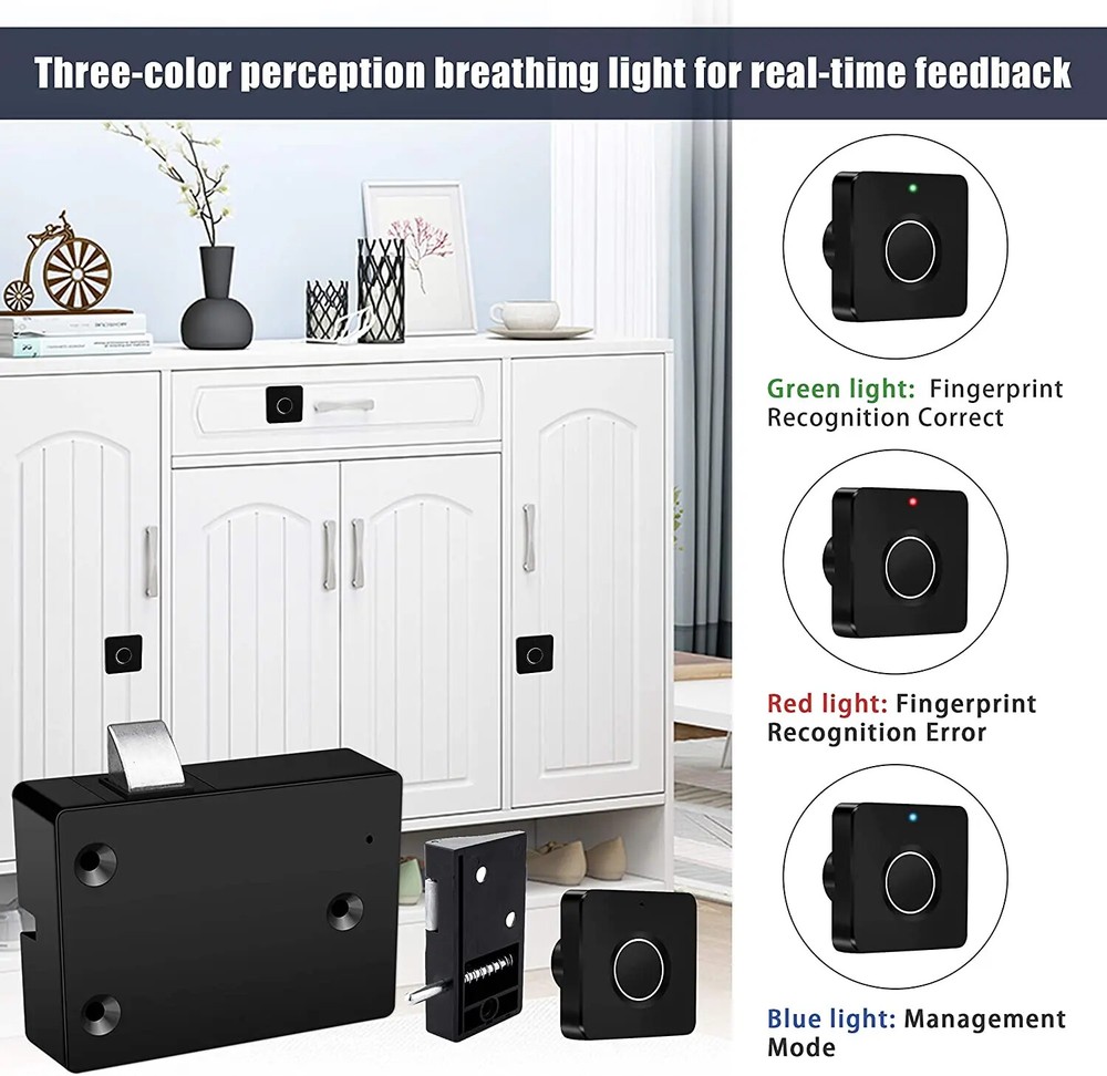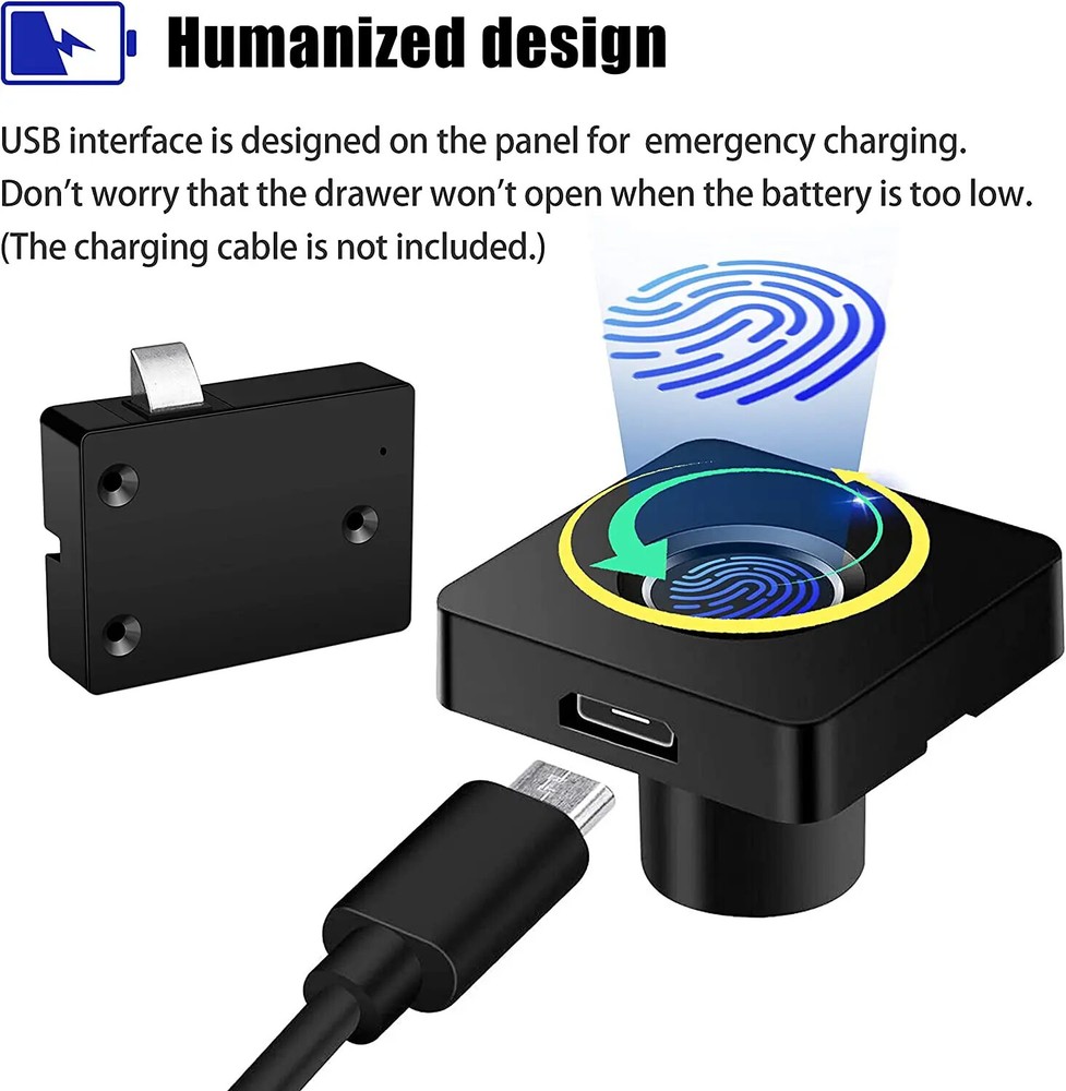 Smart Home Biometric Fingerprint Lock Hidden Drawer Electronic Lock Privacy File Storage Keyless Residential Security Protection About this item: 【Quickly Unlock】Please set the administrator fingerprint information before installation. Professional smart biometric technology with rapid identification function, no key and RFID card. You can use your fingerprint to unlock keyless cabinet lock easily and quickly within 0.5 second. 2 hours charging, it can be used for 180 days. 【Rechargeable Design】The USB emergency charging port is designed on the panel of the cabinet lock, avoid permanent locking when the power of electronic lock is exhausted. Besides, the fingerprint is equipped with a three-color sensing light.(Green-identify correctly, Red-recognition error, Blue - management mode) 【Advanced Life Experience】 The cabinet lock has an embedded AI intelligent chip, which has a self-learning algorithm and an efficient, stable and safe processing system. After each fingerprint identification, the fingerprints will be compared, spliced and recorded. It can effectively improve the recognition probability, and the more it is used, the more sensitive and durable it is. 【Broad Applicability】The electronic fingerprint lock can be widely used in office cabinet, drawer, TV cabinet, wardrobe, bedside table, etc. Applicable places include bedroom, study, living room, office. Say goodbye to the key unlock era! It can record 20 fingerprints and supports multiple people to manage a file cabinet at the same time. 【Easy to Install and Set Up】Store and identify fingerprint information directly, without downloading and installing any App or PC. This electronic cabinet lock with administrator fuction needs to verify the administrator's fingerprint before adding the new fingerprint or deleting all fingerprints. And it is equipped with a decoder. When the lock cannot be opened, there is no need to destroy it. You can use the decoder to delete the fingerprint and unlock.