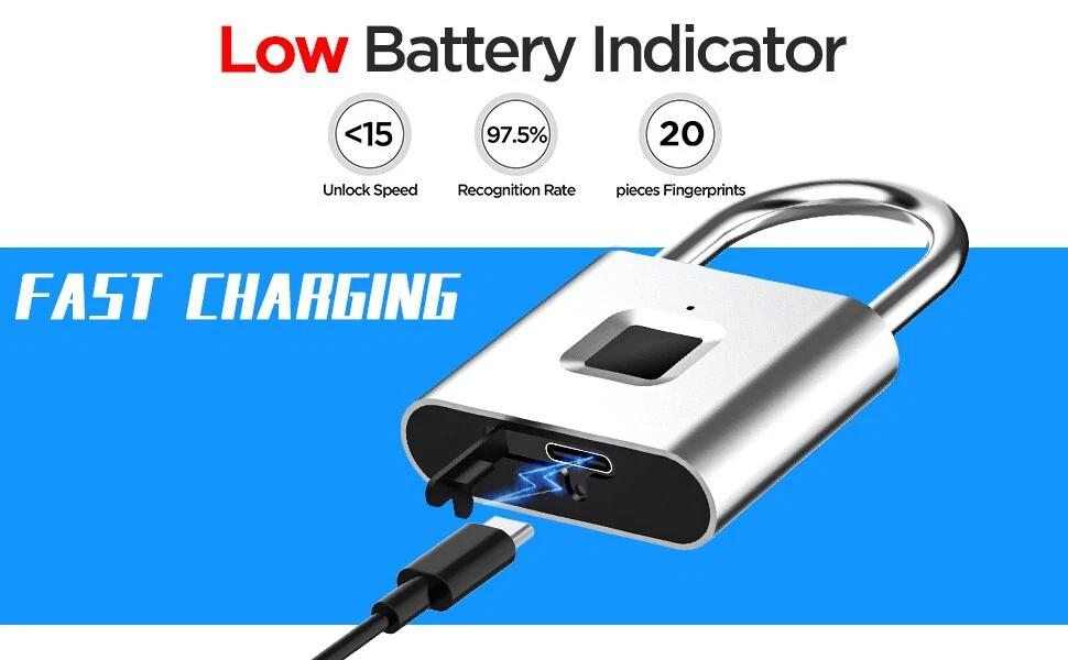 Biometric Fingerprint Padlock Rechargeable Keyless Lock Waterproof Smart Locker Specification: Color: Silver Model: G1-2 Material: Zinc alloy Lock Size: 46*40*16mm Lock beam diameter: 5mm Fingerprint shape: Square Fingerprint capacity: Record 20 groups LED light: Three color light: red / blue / green Battery: 3.7V lithium battery Working voltage: 3.0-4.2V Charging + Emergency: USB interface: Micro-USB Low battery alarm: 3.5V Life time: Half a year Working temperature: -10 ℃ ~ 50℃ How to delete all fingerprints (Reset to Factory Mode) Delete by administrator's fingerprint(s) only (1)Place the administrator's fingerprint (the first two fingerprints) on the reader and hold for 10 seconds till LED flashing red. (2)Release and place it again to confirm delete all registered finger prints. (3)LED lights on green with a long beep di--, all fingerprints deleted,your padlock restored to factory default status:any fingerprints can open the lock. Features: It is easy to operate, stores up to 20 fingerprints, and is managed directly in the smart lock. Sturdy and Portable: Zinc alloy metal body construction protect your cabinet or your home against thieves. Applicable situations: Small and lightweight fingerprint locker for indoor outdoor use, widely used in luggage suitcases, golf bags, handbags, school lockers, gym locker lock, furniture, wardrobes, bike and other goods that you want to protect. And it can entry 20 sets of fingerprints, convenient for private usage ,also suitable for the whole family usage. The lock locker adopts the advanced fingerprint identification chip, Quick unlock in 0.5 seconds. It can collect up to 20 fingerprints total, easy to use. The USB rechargeable 150mAh lithium battery can support up to 12-month of standby time. 2 hours for full charge, it can unlock more than 9,000 times. it meaning 6-12 months you not worry itout of battery. IP67 waterproof, rust resistant and anti-erosion. Smart Fingerprint Lock: Never worry about losing your key or forgot passwords. Forget the cumbersome numbers, your finger is your key. This fingerprint padlock has 360 degree fingerprint acquisition function and only unlock for 1 second and quickly identify biometric locks to quickly identify your fingerprints. Low Power Alert: The Padlock blinks red for 15 seconds per minute or blinks red and beeps while unlocking if battery on low power status, please recharge it by universal USB DC 5V/0.5-1A adaptor or a Powerbank. Package included: 1 x Smart Fingerprint Door Lock Padlock 1 x USB-Micro Charging Cable 1 x User Manual Payment Delivery details Return Policy Contact us Working time Payment 1. Please make sure your address is correct before you pay. 2. If you wish to cancel your order after payment, please contact us via eBay message and we will help you cancel the transaction. Note: All orders cannot be stopped and canceled after 7:00 AM EST. Please check the model number and color of the item you are purchasing before making payment, thank you! Delivery details 1. All items will be checked and shipped within 24 hours on business days after full payment is received and confirmed by Paypal. 2. We will ship the package via USPS First Class. Normal delivery time is 3-6 business days, depending on where you live. 3. Alaska, Hawaii, APO/FPO/DPO and U.S. Protected Areas may take longer and delivery times may be affected from time to time by factors such as operating conditions, weather conditions, or security issues. 4. This item will only ship to addresses within the United States, APO/FPO/DPO and U.S. Protectorates. If your shipping address is outside of the United States, please contact us via eBay message. 5. Sales tax is collected by eBay and the seller is not responsible for paying sales tax. Note: All orders cannot be stopped and canceled after 7:00 AM EST. Please check the model number and color of the item you are purchasing before making payment, thank you! Return Policy 1. We will be responsible for any damage or loss incurred during shipping. 2. If you have any problems with the product, please take a picture and send it to us via ebay mail immediately. 3. Please tell us the details of your problem so that we can contact the supplier to deal with it. 4. Under normal use, if the product is damaged and there is no way to repair it, we will unconditionally give you a full refund or replace it with a new product once we confirm your situation. Contact us 1. We have a store in New York, fast delivery, after-sale guarantee, to provide you with satisfactory service. 2. After receiving the payment, we will leave you a positive feedback, thank you for your support. 3. If you have any problem, please contact us through ebay message first, instead of go to the solution center or leave negative feedback at once, we will solve the problem with our supplier and reply you and provide solution within 24 hours after receiving your message. Thank you for your trust! 4. If you are satisfied with our store, please leave positive feedback and favorite our store, we will send coupons to our customers from time to time as a way to thank our fans for their support. Working time Working Time: -9:00 a.m. to 18:00 p.m. ( US ) from Monday to Saturday -Closed on Sunday and American Holidays. All eBay messages will be replied to within 24 hours of the message being delivered, we appreciate your patience!