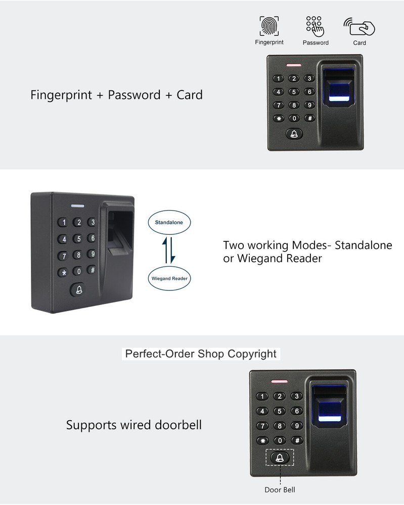 Biometric Fingerprint+RFID Card+Password Door Access Control Keypad Wiegand Great Access Keypad f or better protection , Easy Operation Description: Access control system enables you to control who has access to what areas in your home, office and/or business. This is a complete standard kit to control door access with RFID cards and/or PIN. Perfect for home, office environments, factories and more. Main Features: 86mm box structure, easier installation Independent internal control for electric locks, exit buttons and door magnet detection Capacitance induction type for fingerprint collector, standby and sleep mode functions Wiegand signal output, compatible for all standard access controllers; without software. Support entry modes: Password Only / RFID Card Only / Password + RFID Card Easy to install and program Classical design with modern and fashion. 100% Brand new with High quality and high security. Specification: Hardware Platform: ARM9 Fingerprint Collector: Inductive & optical blue-ray fingerprint collector Fingerprint capacity: 500pcs ( 1000pcs, 3000pcs optional) Password capacity: 500 groups Administrator Function: 2 groups of register supported, 2 groups of delete supported Card reading module: standard 125KHz RFID ( 13.56Mhz IC optional) Wiegand: Wiegand 26 Power Supply: DC12V; Recognition Speed: < 1 second LED: red, blue Alert Tone: buzzer Alarm: anti-dismantle, force door open, overtime door open Working Humidity: 20%~80% Dimension: L87xW87xH25mm. 3 Ways Entry Modes: Password/ RFID Card / Password+RFID Card Package Include: 1 X Waterproof Door Access Control Keypad in retail Box . 1 X English Manual. 1 x Unlimited customer service. Why use access control? Access Control System is designed for areas where need for security is crucial. It protects human life, property and information and provides safe and comfortable environment by limiting unnecessary access to essential areas such as office, building, factory, R&D Center and more. The most common access control example in the business world appears when walking into your office and showing proof that you are authorized to enter. It prevents any possible danger or interference from the outside, which helps to maximize work productivity and increase your home/office security. Our Real Projects : Buy with Confidence!!! Excellent Quality! Great for your home and security! Payment: We accept PayPal. Please leave note when making the payment if you have any special request. Shipping Information: 1.PACKAGE SHIP TO Most countries of the worldwide. 2. Package will Ship by Airmail Package with tracking number to worldwide. Warranty information: 100% Satisfaction guaranteed or your money back Since we appreciate our customers, we provide 100% Money Back Guarantee. 100% Money Back Guaranteed for 30 days. Feedback Policy: Your Satisfaction is our main goal and your feedback is very important to us. We want our customers to be 100% satisfied with their order. If you are not satisfied, please let us know before leaving feedback. When you receive your order, please take a moment to leave us positive feedback and 5 stars rating to us is appreciated, vital and very valuable to the continued success of our business.