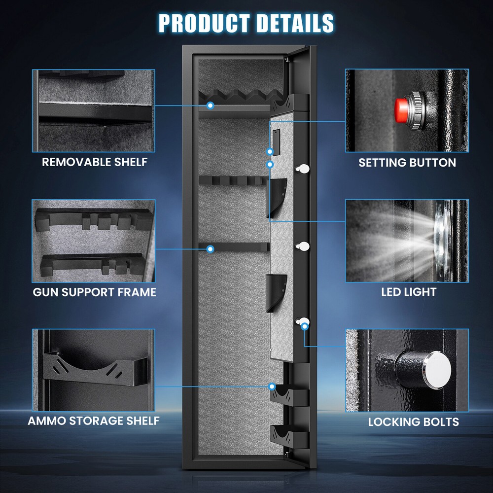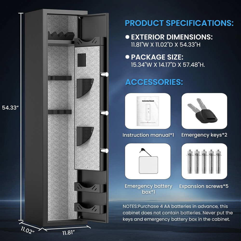 【Quick Access Gun Cabinet】 The numeric keypad allows you to program it with your own code for quick firearm access during emergencies. It can store 2 sets of digital codes, and the code memory function ensures that your code will not be lost when the batteries drain. 【Dual Alarm System & Mute Function】 If you enter the wrong code 3 times in a row, your safe will activate the alarm system. Besides, if the gun cabinet is moved violently, a vibration alarm will be triggered. You can enter your code to open the door to cancel the alarm. If you don't want the gun safe to make a sound, you can turn on the Mute Function. 【Adjustable Gun Rack & Ammo Storage Shelf】 Gun safes for home guns and pistols with adjustable gun racks and pistol racks. You can adjust the gun rack according to the length of the gun. There are also 2 pistol bags and 3 ammo storage shelf on the door for storing pistols, ammunition, firearm accessories and more.Gun Type:Most guns 【3 Ways to Open the Door】 There are 3 ways to open the door:1. Code + Handle (Daily Use) 2. Emergency Key + Handle (First opening, forget the code or the batteries drain) 3. Emergency battry box + Code + Handle (Batteries drain) 【Complete Accessories & Excellent Customer Service】 Includes: 1 x gun safe, 2 x Emergency keys, 5 x Expansion screws, 1 x Emergency battry box, 1 x Instruction manual. We offer 24/7 customer service, lifetime warranty service and lifetime key matching service. If there are any problems with the gun safe, please feel free to contact us.