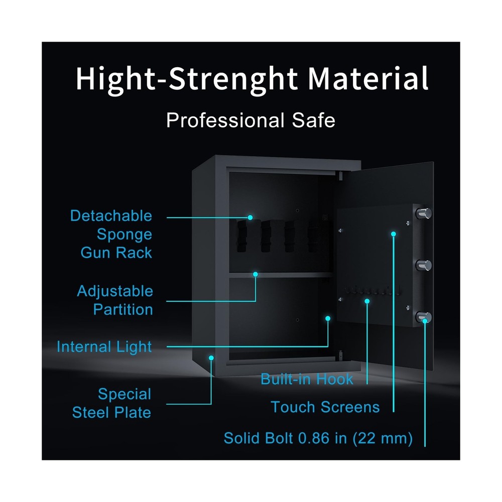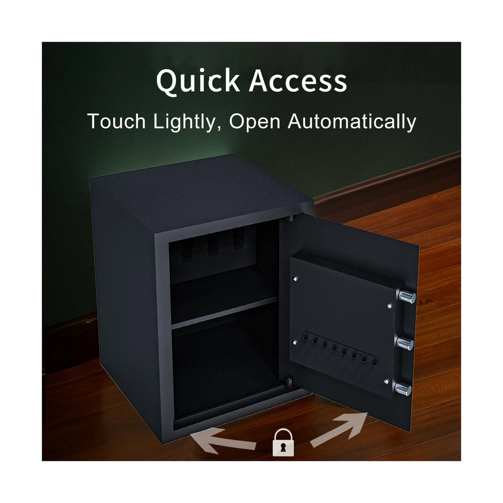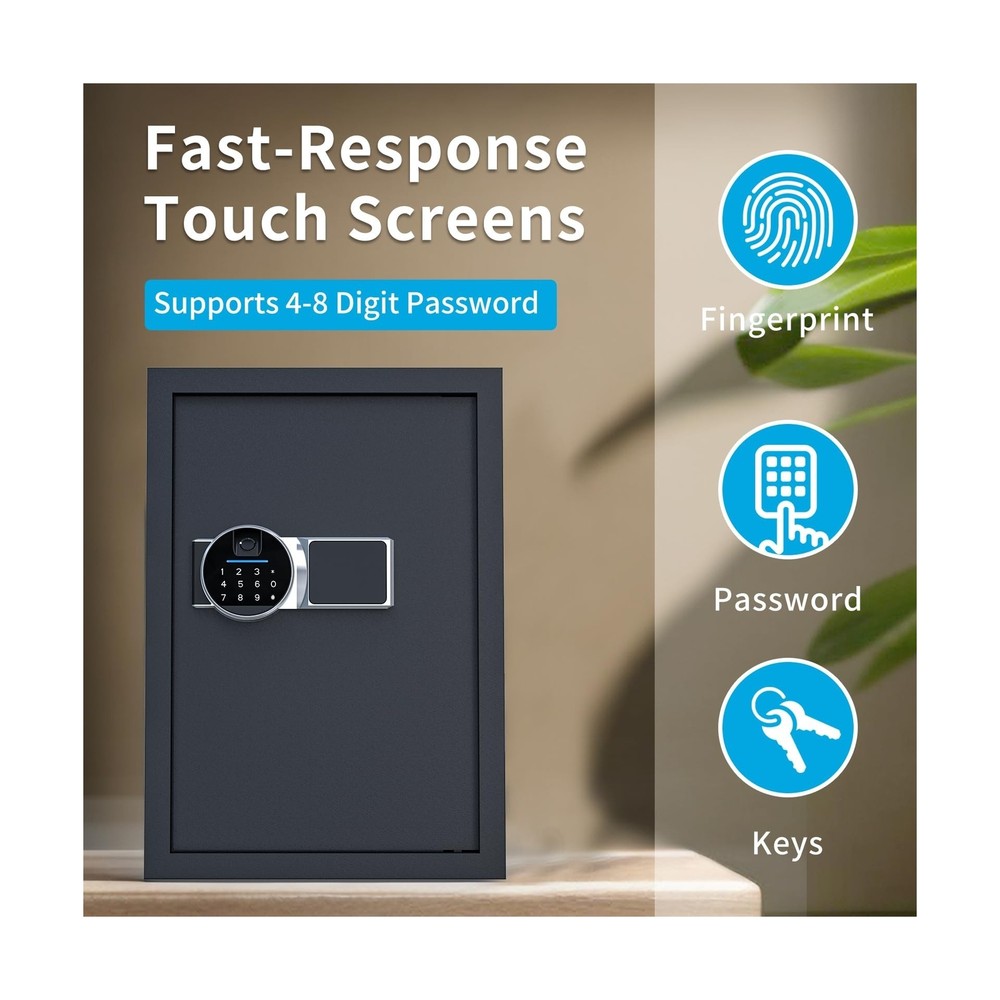 Biometric Fingerprint Safe Box, 1.69 Cubic Feet Smart Safes Modern Minimalism Design Touch Screen Safe with Digital Virtual Password Steel Security Money Safes Lock Box for Home, Wardrobe, Office Product Details Size: Large (19.69x13.78x12.99) Color: Black Brand: JNOSFL MPN: Does not apply UPC: Does not apply EAN: Does not apply Brand: JNOSFL Product Dimensions: 12.99"D x 13.78"W x 19.69"H Lock Type: Biometric, Key Color: Black Material: Alloy Steel Special Feature: Fingerprint Sensor Mounting Type: Freestanding, Tabletop Included Components: Keys Water Resistance Level: Not Water Resistant Brand: JNOSFL Product Dimensions: 12.99"D x 13.78"W x 19.69"H Lock Type: Biometric, Key Color: Black Material: Alloy Steel Special Feature: Fingerprint Sensor Mounting Type: Freestanding, Tabletop Included Components: Keys Water Resistance Level: Not Water Resistant Manufacturer: JNOSFL Item Weight: 38.2 pounds Country of Origin: China Size: Large (19.69x13.78x12.99) Style: Modern Special Features: Fingerprint Sensor Batteries Included?: No Batteries Required?: No Date First Available: October 24, 2023 Robust & Secure: Our home safe, constructed from reinforced solid steel, offers physical protection against forced entry, ideal for safeguarding valuables at home or office. Spacious & Organized: This fingerprint safe features a large capacity with a removable shelf, offering flexible storage solutions for various items, from cash and jewelry to documents and electronics. High-Precision Biometric Access: Jewelry safe features a 508DPI biometric fingerprint sensor, capable of registering up to 50 fingerprints, providing quick and reliable access. User-Friendly: With easy setup for fingerprint and digital passwords, the finger print safe can be opened using a fingerprint, code, or keys, ensuring accessibility even in case of a battery outage. Payment Back to Top We accept Paypal and All Major Credit Cards. Shipping & Handling Back to Top Item will be shipped FREE standard shipping in 1 business day after payment is received. Express Shipping services are available. Tracking number will be provided. Return Policy Back to Top Items can be returned for exchange or full refund within 30 days from the date you receive your merchandise. Please contact us before starting a return request, so we can resolve any issues and provide free returns if needed. Return shipping is the responsibility of buyer unless the return is a result of our mistake (i.e., your receive the wrong item). Contact Us Back to Top If you have any questions please contact us. We will respond within 1 business day or less.