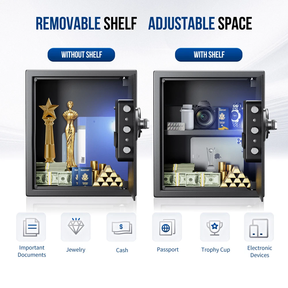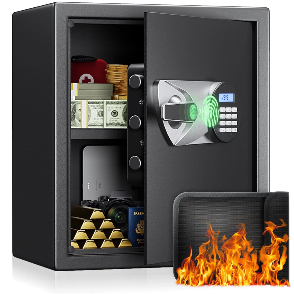 Similar Items Description Package included: 1x Biometric Safe Box 1 x Type-C Cable 1 x Fireproof Bag 2 x Backup Keys 4 x AA Batteries 1 x User Manual Description: Brand:BlackSmith Product Dimensions: 1.5 Cubic Feet:13"D x 13"W x 14.17"H 2.1 Cubic Feet:12.2"D x 13.78"W x 19.69"H Lock Type:Biometric, Electronic Combination Lock, Key Color:Black Material:Alloy Steel Special Feature:Dual Alarm System, Biometric Fingerprint, Sensor Light, Anti-Theft, Removable Shelf Mounting Type:Wall Mount & Floor Mount Control Type:Fingerprint, Keypad, Key Feature: Storage space: Includes a removable shelf for organizing documents, jewelry and other valuables. Soft carpet inside to prevent scratching. Handle-style fingerprint unlock with a 160x160 pixel sensor and 508 DPI scanner. Enjoy quick access in just 0.1s by simply pressing your finger while holding the handle. Stores up to 50 fingerprints. 10-digit keypad with an LCD display provides multiple number combinations for enhanced security. 2 spare keys and a Type-C power supply ensure easy access to security safe box, even in emergencies. Dual alarm system deters unauthorized access. An alarm activated with continuous wrong fingerprint or password entries, or violent vibrations. Mute function provides better privacy. Pre-drilled holes allow for easy wall mounting. 16-gauge alloy steel for added strength. Features 3 solid steel lock bolts, pry-resistant concealed hinges, and a recessed door for enhanced protection against forced entry. Automatic LED light ensures easy access, even in the dark. #divSKUDetail2 Detail Image Payment 1.We accept Payoneer、PayPal、Mastercard、VISA、Google Pay 、American Express etc. 2.All major credit cards are accepted through secure payment processor. 3.Payment must be received within 7 business days of auction closing. 4.We ship to your eBay or payment address. Please make sure your eBay and payment address is correct before you pay. Shipping 1.We ship to your eBay or Paypal address. Please make sure your eBay and Paypal address is correct before you pay. 2.Items will be shipped within 1-3 business day when we received payment. 3.Delivery time depends on destination and other factors;