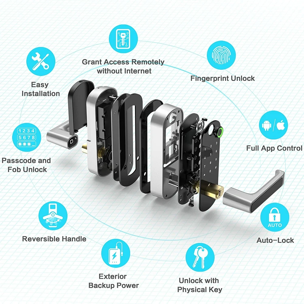 Feature: 【Smart & Secure Door Locks】The keyless smart lock with handle fit for 1-5/16'' ~ 2'' (33mm-50mm)thick door. Reversible handle lock is suitable for both left-handed & right-handed. Totally you can manage 200 of user code, built-in auto-backlit Touchpad. Ideal new home gifts for the home! 【5-in-1 Unlocking Method】Unlock Hbodier smart door lock with your fingerprint, card, passcode, backup key, security APP. Multiple fingerprints can be set through the APP, bringing you a fast & best secure recognition system. You don't worry about forgetting to bring the key/smartphone. Accurate and extremely responsive unlocking response works perfectly for kids and the elder. 【Guard Your Family Safe】Security with the electronic door lock is much higher than other locks, the automatic door locks could be locked automatically within 5-120s. No worries about forgetting to lock your door ever since. Set the one-time or Customized passcode for guests, visitors, or other people. When entering the password incorrectly more than 5 times, the deadbolt lock will lock for 5 minutes and the admin could track all unlock records by phone in real-time. 【Easy Installation】Detailed installation instructions are included with the package. Even if you don't know anything about the installation principle, just follow each step in the manual to install, and you can get a perfect smart door lock. All installation steps require no additional drills or holes, just a normal screwdriver and the tools included in the package to complete the installation 【Worthy Customer Service Warranty】Our Smart lock App is free to use. No hidden charges or long-term costs. 30-day money-back guarantee, 1-year product warranty, and lifetime customer support following the date of purchase. › See more product details Note: Products with electrical plugs are designed for use in the US. Outlets and voltage differ internationally and this product may require an adapter or converter for use in your destination. Please check compatibility before purchasing. Our security smart lock special design----Safety Anti-peeing Code will increase your security level- only the user can read and unlock the lock. 5 Ways to Key-Free Access To Your Home 9 9.9% Read Fingerprint Identification HBODIER groundbreaking smart lock correctly recognizes registered fingerprint up to 99% of the time when placed correctly on the scanner. and opens your smart deadbolt in just 0.2 seconds. It’s faster and safer than bring for your keys. Also, your "biometric identity" and other personal data are stored locally on the smart lock device so your personal information is never shared. Your mobile phone is your key HBODIER smart Keyless Lock is User Friendly for All Ages, the App lets you set permission levels for everyone in your life. Whether it's 1 Time Use Code for a express service Permanent Code for your Grandpa, Schedule Time Codes for Babysitters, Employees or your guests, you can share 150 temporary codes. - It is simple and secure. Anti-peep Touch Screen Keypad Code The keyless keypad door lock enter up to 12 digits including real code. Add ra ndom digits before or after your real code to protect your passcode from prying eyes. Each finger tap is accompanied by immediate feedback - a quiet "beep" and slight dimming of the pressed number, with backlit lights, convenient usage for day or night. Use IC Card to unlock Don't like codes? The secutriy smart lock come with 2pcs high-performance IC car ds, it is compact, convenient to carry and faster to unlock, setting up IC cards in your smartphone App is extremely easy! That are designed t o unlock your smart locks deadbolt in just 0.2 Seconds after contact. Smarter Home Security Keyless Entry The fingerprint Smart Lock features a hidden compartment for accessing the door lock with standard keys (the old fashioned way). Every lock comes with 2 keys. The keys are unique.This not only improves security, and you don’t have to worry about being locked outside under any circumstances. Low Battery Alert, Unlock in a n emergency Power backup What do you do if the batteries inside the lock die—and you’re stuck outside? Smart Lock feature external posts to which you can use a micro USB cable connected to a power bank, giving you enough juice to get the door open. Prote ct Your Home with 5-in-1 Smart Lock Set New fingerprint door lock with keypad, suitable for both left handle and right handle. Just use the L wrench (include) to remove the hex socket screw and change the direction. It comes with abundant accessories and batteries, and also with AUTO LOCK function, great smart home devices for home, apartment, hotel. Important Installation Tips 1. Please Note the L/R side has different install method. 2.Please note you are setting the corret direction for toggle button(L/R). Otherwise it will be backwards. 3.If you can't use the APP or keypad to control unless insert a key(lock is stuck), please help to check: re-install after rotate the spindle by 90 degree.