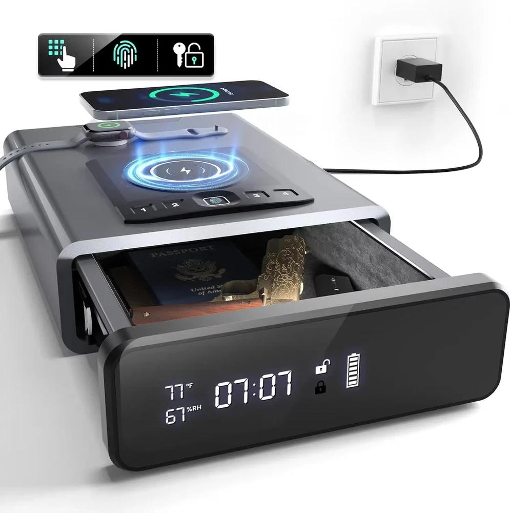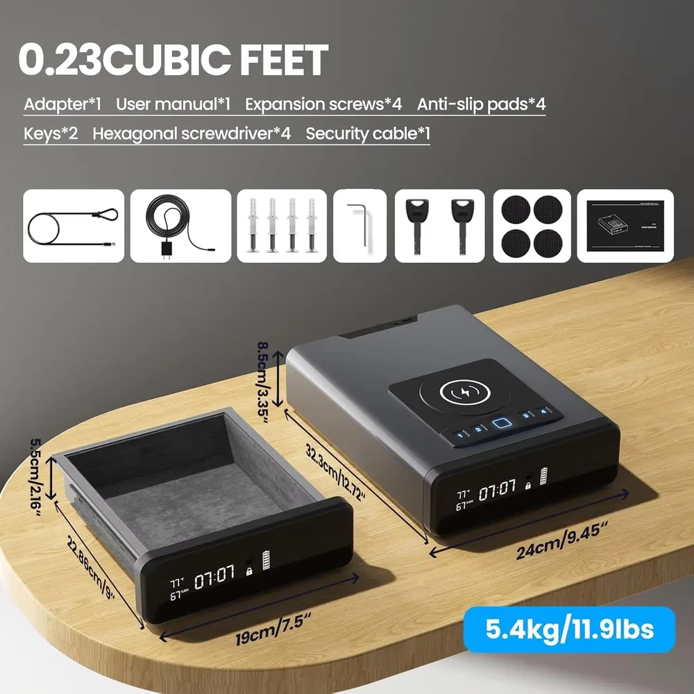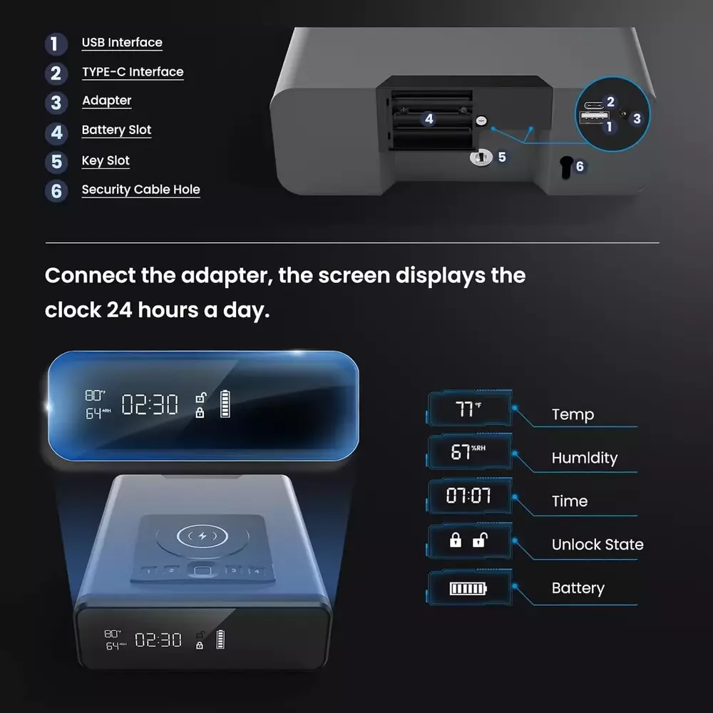 Details: Features a clock display with an LED screen that shows time, humidity, temperature, battery level, and safe status. Includes a 2-in-1 wireless charging station for compatible smartphones and smartwatches when connected to an adapter. Equipped with a high-resolution biometric fingerprint scanner with a fast response time and high accuracy. Backlit silent touchscreen keypad supports 4-8 digit passcodes with 87,290 possible combinations. Built-in LED light for quick access in the dark; silent mode available by holding the "1" key. Compact size with durable alloy steel construction for secure storage. Includes two keys, a security cable, an adapter, non-slip rubber feet, and an expansion screw kit for multiple mounting options. Terms & Conditions: Restocking fees may apply. All unpaid items will result in an automatic unpaid item case (eBay Customers). Product(s) will NOT have an included warranty unless otherwise stated in the item specifics category. All paid-for items will ship within the next business day (Holidays excluded). International purchases may be subject to customs fees from the country you are purchasing from. If you are unsatisfied with your purchase, please direct message us first before leaving feedback. Allow us the opportunity to resolve the issue. Thank you.