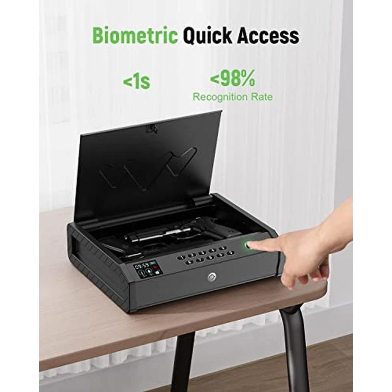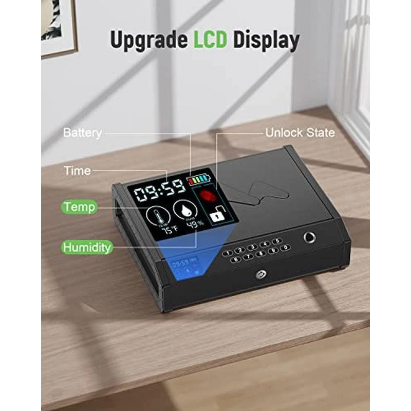 About this item LCD Display of Temperature & Humidity Time, Battery, Unlock State: You can accurately and quickly know pistol safe of temperature & humidity, it is very helpful for the maintenance of guns and weapons. Also you will get the unlock state, battery level & time in real-time, you can set your time. The display stays on for about 10 seconds. Solid & Security: The handgun safe is made of solid steel and a pry-resistant door for strength, with a reliable high-strength locking mechanism and precise fittings. The heavily built case is solid and comes with a 40. 16" steel security cable that allows you to connect the gun safe anywhere. 2 Screws help fix the safe on the table or in the drawer. It is great for secure your firearms from kids and smash/grab type home robberies. Easy to Set Up & 3 Ways to Open: With the smart biometric fingerprint, passcode keypad, and emergency key. It is easy to program the full 10 digit numeric keypad and your fingerprint. The fingerprint access allows for reaching your firearms within 1s, which can save you more time when you're in danger. The biometric gun safe for handgun can hold up to 100 fingerprints, large size fingerprint scanner can read your stored fingerprint from any angle that finger is placed on the surface. LED Light & Silent Mode: The internal LED automatically turns on when the lid opens. No fumbling around in the dark, it stays on for about 10 seconds. The biometric safe offers the ability to silence the beep by setting, which is critical in an emergency. Will not give an intruder the foreknowledge that you're pulling out a weapon or let the beep give away your location. Correct Fit 2 Guns Ammo: The handgun safe for nightstand can securely hold 2 standard handguns and extra ammo. Comes with steel cable to easy attach anywhere inside the vehicles, office, bedroom, basement, closet, bedsides, and drawers. Exterior Dimensions: 12. 59" x 10. 27" x 3. 18" Interior Dimensions: 11. 41" x 7. 87" x 3. 18";Weight: 8. 5lbs. The fingerprint gun safe would be a great gift to your dad, husband, grandpa and gun lover. Brand:HOLEWOR Product Dimensions:9. 84"D x 12. 6"W x 3. 15"H Lock Type:Biometric, Electronic Combination Lock, Key Color:Black Capacity:8. 5 Pounds Material:Alloy Steel Special Feature:LCD Intelligent Display of Temperature Humidity Time, Battery, Unlock State, 3 Ways quick access - biometric fingerprint, numeric keypad and emergency keys : : :