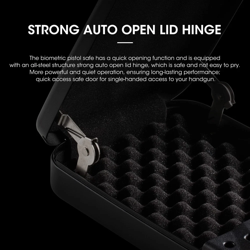 VERSATILE & QUICK ACCESS DESIGN -The gun safes for pistols equipped with Stainless steel spring and AI biometric fingerprint technology, which ensures single-handed quick access to your firearm devices in an emergency condition. With its LED light feature, the pistol lock box is very suitable for use at night. The bottom of the gun case has pre-drilled holes that can be fixed with screws to the drawer or wall to provide higher security. AI IDENTITY AUTHENTICATION - The fingerprint sensor of biometric gun safe for handgun is upgraded with the advanced AI tech and self-learning ability enabling accurate identification that's 30% higher than the ordinary fingerprint sensors of a regular handgun case in the market. EMERGENCY POWER USB PORT - This car gun safe comes with an integrated emergency USB port on the side of the keyhole for connecting power to unlock the case quickly during emergency out-of-power conditions and when the back-up key is missing. REINFORCED ANTI-PRY FEATURE & ALARM - This small gun safe for handguns is made of a precision-formed 16-gauge rugged steel enclosure. It comes with a security cable that can be secured to any fixed object at home or in a vehicle. The alarm system provides for ultimate security, and if an invalid fingerprint is entered five consecutive times, the gun lock box will be locked and the alarm for 100 seconds. PORTABLE & CAN BE BROUGHT ANYWHERE - The exterior dimension of this portable gun lock box is 11.8”*7.9”*2.3” for a handgun up to 8.5” in overall length. More than a portable gun vault, this car gun safe for handgun can be safely hidden in a drawer or in your car's glove compartment. It's perfect for keeping firearms or items like jewelry and other valuables safe in the car. The memory foam inside keeps all items protected from scratches.