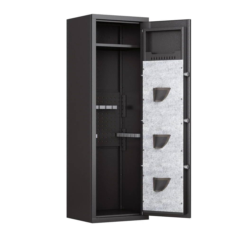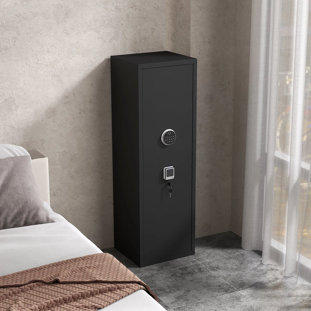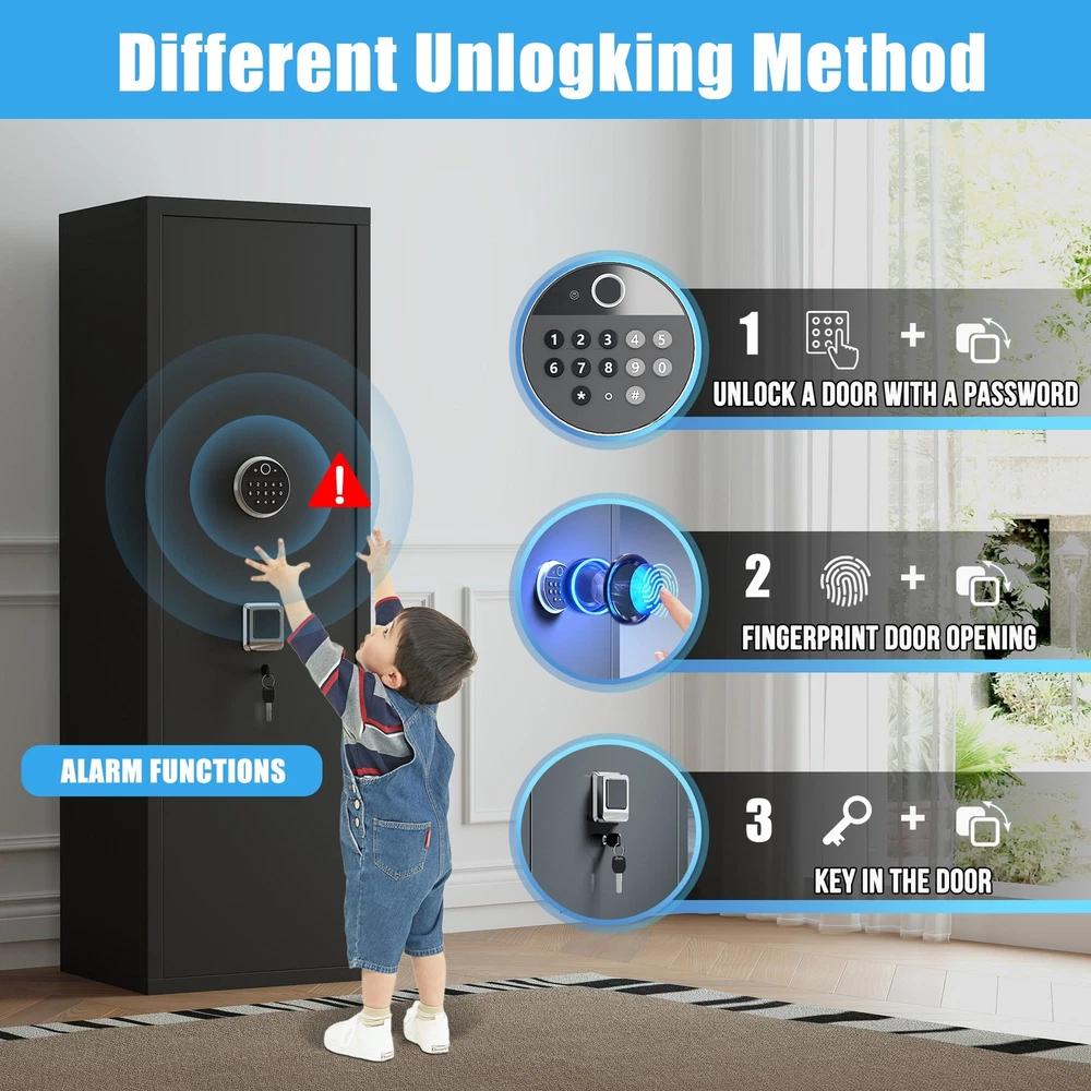 Specifications Place of Origin China Main Color Black Main Material Metal Filler Metal Product Style Classic Use Case Primary Living Space Dangerous Goods #dangerFlag# Dimensions & Weights Assembled Length (in.) 17.71 Assembled Width (in.) 15.74 Assembled Height (in.) 55.10 Weight (lbs) 77.38 Product Features Our gun cabinets have three ways of unlocking:1.Fingerprint unlocking 2.Password unlock 3.Key unlocking , preventing unwanted guests from accessing your firearms and valuables. High quality materials, the gun cabinet is made of thickened steel and has a pry alarm function. The gun cabinet is simple and beautiful, with flannelette, which can prevent the wear and tear of firearms or valuables items. The multi-purpose rifle safe is equipped with a detachable gun rack inside, which can be adjusted and arranged according to the length of the rifle. The safe door comes with ammunition storage and three handgun organizer pockets to help you save more storage space. Easy to install, we are equipped with detailed installation instructions for quick and accurate installation completion. Description