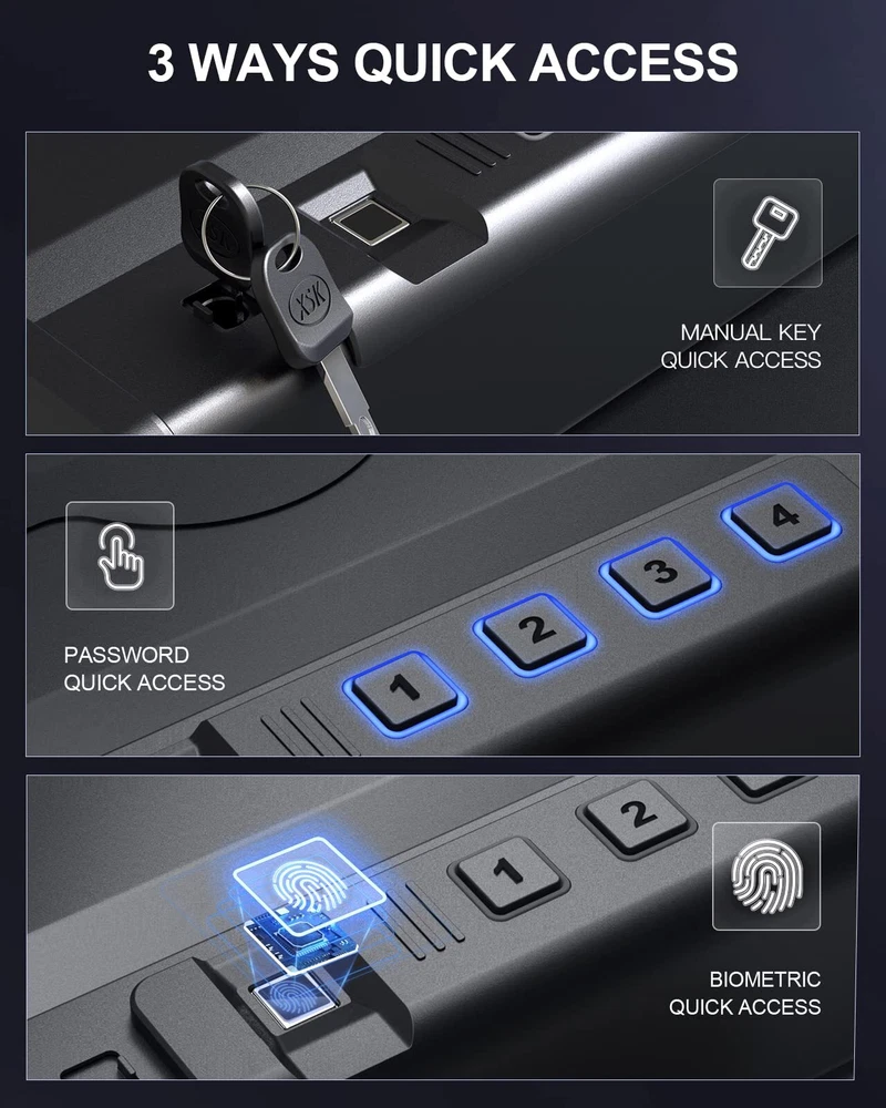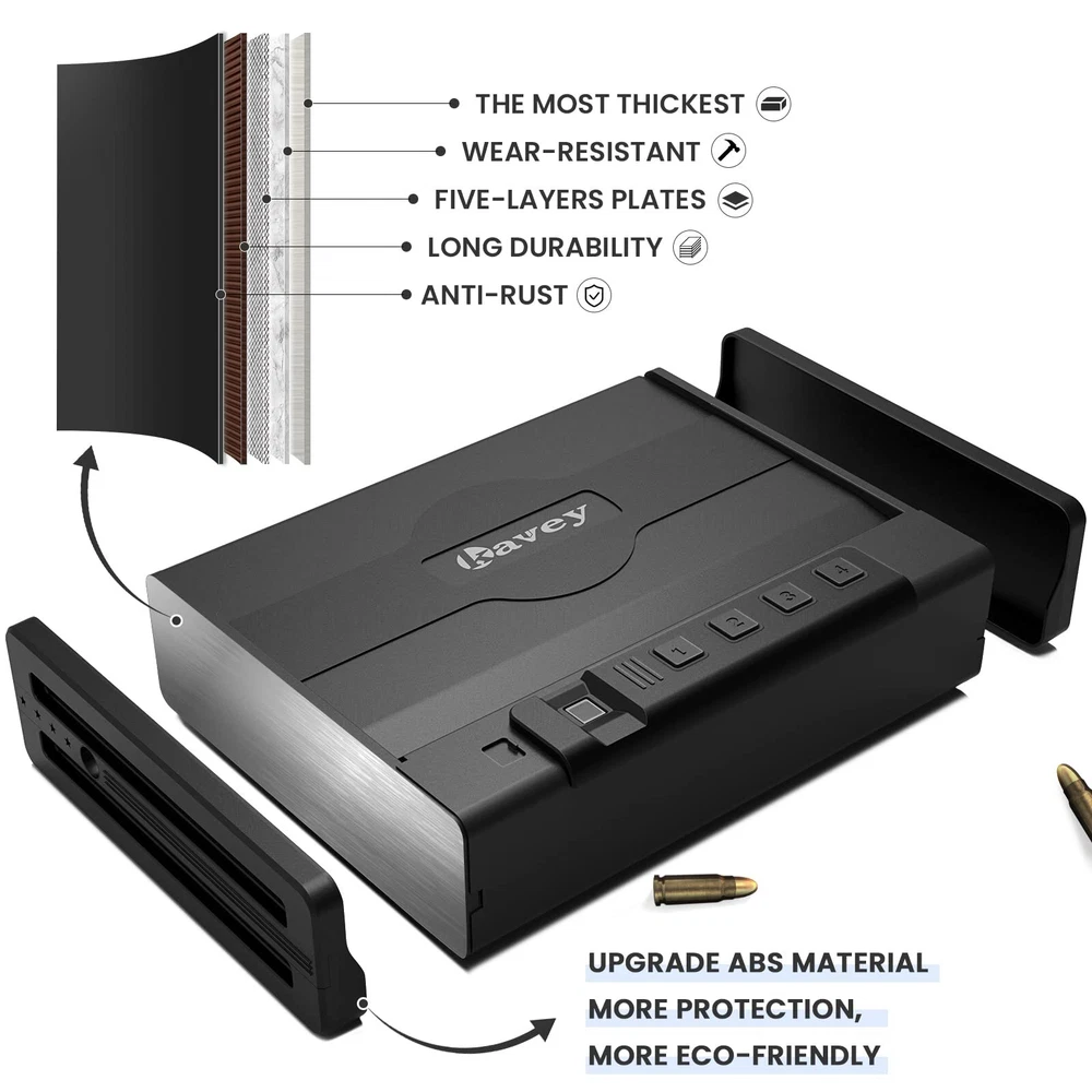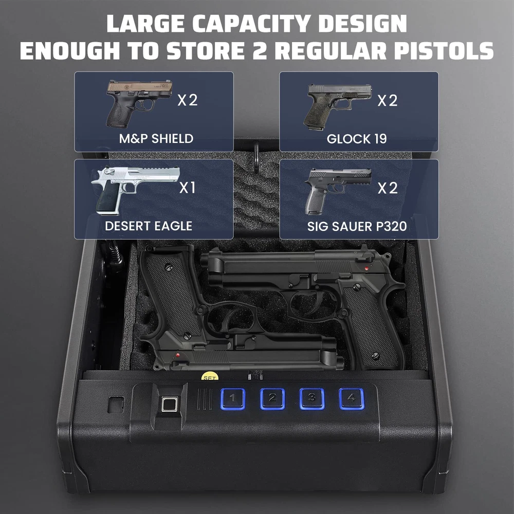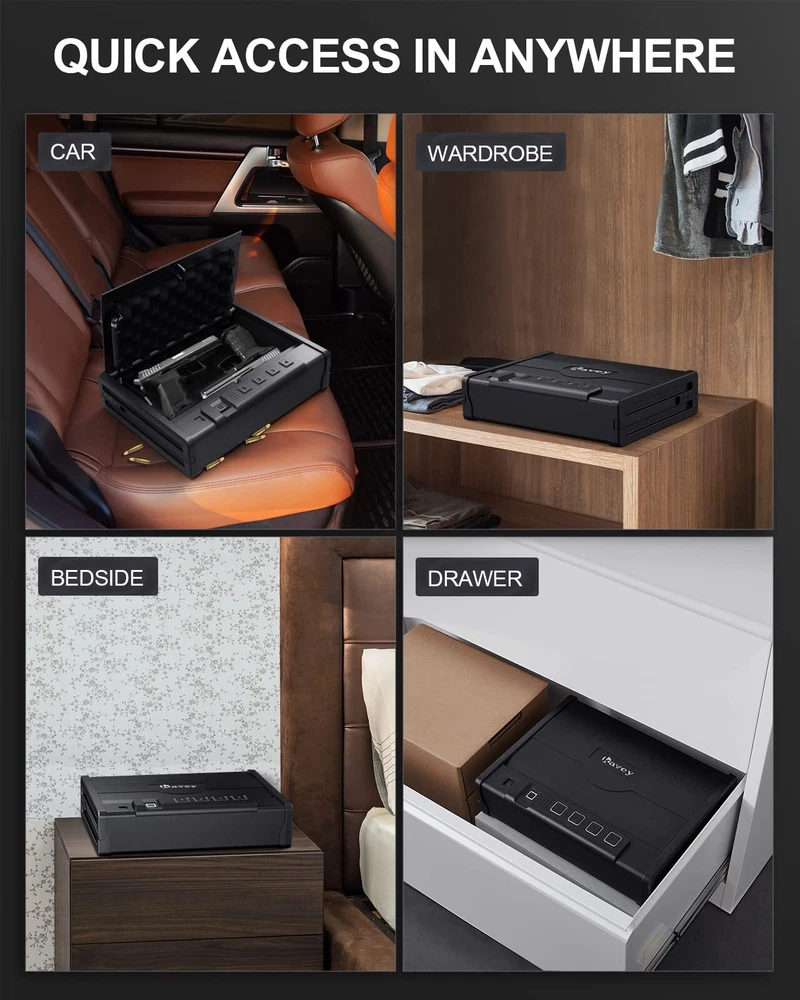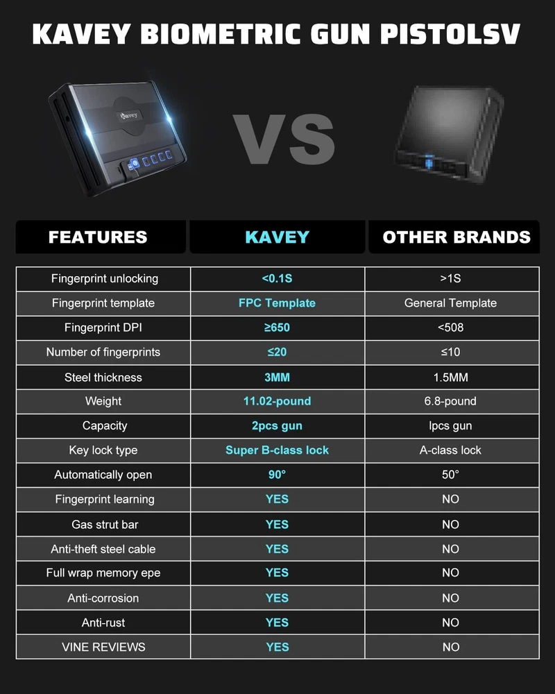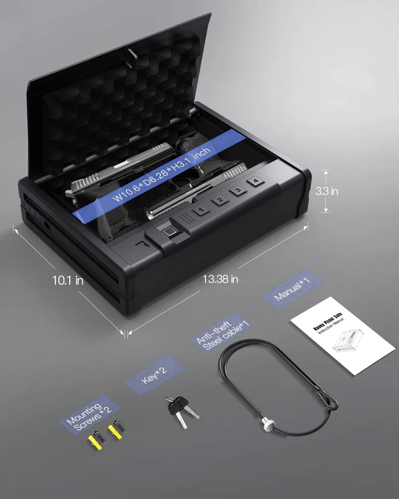 Kavey Biometric Pistols Safe, Quick-Access Fingerprint Handgun Safe for 2 Pistols with Backlit Digital Keypad, Mute Mode, Auto-open Pistol Safe for Home Nightstand Bedside Car ✓ Free 30 Day Returns ✓ Free Shipping 【UNBREAKABLE CONSTRUCTION】The Kavey pistol safe is made of solid steel material with a 1.5mm thick body and a 3mm thick door panel, making any forced break-in impossible. Unlike plastic locking hooks, this handgun safe uses all-steel locking hooks that can resist knife penetration, tool cutting, and prying bar impact. In addition to the all-steel body, the safe also features an anti-slip design handle for both safety and practicality. 【DESIGN PATENT】Kavey handgun safe hired a professional American designer to investigate the preferences of American gun users. Combining solid steel plates, the final design resembles a belt that symbolizes strength, which is protected by a US design patent. We hope our design can reinforce your safety and truly protect you and your family at all times. 【LARGER CAPACITY】The pistol safe has a larger and deeper capacity than similar pistol safe, accommodating not only two standard-sized handguns such as Glock 19 and Sig Sauer, but also larger handguns such as Desert Eagle. It is also suitable for storing other valuables such as jewelry, documents, and cash. The interior is spacious enough to accommodate various items. 【INSTANT ACCESS AND COMPLETE PROTECTION】In an emergency, every second counts. The Kavey pistol safe uses advanced semiconductor fingerprint technology that can identify authorized users within 0.1 seconds, enabling you to quickly respond to emergencies and access your firearms. Equipped with anti-theft and anti-tampering fingerprint systems, unauthorized access is prevented to ensure your handgun is always secure. 【SILENT OPERATION】 Kavey handgun safe features a built-in LED light that provides clear visibility even in low light conditions. Additionally, you can mute the keypad and fingerprint scanner for silent operation, ensuring you can access your pistol without alerting anyone nearby. 【MULTIPLE ACCESS OPTIONS】This pistol safe offers three ways to access your firearms: an upgraded fingerprint recognition handgun safe that can unlock in 0.1 seconds with a capacity of 20 fingerprints, allowing for sharing among family members. You can also set a 4-6 digit password using the electronic keypad. Additionally, an emergency key can be used for daily access, providing multiple instant access options. 【COMPLETE ACCESSORIES】Kavey is a professional seller of pistol safe. The safe includes - 2*emergency keys, 2*expansion screws, 1*steel cable, 1*manual. Moreover, we provide 24/7 online customer service, key service, and a 90-day unconditional return policy. Shipping We offer FREE shipping on all orders! Under normal circumstances, we try to ship all orders within three business days of payment, normally sooner. We use a selection of shipping services such as TBA, UPS, FedEx, USPS, etc We only ship to the lower 48 states, we do not ship to Alaska/Hawaii, US Protectorates, Puerto Rico, and PO Boxes. Local pickups and combined shipping options are not available at this time. Returns Although we strive for 100% order fulfillment accuracy, mistakes happen. Please allow us the opportunity to correct any error before leaving us negative feedback. We are confident in our products, but if you are not fully satisfied with your order, don't hesitate to get in touch with us within 30 days of purchase, and we will send you a return label. Once the item is returned we will issue you a full refund. The product must be returned in the original item's box, and in the same condition as you received it. Payment We accept payment only on eBay Payments (We accept all kinds of credit cards) Please pay as soon as possible after winning an auction, this will allow us to ship your item sooner! Feedback Customer satisfaction is our number one priority. If you have any problems with your order, don't hesitate to get in touch with us and we will do our best to meet your needs. Contact Us If you have any questions, please don't hesitate to contact us. Please allow us 24 hours to respond, although normally we respond sooner. Please visit our eBay store to check out other items for sale! Thank you for shopping at our store.