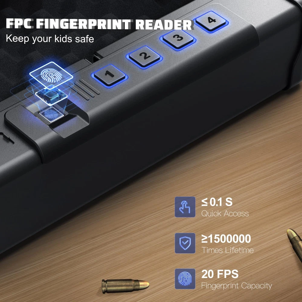 Kavey Biometric Pistols Safe, Quick-Access Fingerprint Handgun Safe for 2 Pistols with Backlit Digital Keypad, Mute Mode, Auto-open Pistol Safe for Home Nightstand Bedside Car ✓ Free 30 Day Returns ✓ Free Shipping 【UNBREAKABLE CONSTRUCTION】The Kavey pistol safe is made of solid steel material with a 1.5mm thick body and a 3mm thick door panel, making any forced break-in impossible. Unlike plastic locking hooks, this handgun safe uses all-steel locking hooks that can resist knife penetration, tool cutting, and prying bar impact. In addition to the all-steel body, the safe also features an anti-slip design handle for both safety and practicality. 【DESIGN PATENT】Kavey handgun safe hired a professional American designer to investigate the preferences of American gun users. Combining solid steel plates, the final design resembles a belt that symbolizes strength, which is protected by a US design patent. We hope our design can reinforce your safety and truly protect you and your family at all times. 【LARGER CAPACITY】The pistol safe has a larger and deeper capacity than similar pistol safe, accommodating not only two standard-sized handguns such as Glock 19 and Sig Sauer, but also larger handguns such as Desert Eagle. It is also suitable for storing other valuables such as jewelry, documents, and cash. The interior is spacious enough to accommodate various items. 【INSTANT ACCESS AND COMPLETE PROTECTION】In an emergency, every second counts. The Kavey pistol safe uses advanced semiconductor fingerprint technology that can identify authorized users within 0.1 seconds, enabling you to quickly respond to emergencies and access your firearms. Equipped with anti-theft and anti-tampering fingerprint systems, unauthorized access is prevented to ensure your handgun is always secure. 【SILENT OPERATION】 Kavey handgun safe features a built-in LED light that provides clear visibility even in low light conditions. Additionally, you can mute the keypad and fingerprint scanner for silent operation, ensuring you can access your pistol without alerting anyone nearby. 【MULTIPLE ACCESS OPTIONS】This pistol safe offers three ways to access your firearms: an upgraded fingerprint recognition handgun safe that can unlock in 0.1 seconds with a capacity of 20 fingerprints, allowing for sharing among family members. You can also set a 4-6 digit password using the electronic keypad. Additionally, an emergency key can be used for daily access, providing multiple instant access options. 【COMPLETE ACCESSORIES】Kavey is a professional seller of pistol safe. The safe includes - 2*emergency keys, 2*expansion screws, 1*steel cable, 1*manual. Moreover, we provide 24/7 online customer service, key service, and a 90-day unconditional return policy. Shipping We offer FREE shipping on all orders! Under normal circumstances, we try to ship all orders within three business days of payment, normally sooner. We use a selection of shipping services such as TBA, UPS, FedEx, USPS, etc We only ship to the lower 48 states, we do not ship to Alaska/Hawaii, US Protectorates, Puerto Rico, and PO Boxes. Local pickups and combined shipping options are not available at this time. Returns Although we strive for 100% order fulfillment accuracy, mistakes happen. Please allow us the opportunity to correct any error before leaving us negative feedback. We are confident in our products, but if you are not fully satisfied with your order, don't hesitate to get in touch with us within 30 days of purchase, and we will send you a return label. Once the item is returned we will issue you a full refund. The product must be returned in the original item's box, and in the same condition as you received it. Payment We accept payment only on eBay Payments (We accept all kinds of credit cards) Please pay as soon as possible after winning an auction, this will allow us to ship your item sooner! Feedback Customer satisfaction is our number one priority. If you have any problems with your order, don't hesitate to get in touch with us and we will do our best to meet your needs. Contact Us If you have any questions, please don't hesitate to contact us. Please allow us 24 hours to respond, although normally we respond sooner. Please visit our eBay store to check out other items for sale! Thank you for shopping at our store.