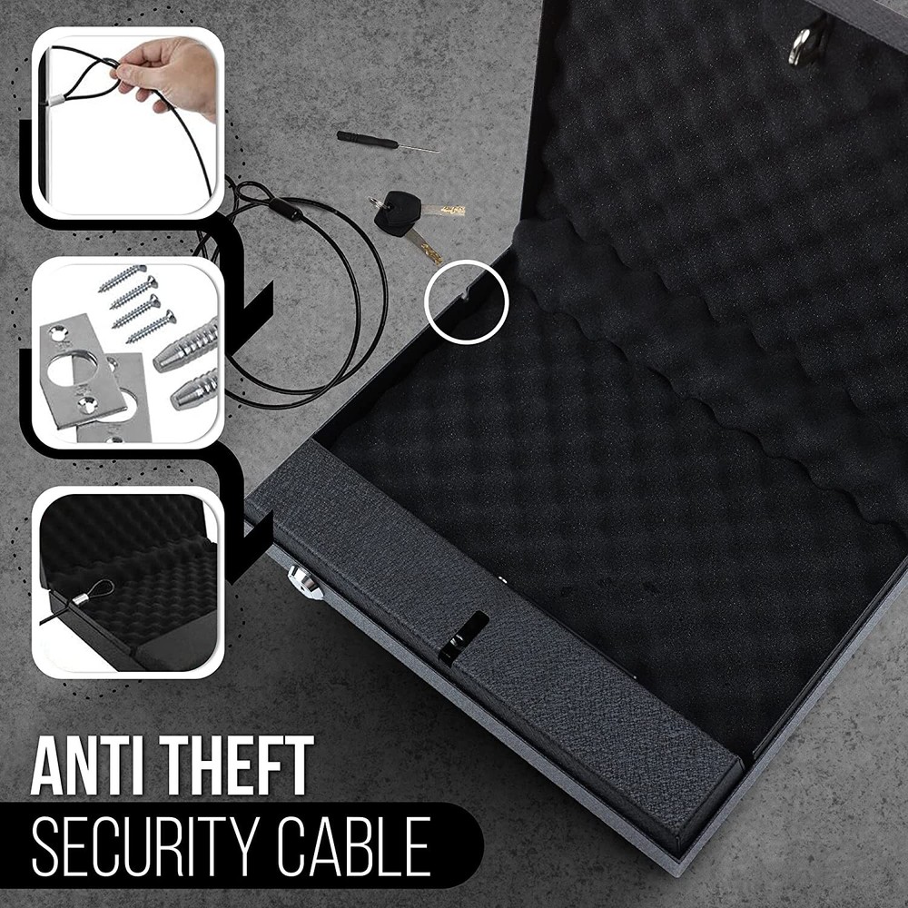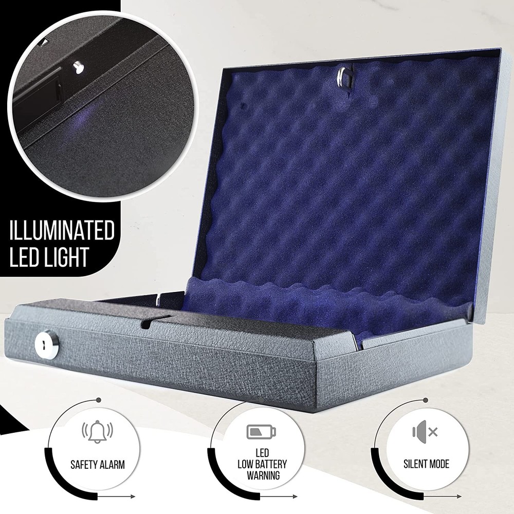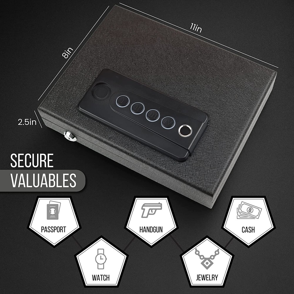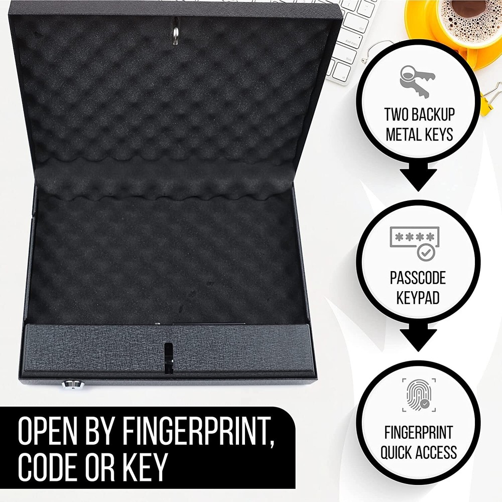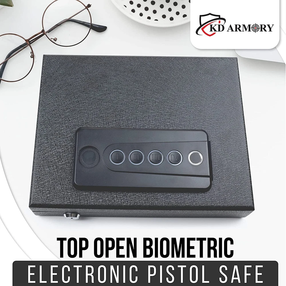 This biometric gun safe is the perfect solution for securely storing your firearm. With a 3-point quick access design, you can easily get to your gun without any hassle. The safe is manufactured by KD ARMORY and it can be stored in drawers, in vehicles, under desks or on walls . It is a portable security lock box that is ideal for gun owners who want to keep their firearm safe and secure from anyone that does not understand the potential danger of firearms. Passports, pistols, cash, watches, and jewelry can be stored in this Safe. Whether you are going on a hunting trip or just want to keep your gun at home, this biometric gun safe is the perfect solution. Feature: Fingerprint/Code/Key Button backlight & LED light interior Low battery indication Silence on/off Back-up key Portable & Solid Steel Anchor holes & Cable lock Specification: Brand: KD ARMORY Unlock method: Biometric Fingerprint Material: Steel Color: Black Type: Handgun Safe Exterior Dimensions 11.00"x8.5x2" Interior Dimensions 11.00"x6.25"x2.5" Item Weight 6.14 LBS Package Included: 1 x Firearm Safety Device 2 x Manual Keys 1 x Owner's Manual 1 x Anchor Bolts for Mounting Requirements for Battery: 4 NEW AA Alkaline Batteries (not included in the box)