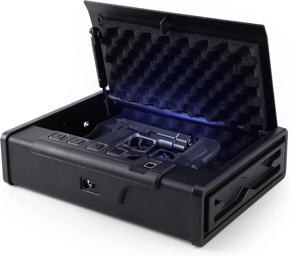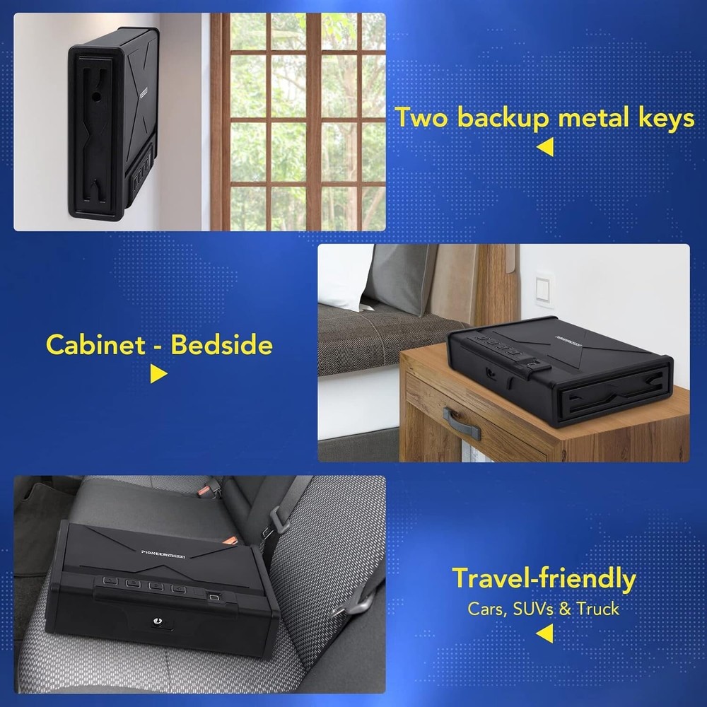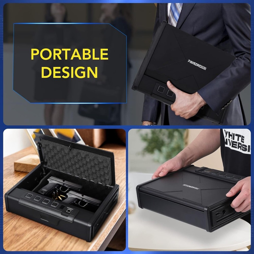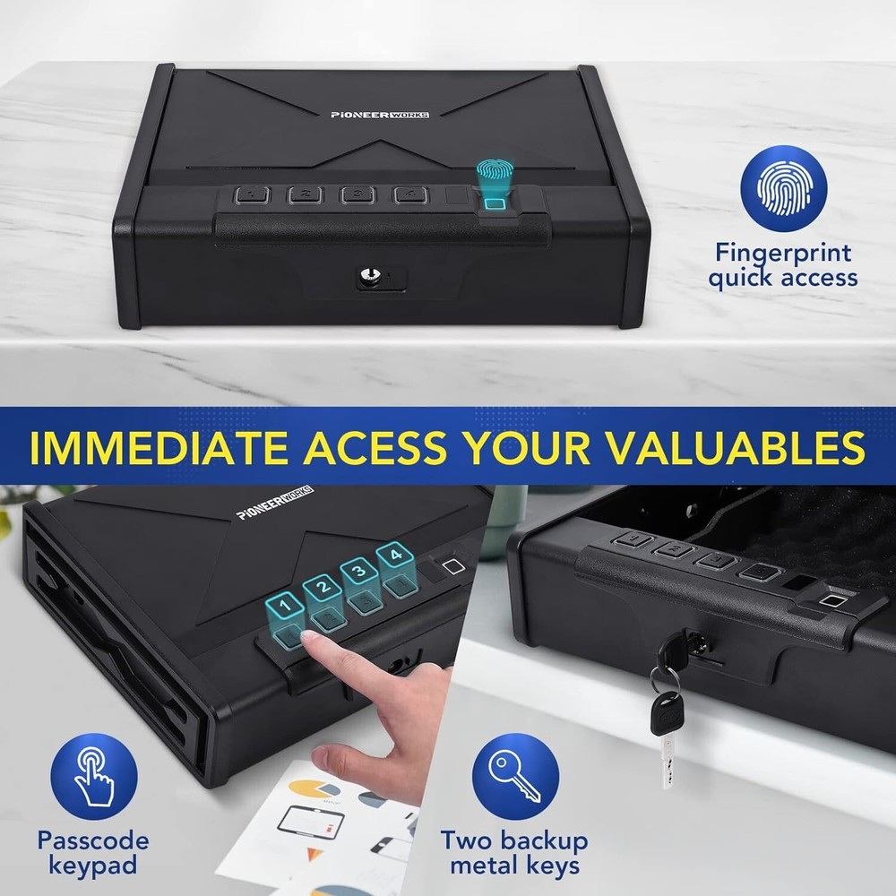 OPEN BOX NEVER USED Biometric Gun Safes, Quick Access Gun Lock Boxwith Fingerprint & Digital Keypad, Handgun Safe with Auto Open Lid, BedsideFirearm Safety Car Safe Brand PioneerWorks Product Dimensions 15.98"D x 5.43"W x 12.56"H Lock Type Electronic, Key Capacity 5 Liters Material Stainless Steel Special Feature Portable Mounting Type Freestanding, Tabletop Included Components 1 x Steel Cable, 1 x User Manual, 2 x Pairs of Bolts, 1 x Handgun Safe, 2 x Backup Keys Item Weight 11.66 Pounds Alarm anti theft Aboutthis item · Alloy Steel · Sturdy and Distinctive: This is the customized uniquesafe for our customers. The special lid design has empowered the strength ofthe safe, just like a shield that can protect your valuables and family. safeis made of solid steel construction with good fit and finish. It can keep yourvaluables or firearms from unwanted touch or visit and is sturdy enough todeter any smash and grab type thefts. · Safe and Versatile: Safety is of most importance.biometric safe is easy to use and convenient to carry, offering you the bestsecurity all the time. You can keep this safe in your nightstand drawer, car,cabinet, luggage, or under the bed. It's suitable for traveling with and can bemounted in the car, bringing you more safety when you're on an adventure. · Biometric Locks and Mute Mode: Quick-accessfingerprint technology allows for reaching within 1s, which can save you moretime when you're in danger. safe can hold up to 30 fingerprints for multipleusers. Apart from the biometric option, our safe also supports keypad locks andoffers 2 backup override keys. · High Capacity and Added protection: There is enoughspace to store two standard size or many small items in biometric safe. Theinterior is fully padded with soft foam to prevent scratches. You can use thesteel cable to secure the safe to furniture or mount it on the table by usingthe provided screws. Protect Your Safety: We arecommitted to satisfying our customers with quality products and great customerservice. If you have any concerns, please feel free to contact us directly. We'rededicated to giving you a satisfactory solution.